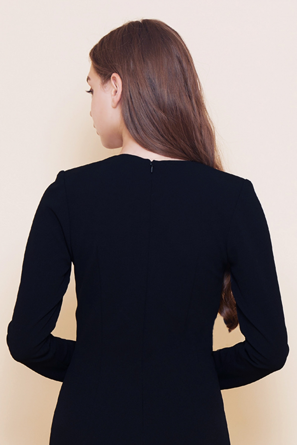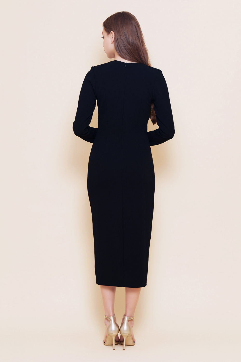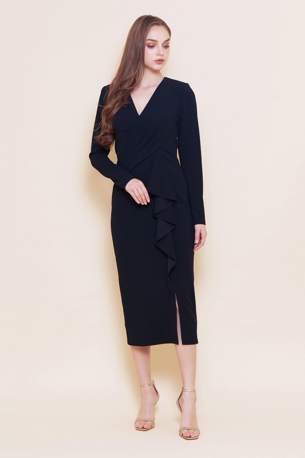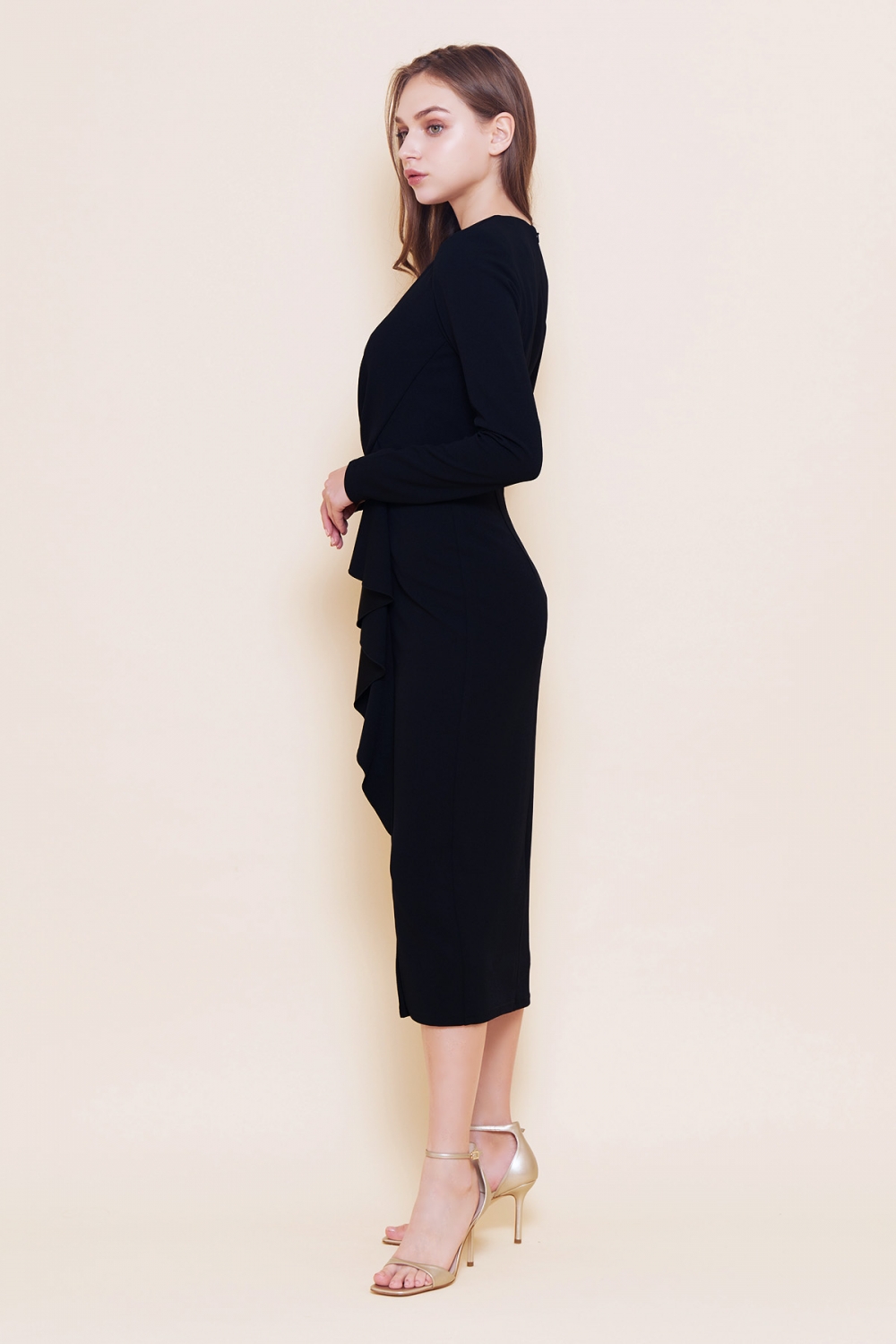 着心地の良いクレープジャージーのミモレ丈ドレス。ウェスト部分に入れられたドレープはウェストを細く見せる効果があり、流れるようにウェストからスカート部分に配置されたラッフルは、縦のラインを強調し、スタイルアップが叶います。オフィスにも、ランチやディナーそして結婚式やパーティーなど合わせるアクセサリーやバッグを変えれば、様々なオケージョンでご着用いただけます。