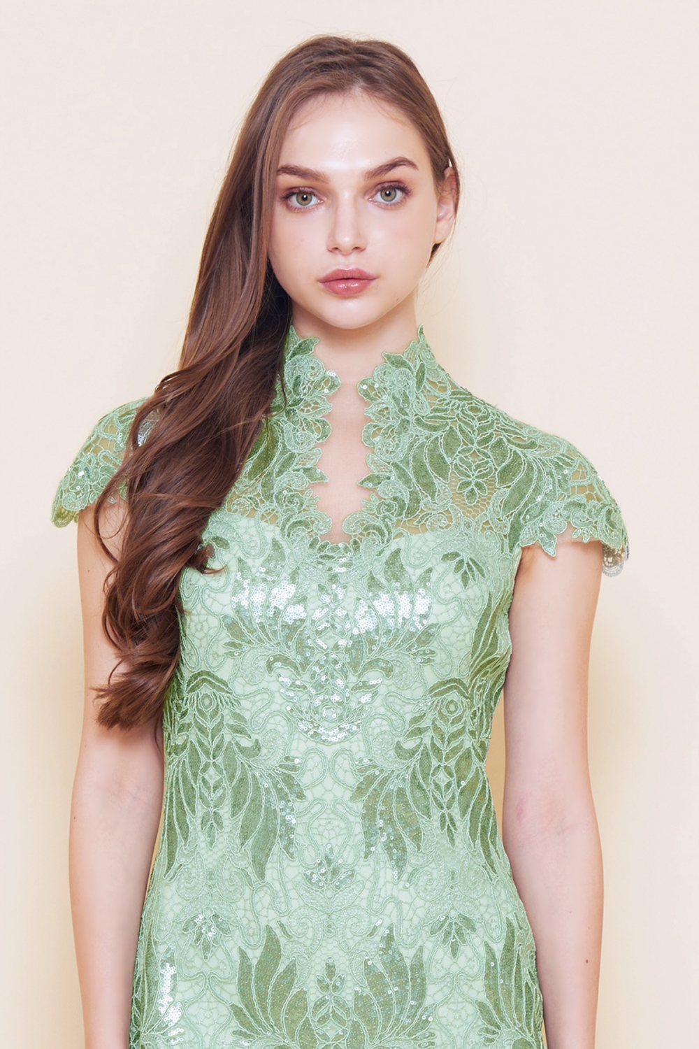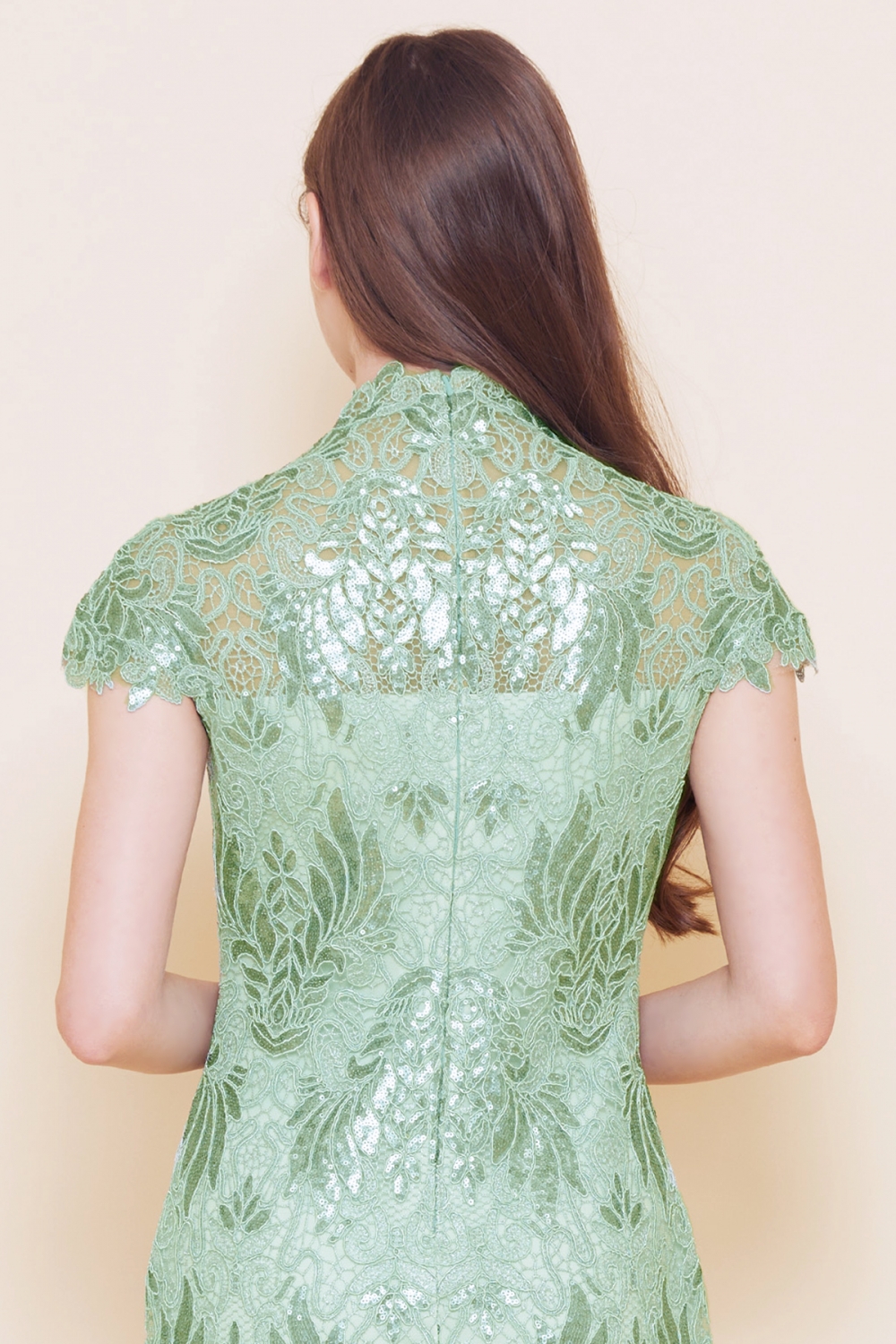 スパンコール刺繍が美しいキーホールネックが特徴的なミディアムドレス。スパンコールの輝きで、明るく華やかな印象。特別な場面やパーティーでの存在感を際立たせることでしょう。キーホール部分の裏にはヌードカラーのチュールが配置されているため、襟元が下がる心配がなく、美しいネックラインを保持できます。