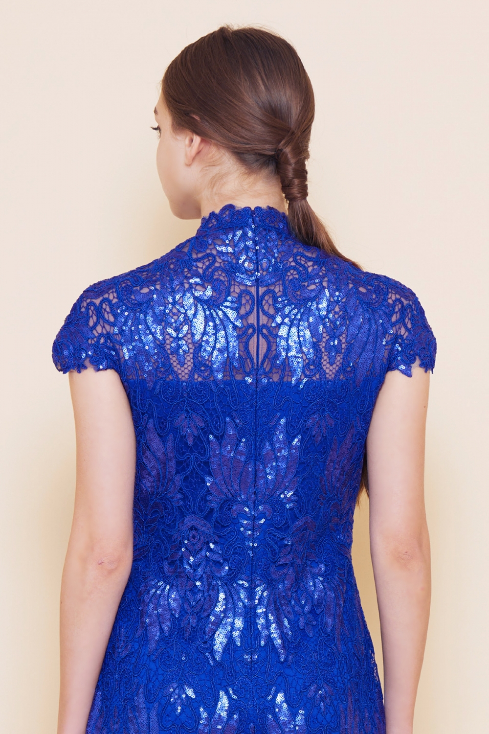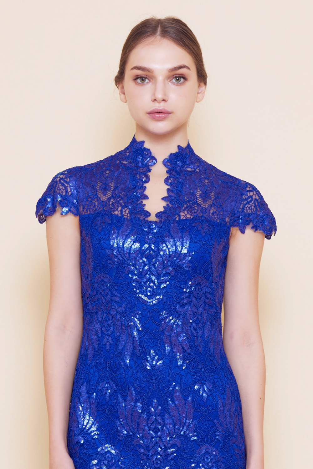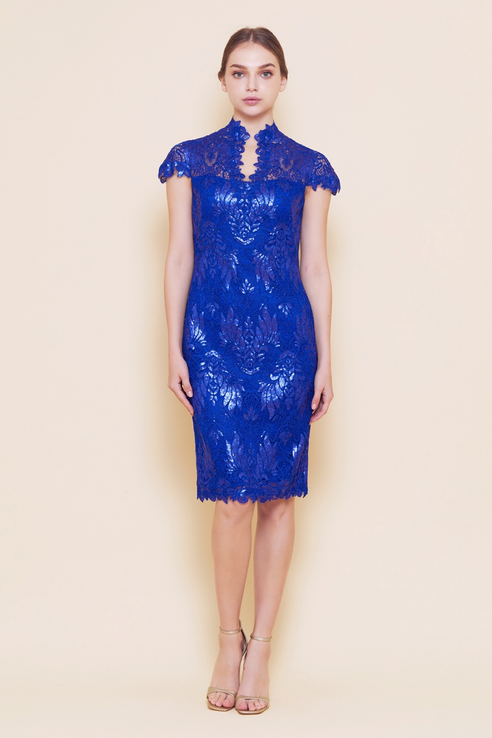 スパンコール刺繍が美しいキーホールネックが特徴的なミディアムドレス。スパンコールの輝きで、明るく華やかな印象。特別な場面やパーティーでの存在感を際立たせることでしょう。キーホール部分の裏にはヌードカラーのチュールが配置されているため、襟元が下がる心配がなく、美しいネックラインを保持できます。