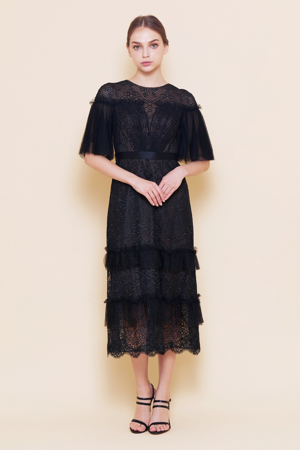 トップには、美しい刺繍レースに柔らかなプリーツチュールを組み合わせ、ふんわりした袖をあしらいロマンチックな雰囲気。ミモレ丈のスカート部分には程よい透け感があり、上品でありながら華やかです。パーティーはもちろん、結婚式などのフォーマルな席にもご着用いただけます。 モデルサイズ 身長168cm B:82cm W:60cm H:88cm /サイズ0着用 ■新作商品一覧はこちら■ □ミディアムドレス一覧はこちら□ ■デイリードレス一覧はこちら■ □ブラックの商品一覧はこちら□