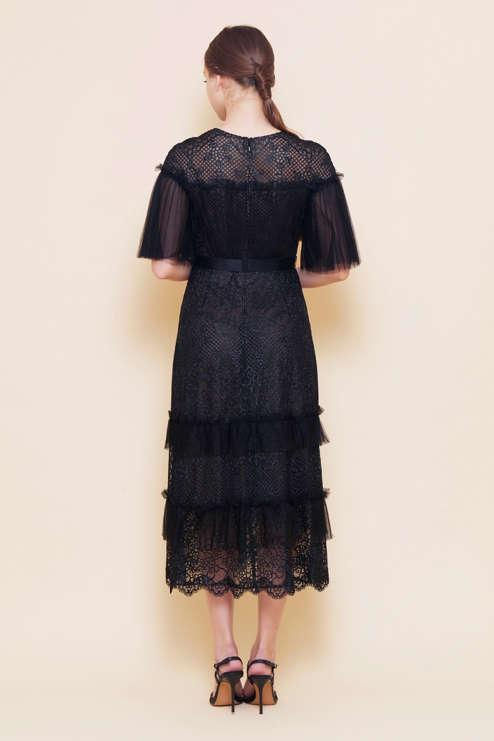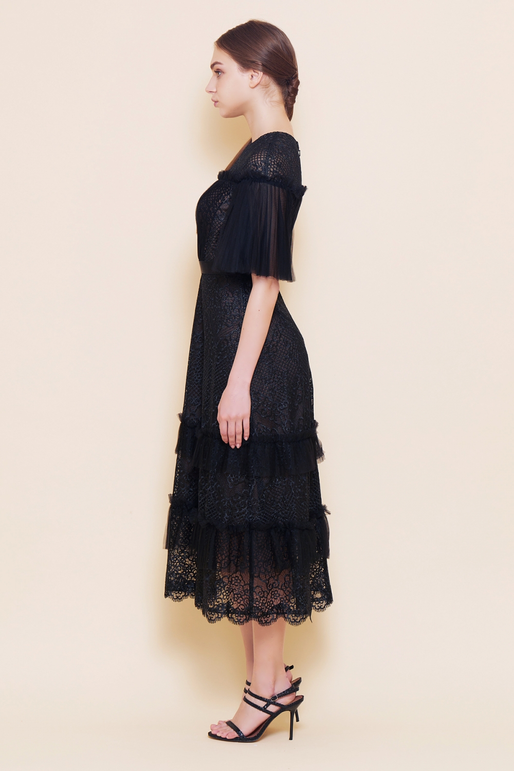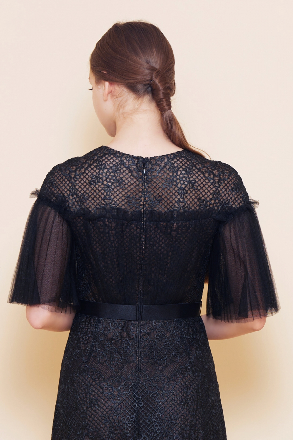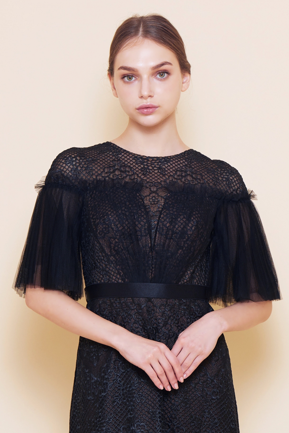 トップには、美しい刺繍レースに柔らかなプリーツチュールを組み合わせ、ふんわりした袖をあしらいロマンチックな雰囲気。ミモレ丈のスカート部分には程よい透け感があり、上品でありながら華やかです。パーティーはもちろん、結婚式などのフォーマルな席にもご着用いただけます。