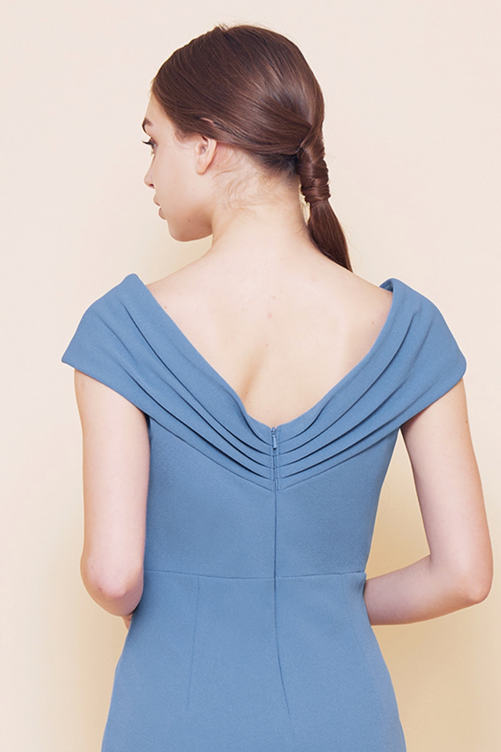 柔らかなブルーが印象的なミディアムドレス。鎖骨を美しく見せるVネックラインに肩を華奢に見せるキャップスリーブ、ドレープが施されたボディに足が長く見えるハイウエストライン。たくさんのテクニックを詰め込んだ、スタイルアップが叶う一着です。