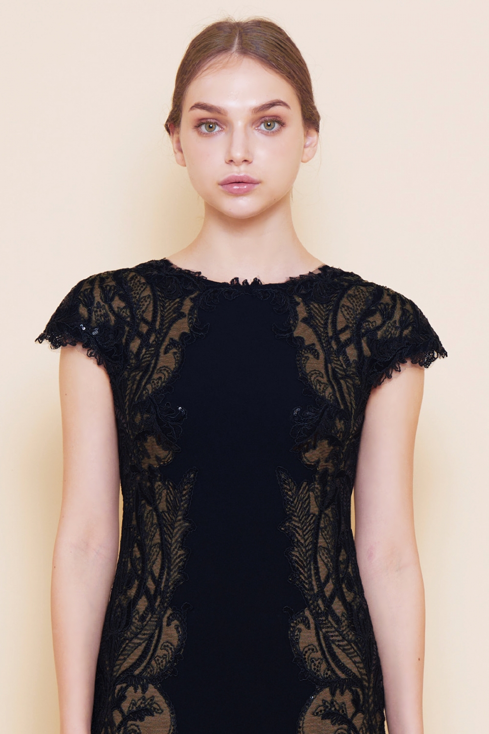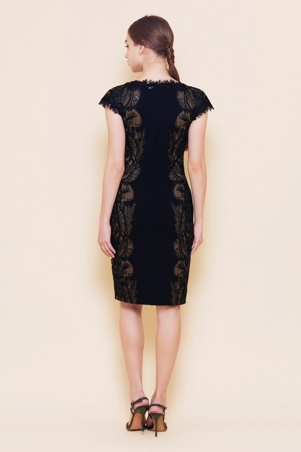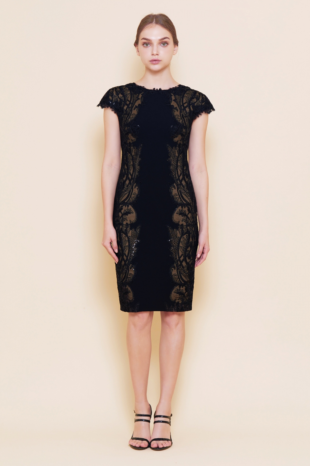 ボディーの両サイドを飾るスパンコール刺繍が美しいミディアムドレス。クレープジャージーの生地で、Tシャツのような着心地です。派手過ぎず、なおかつ華やかで、ディナーやランチ、フォーマルな席にもオールマイティーに活躍する一着です。