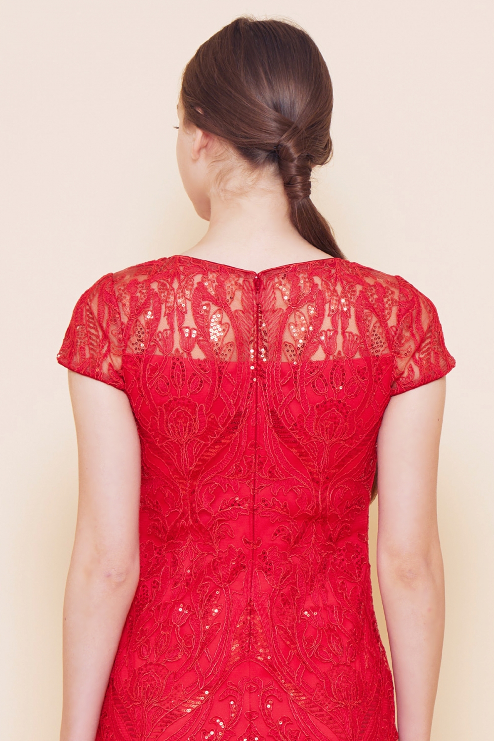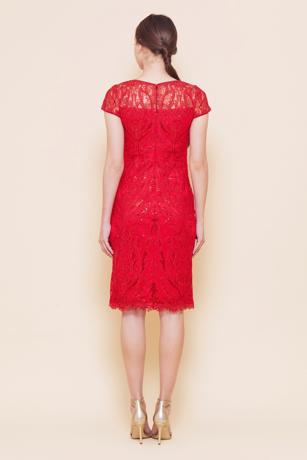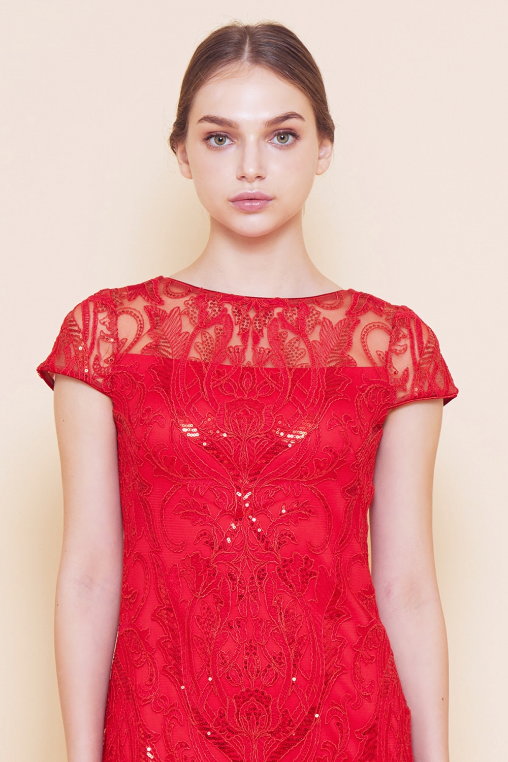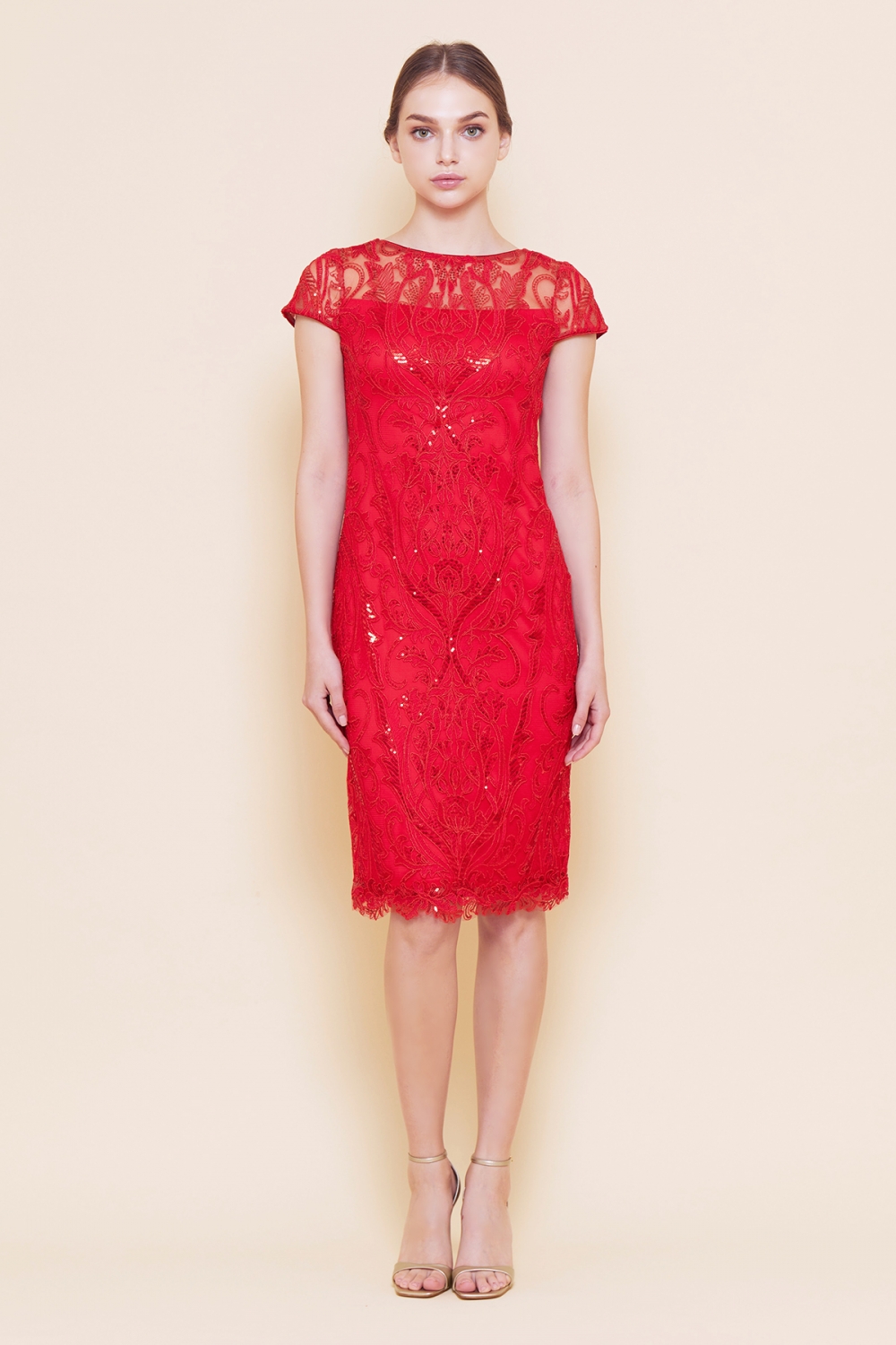 立体感のある繊細なコードレースにスパンコールの輝きをプラスした、上品な刺繍が特徴的なドレス。首元をすっきり見せてくれるボートネックに、二の腕をほっそり見せてくれるキャップスリーブ、シンプルなスタイルながらTADASHI SHOJIのテクニックを詰め込んだ一着です。