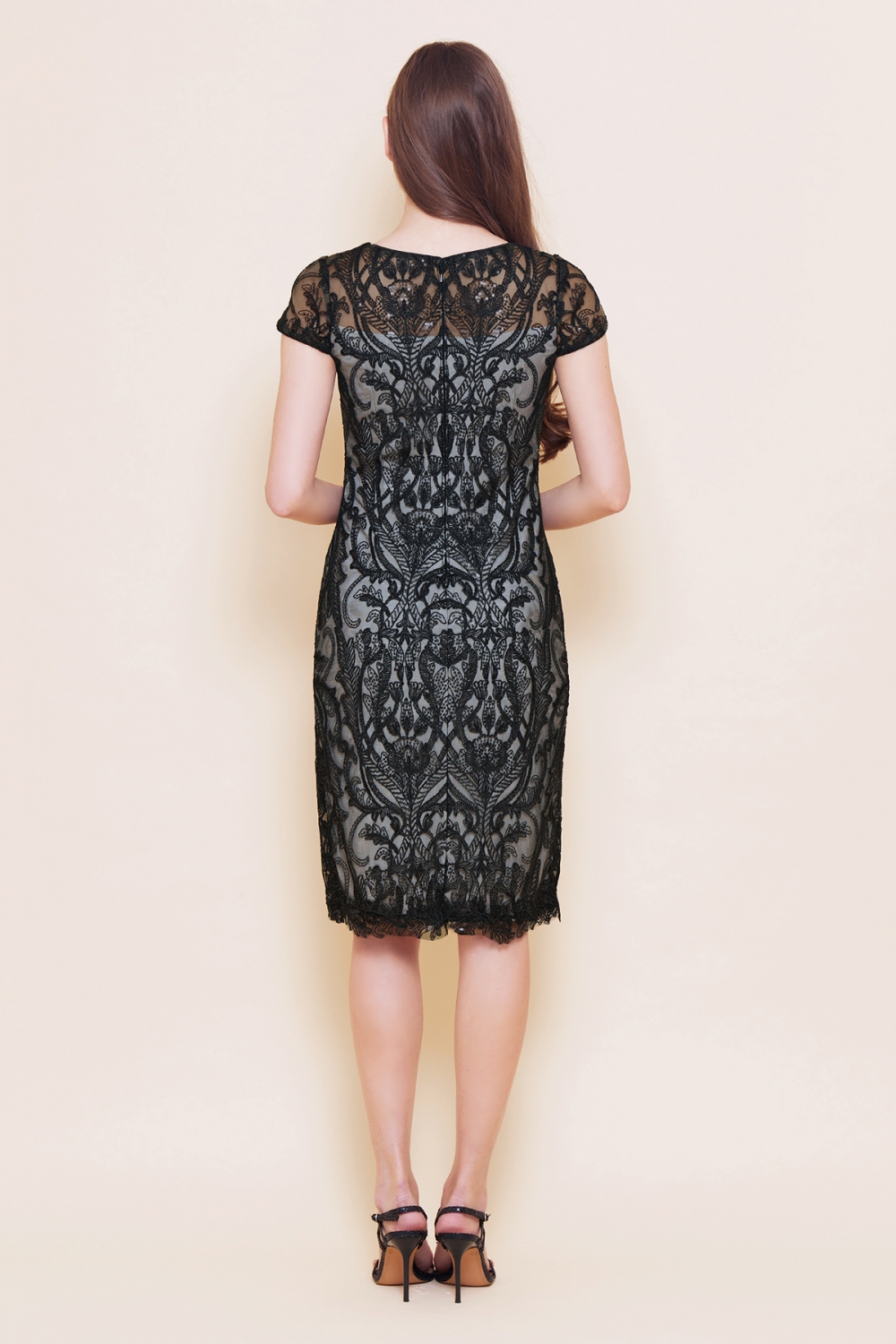 立体感のある繊細なコードレースにスパンコールの輝きをプラスした、上品な刺繍が特徴的なドレス。首元をすっきり見せてくれるボートネックに、二の腕をほっそり見せてくれるキャップスリーブ、シンプルなスタイルながらTADASHI SHOJIのテクニックを詰め込んだ一着です。