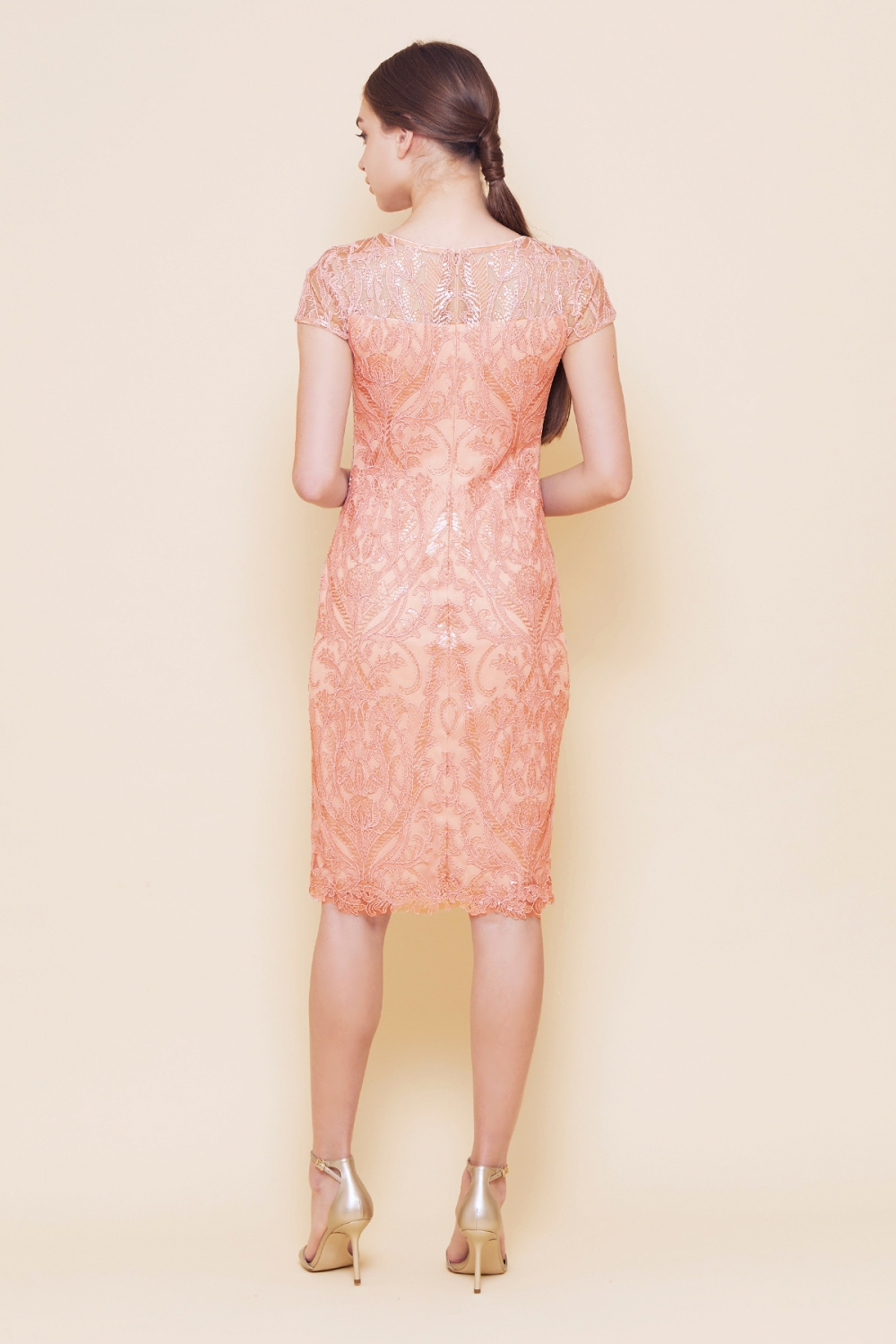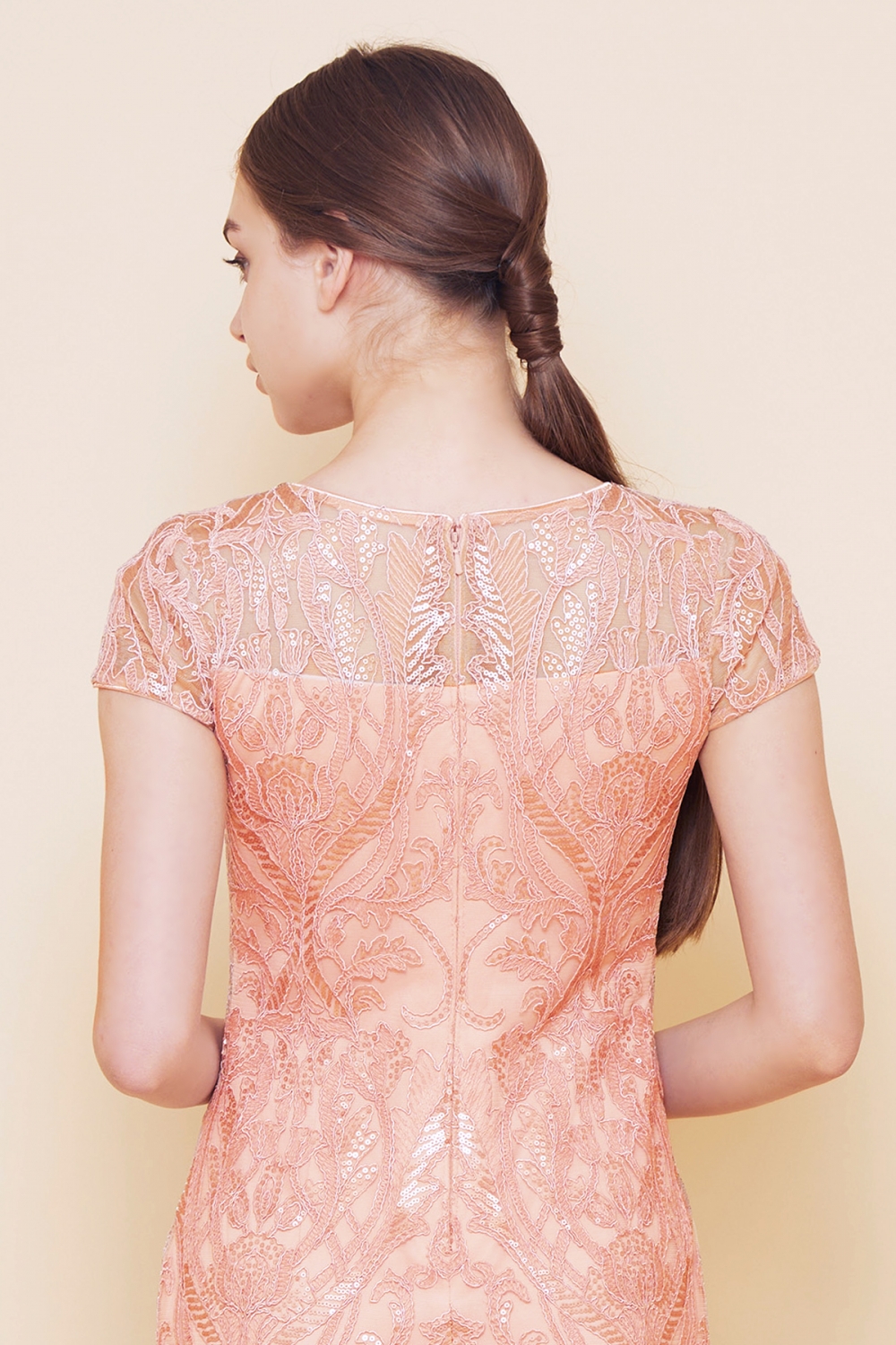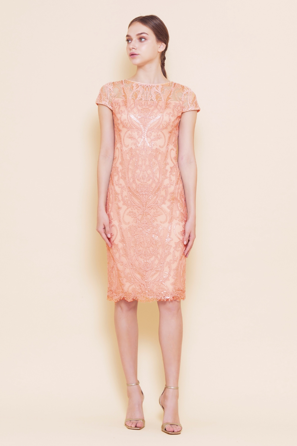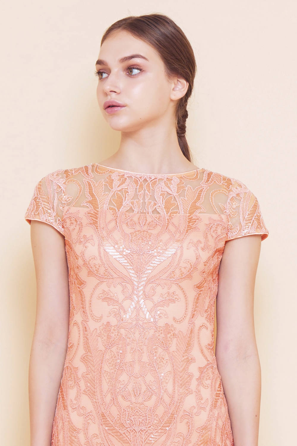 立体感のある繊細なコードレースにスパンコールの輝きをプラスした、上品な刺繍が特徴的なドレス。首元をすっきり見せてくれるボートネックに、二の腕をほっそり見せてくれるキャップスリーブ、シンプルなスタイルながらTADASHI SHOJIのテクニックを詰め込んだ一着です。