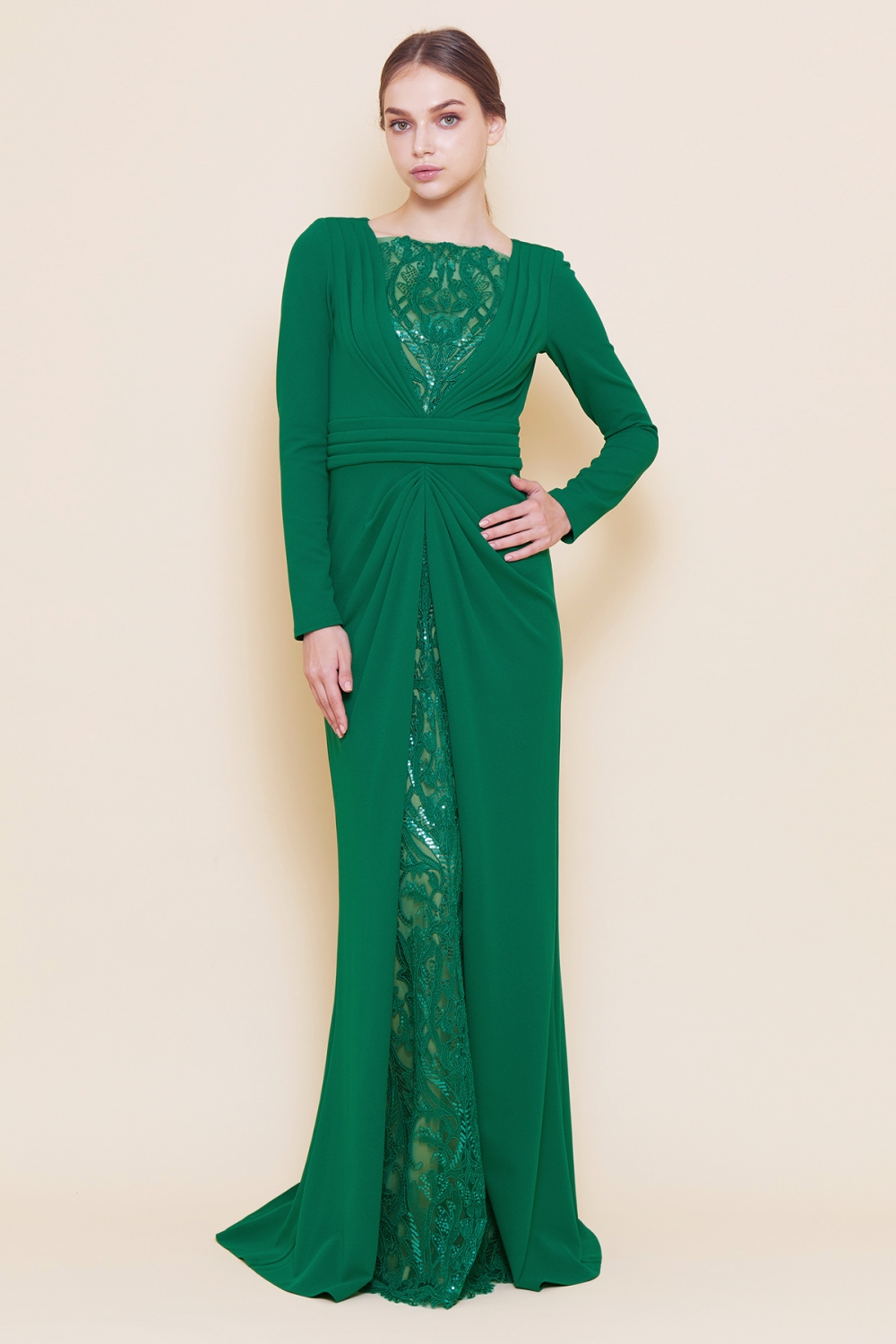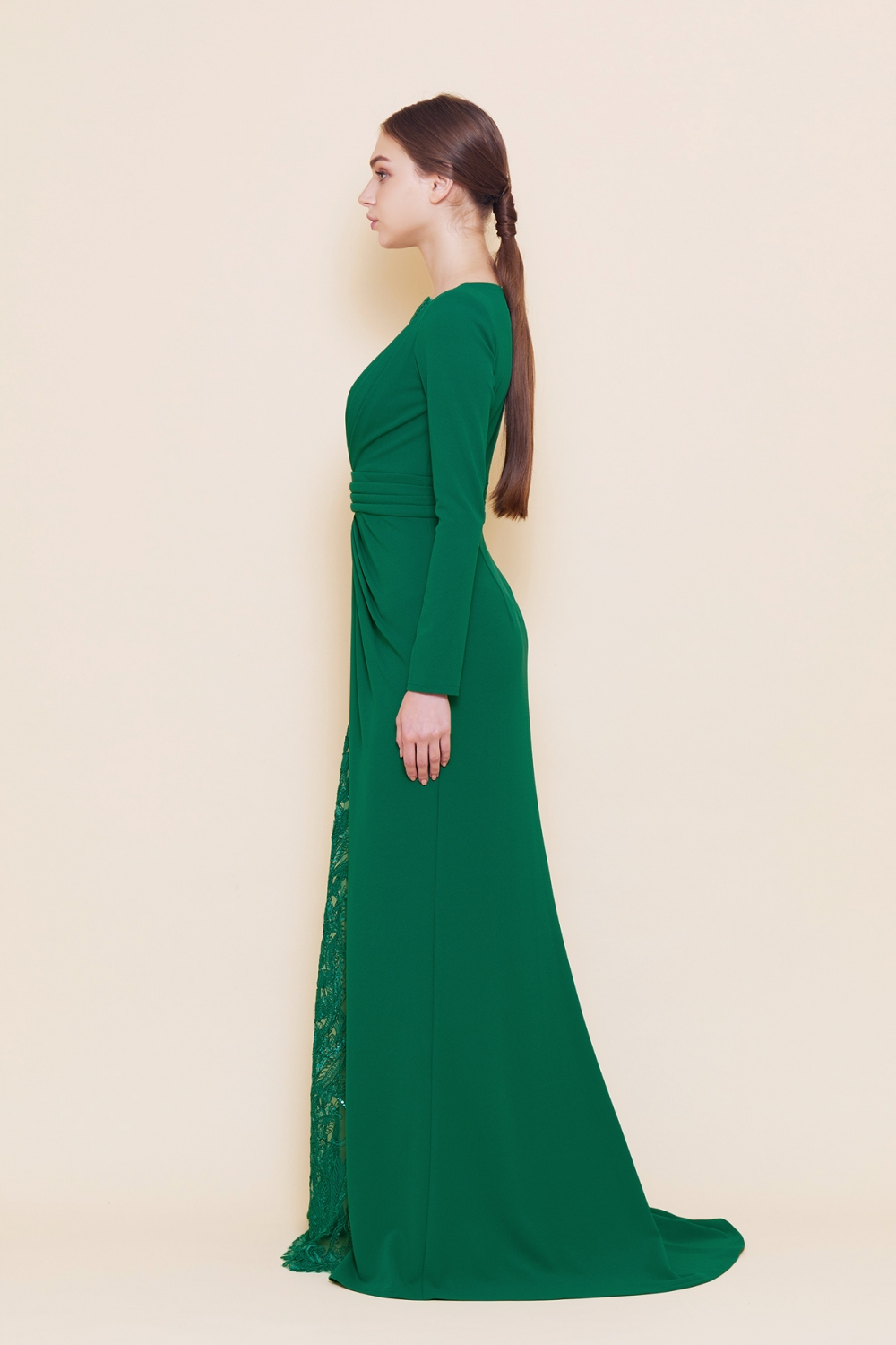 着心地の良いクレープジャージーのロングドレス。肩からウェストまで流れるように配置したプリーツが、ウェストのプリーツへと続き、上半身をすっきりと見せ、スカート部分のドレープが腰回りを優しく包みます。フロント部分にはスパンコールで装飾したコードレースがエレガントに輝きます。