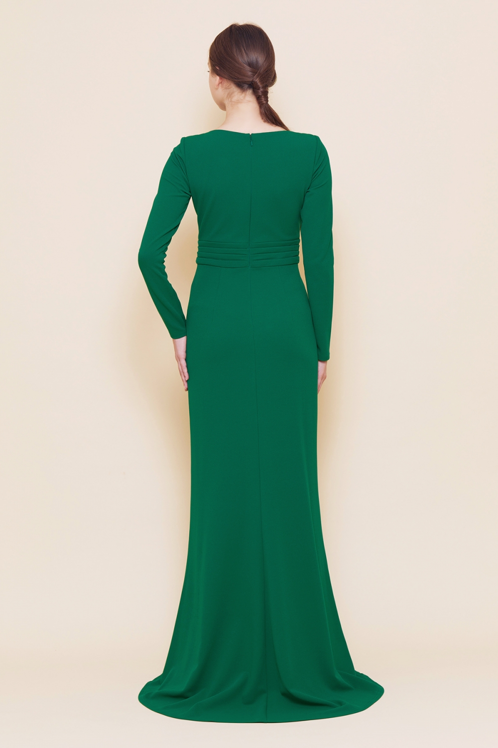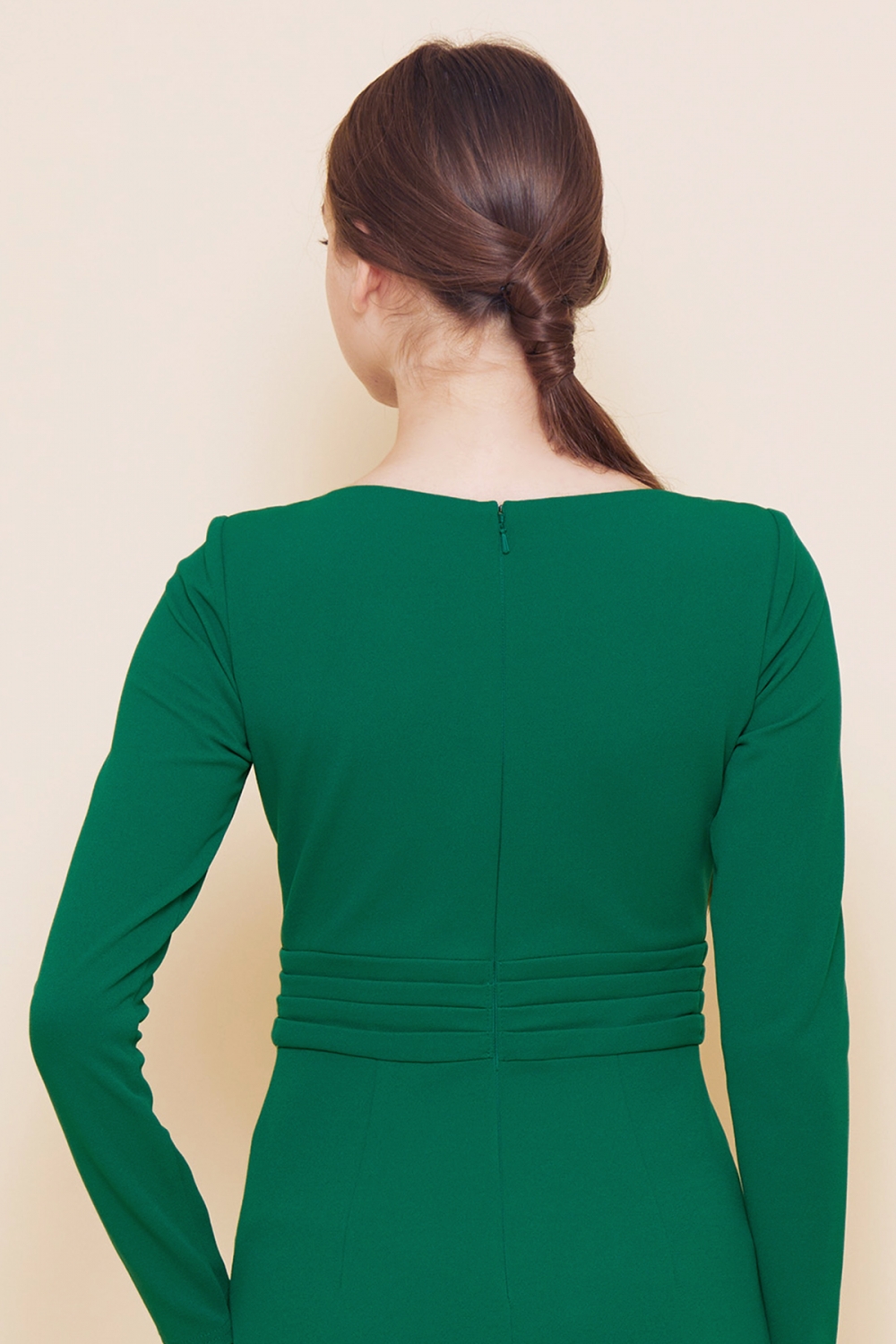 着心地の良いクレープジャージーのロングドレス。肩からウェストまで流れるように配置したプリーツが、ウェストのプリーツへと続き、上半身をすっきりと見せ、スカート部分のドレープが腰回りを優しく包みます。フロント部分にはスパンコールで装飾したコードレースがエレガントに輝きます。 モデルサイズ 身長168cm B:82cm W:60cm H:88cm /サイズ0着用 ■新作商品一覧はこちら■ □ロングドレス一覧はこちら□ ■グリーンの商品一覧はこちら■