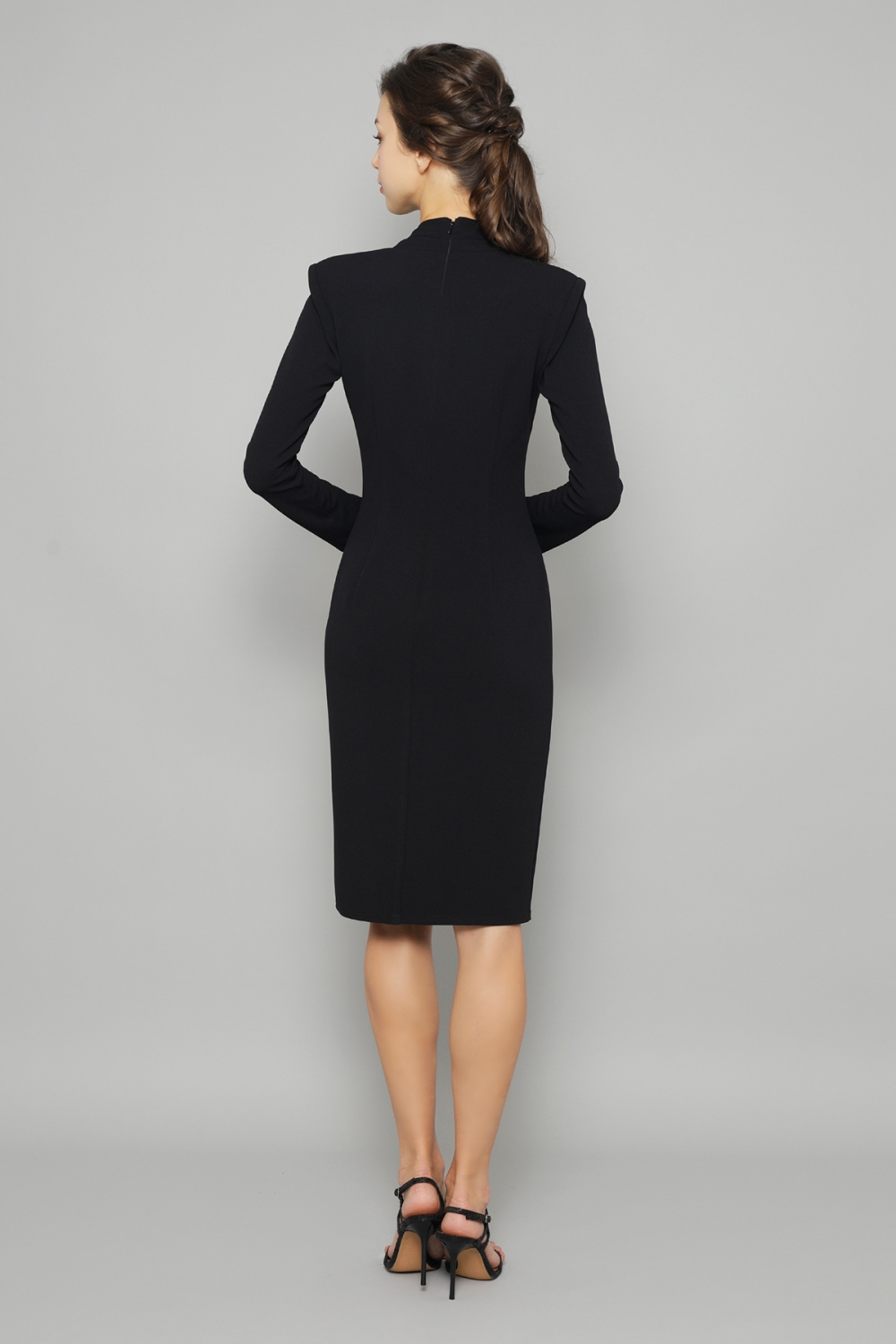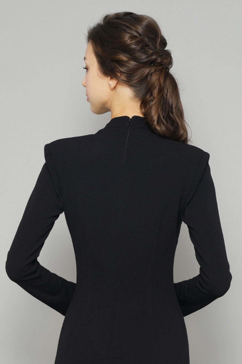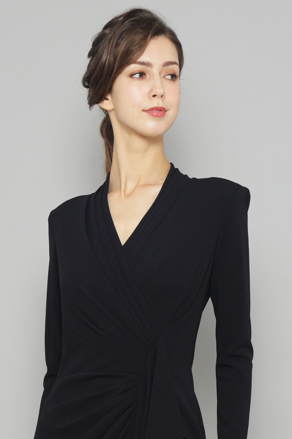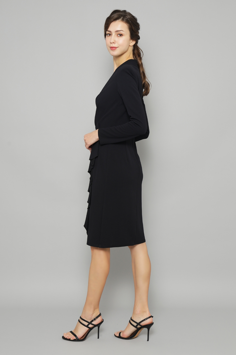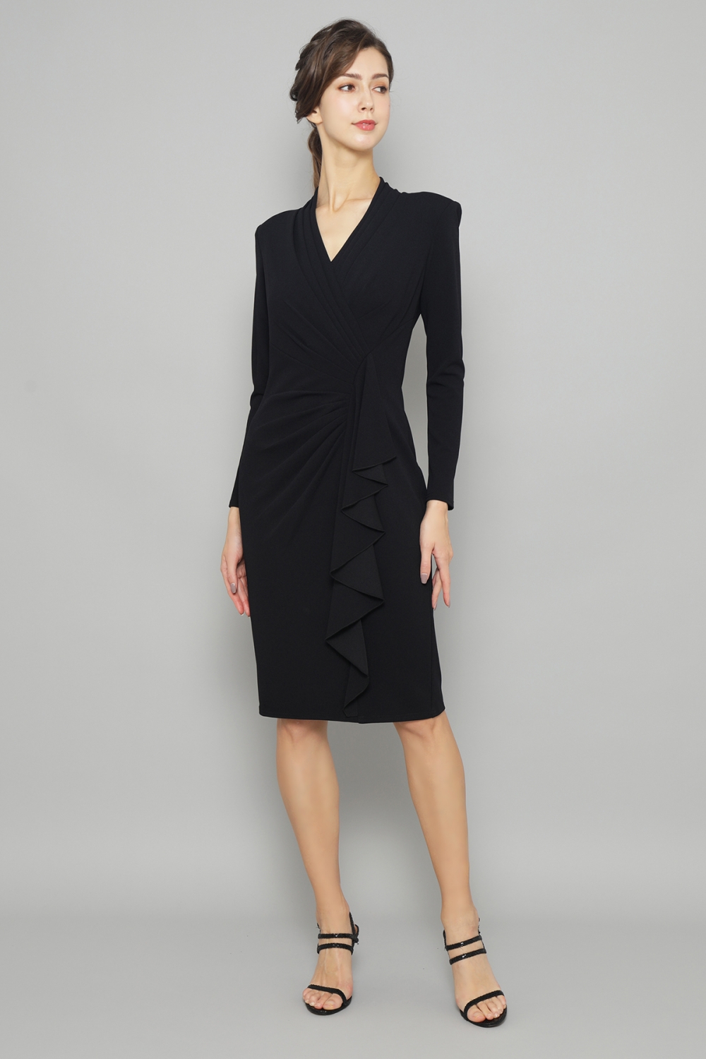 着心地の良いクレープジャージーのミディアムドレス。ショールネックからつながるドレープはウェストをほっそり見せる効果があり、流れるようにウェストからスカート部分に配置されたラッフルは、縦のラインを強調し、スタイルアップが叶います。肩パットが入ったショルダーラインは端正なイメージです。ブラックカラーで、オフィスにも、入園式や卒業式にも、そして結婚式やパーディーにも、合わせるアクセサリーやバッグを変えれば、様々なオケージョンでご着用いただけます。