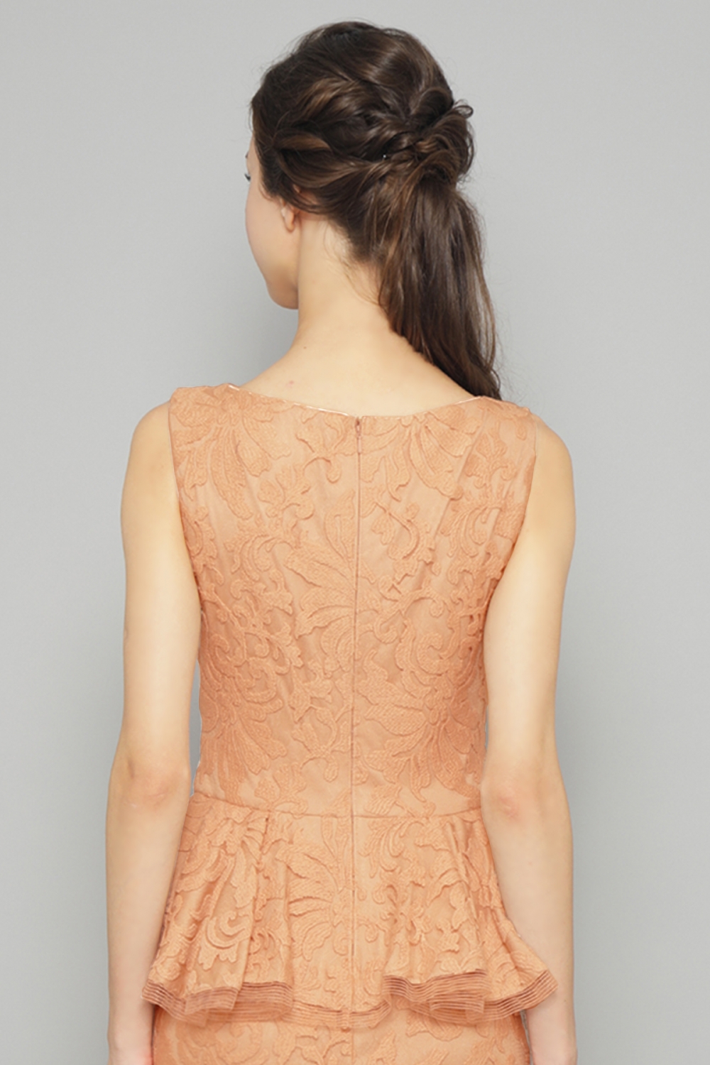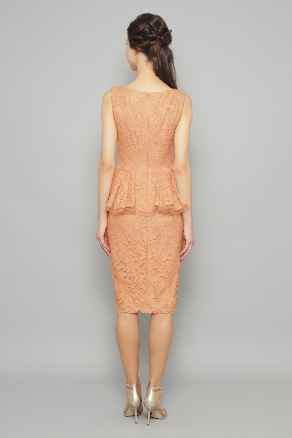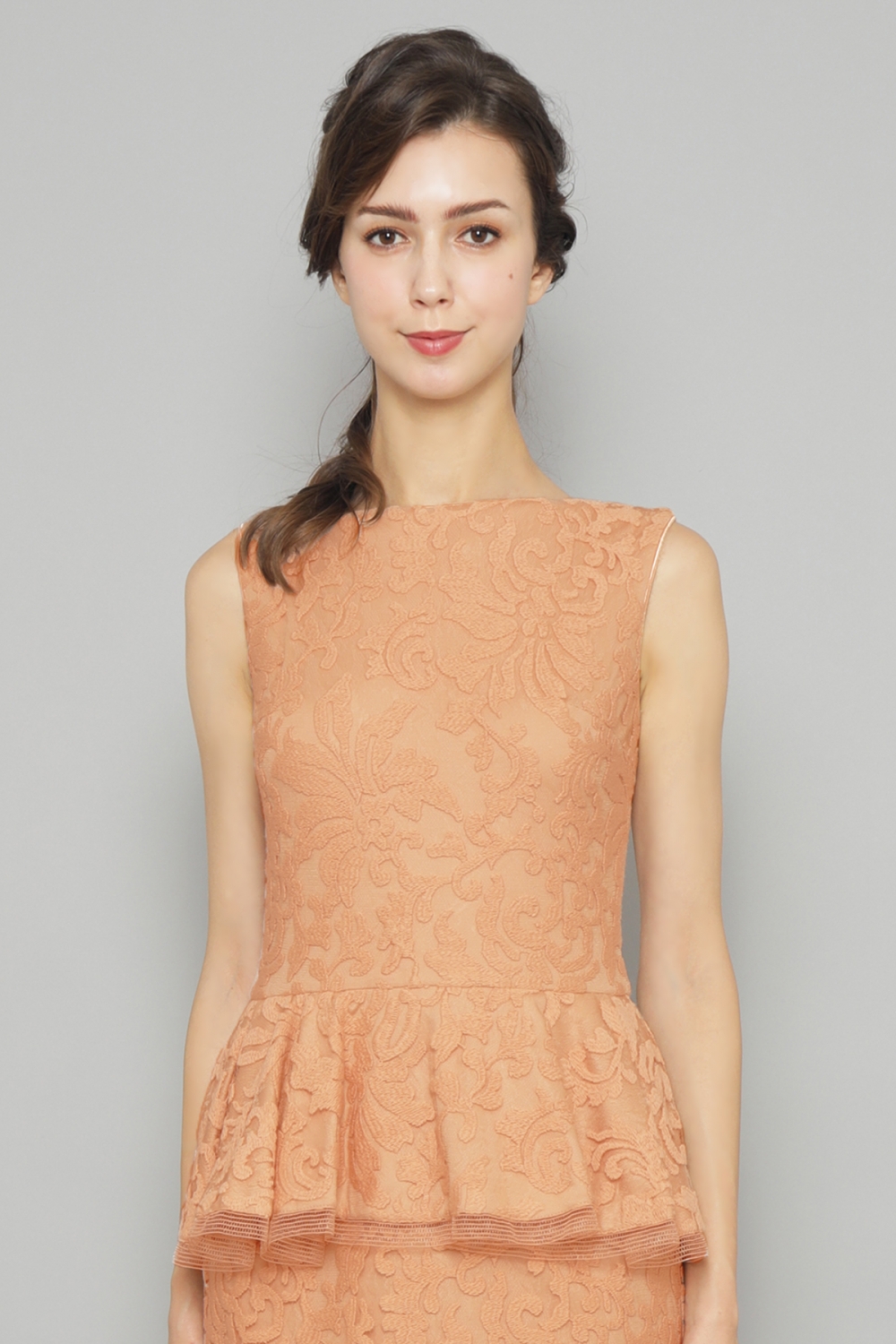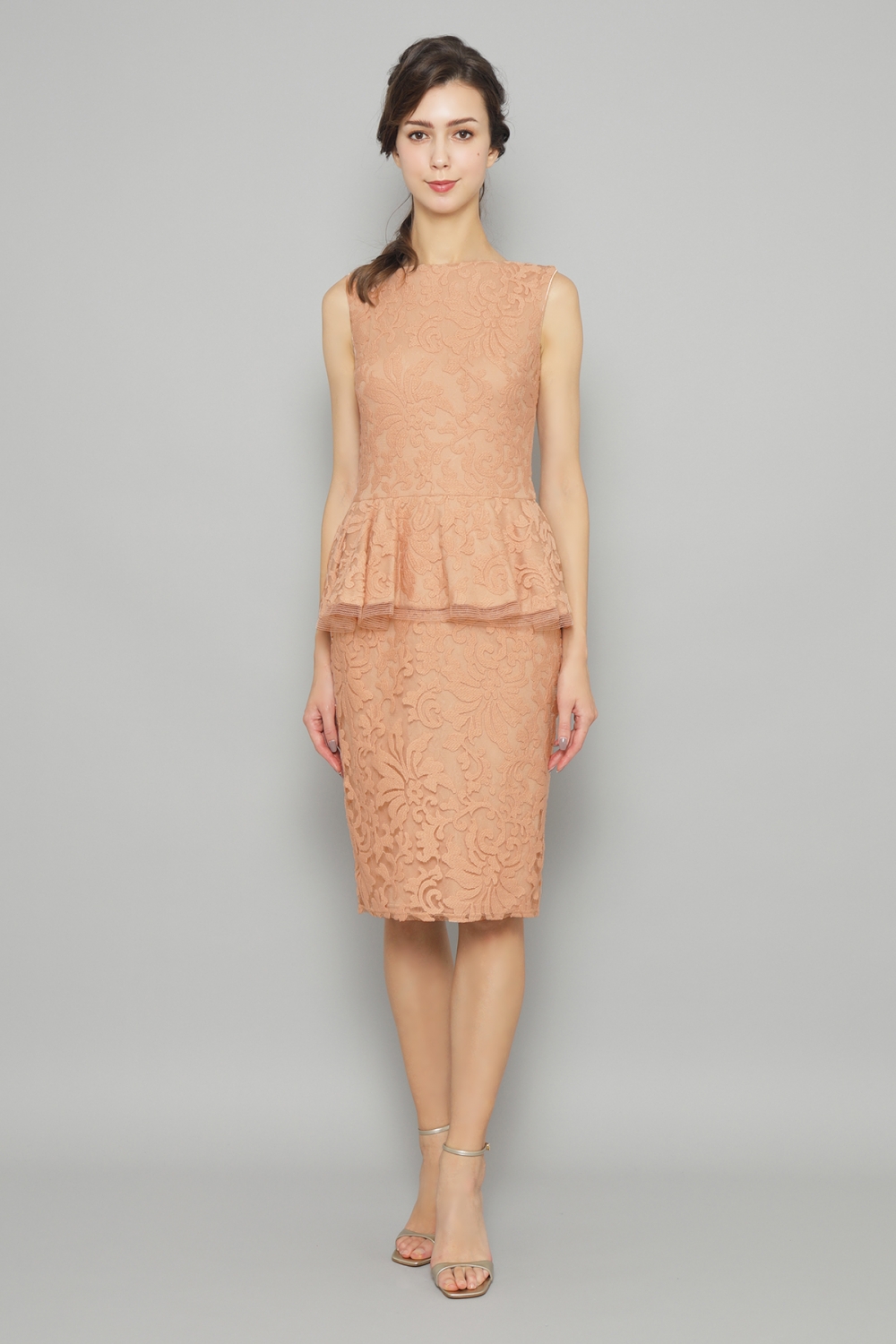 立体感のあるフラワーレースが美しいペプラムドレスは、スパンコールやビーズの刺繍がないタイプ。ペプラムが華やかで、ウェストをほっそりと見せてくれる効果もあります。ランチや、観劇などデイウェアーとしても活躍します。優しいピンクベージュは肌なじみもよく上品な雰囲気で、幅広い年代の方にご着用いただけます。
