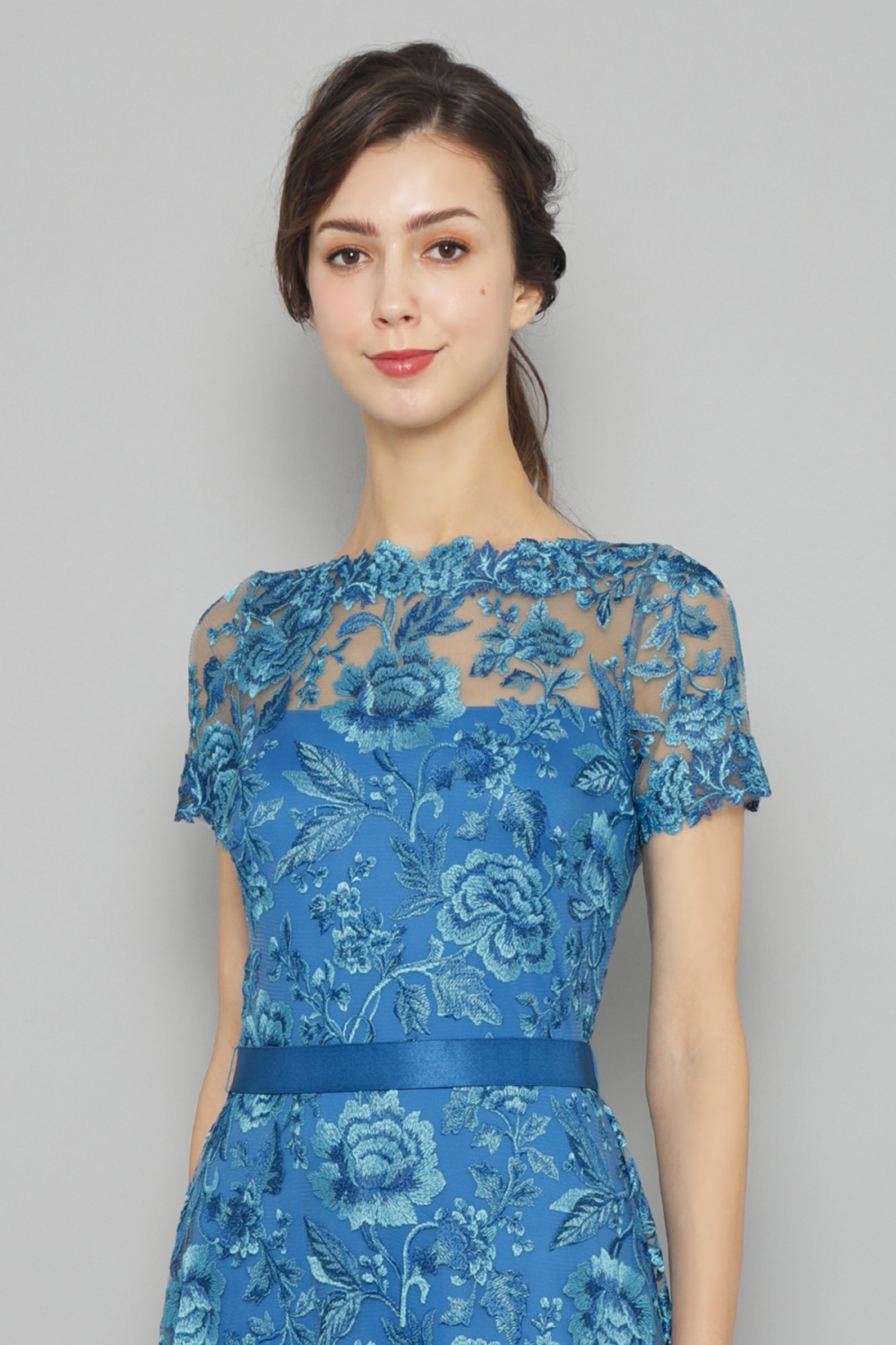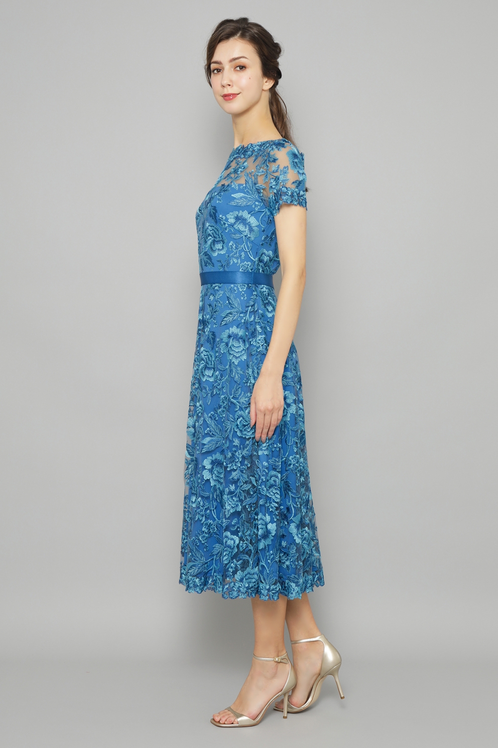 光沢のあるローズ柄のレースが美しい、鮮やかなブルーのミモレ丈ドレス。胸元と袖のシースルー部分にはベージュのチュールを重ねているので、肌を美しく見せます。ウエストにあしらわれたベルトはサテン地のゴムベルトで、締め付け感はありません。同系色の裏地を付けた総レースのドレスは、高級感があり、上品でエレガント。パーティーや結婚式のゲストなど特別なイベントにピッタリです。