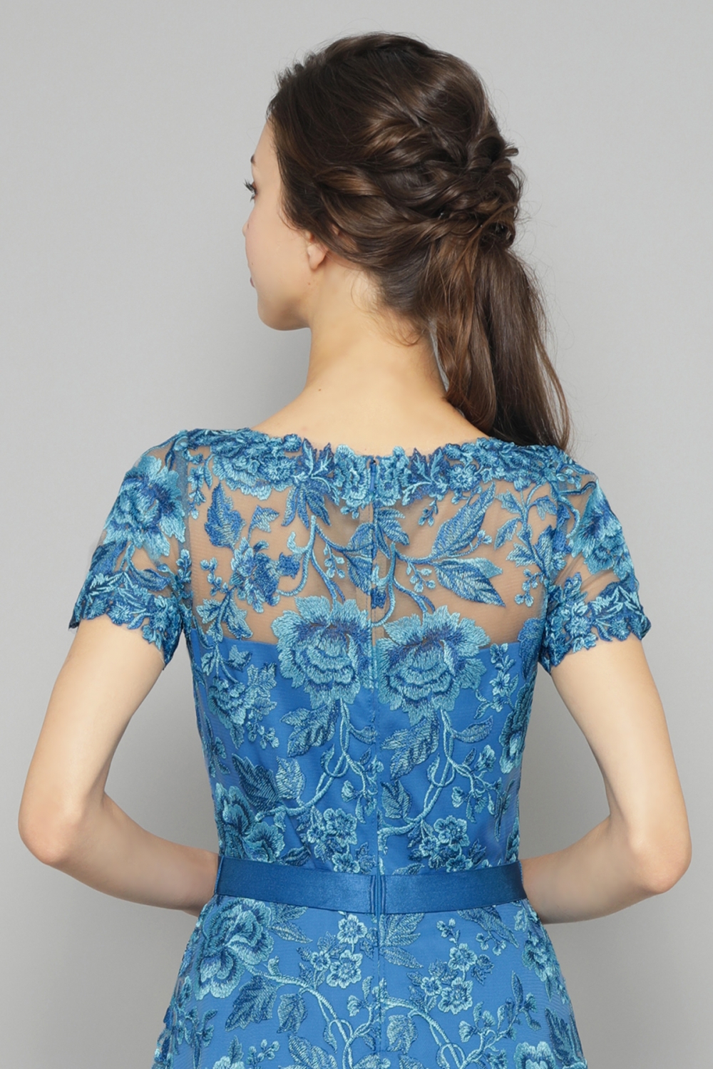 光沢のあるローズ柄のレースが美しい、鮮やかなブルーのミモレ丈ドレス。胸元と袖のシースルー部分にはベージュのチュールを重ねているので、肌を美しく見せます。ウエストにあしらわれたベルトはサテン地のゴムベルトで、締め付け感はありません。同系色の裏地を付けた総レースのドレスは、高級感があり、上品でエレガント。パーティーや結婚式のゲストなど特別なイベントにピッタリです。 "モデルサイズ 身長171cm B:78cm W:58cm H:87cm /サイズ0着用" ■新作商品一覧はこちら■ □ミディアムドレス一覧はこちら□ ■デイリードレス一覧はこちら■ □ブルーの商品一覧はこちら□
