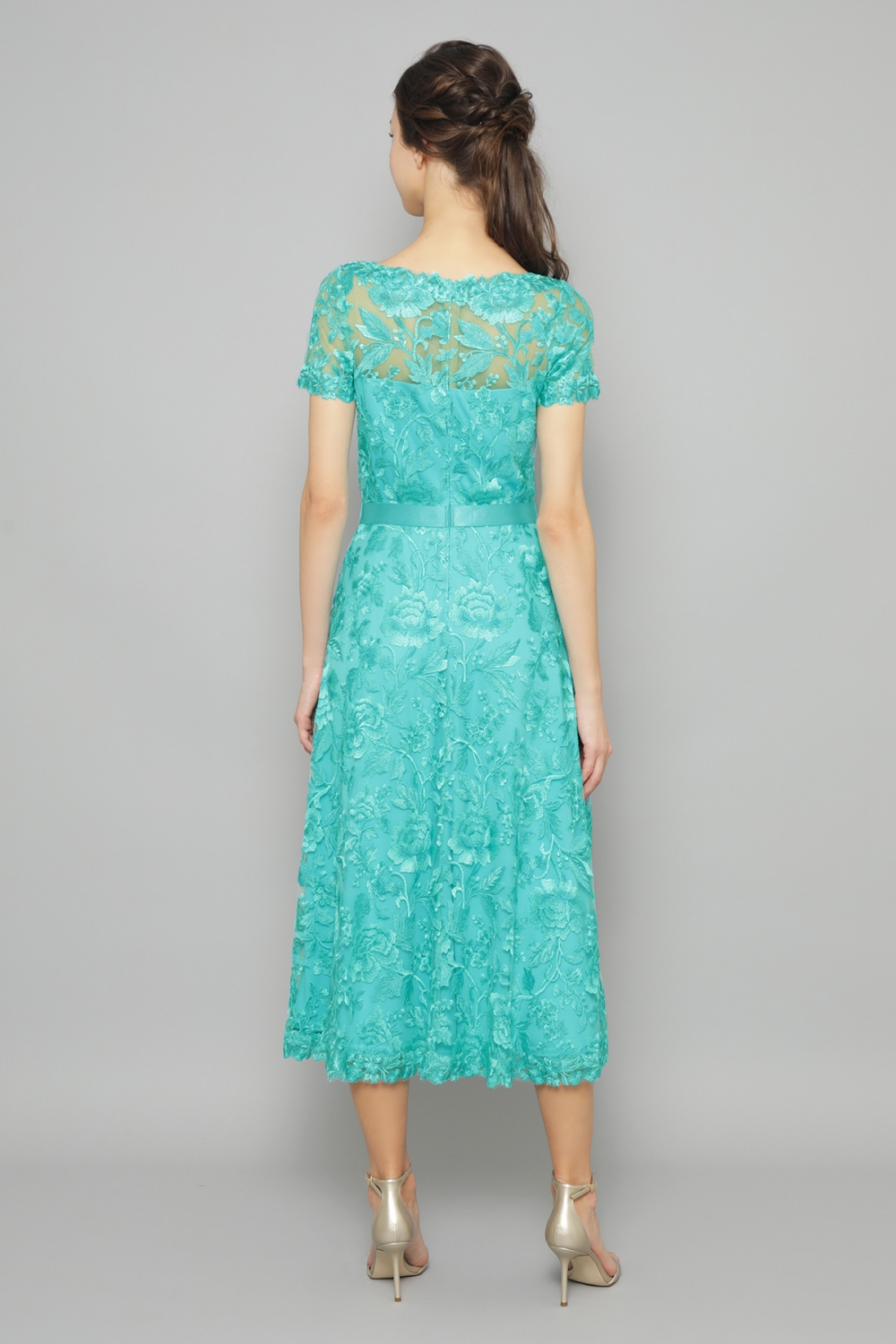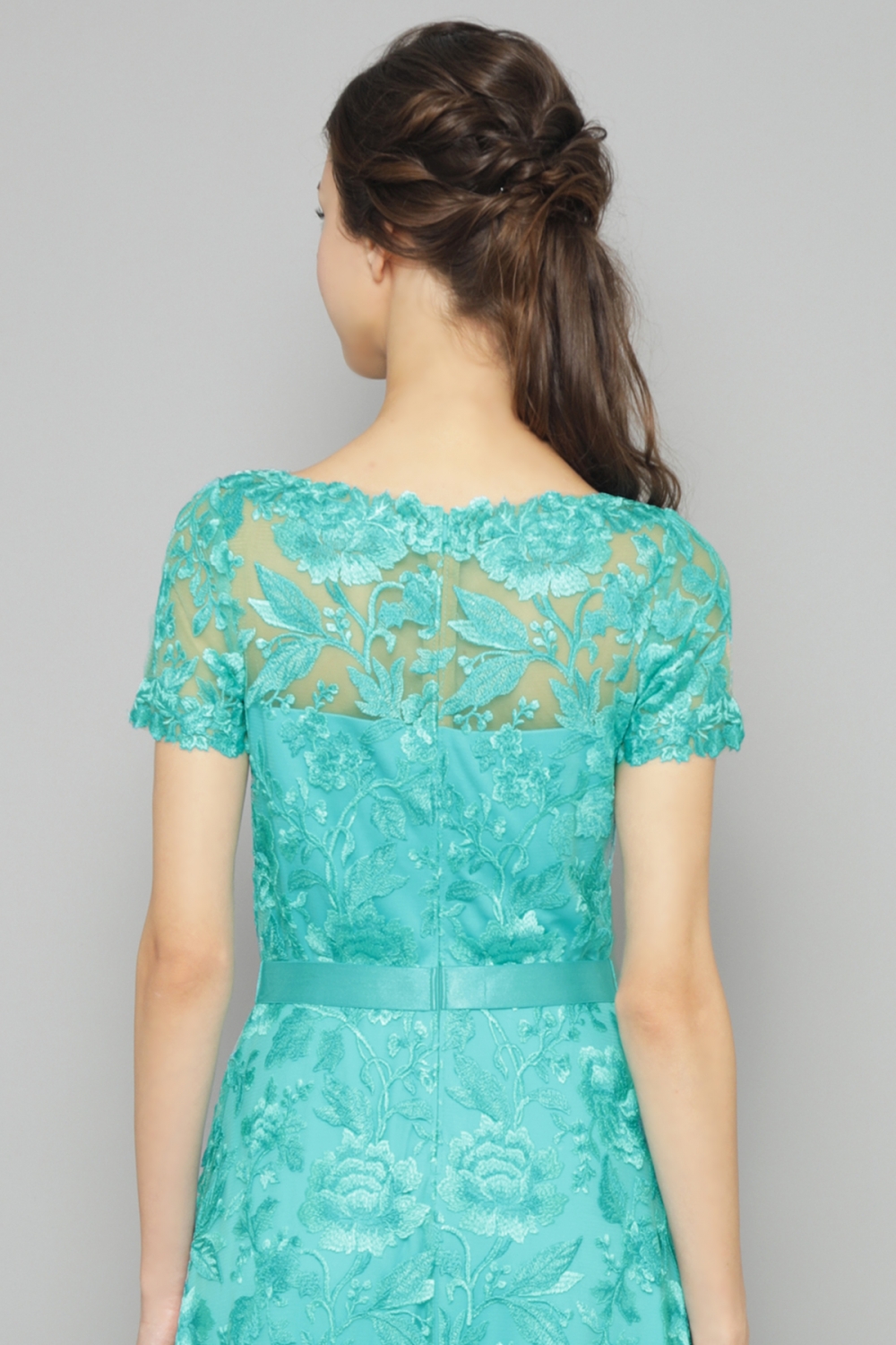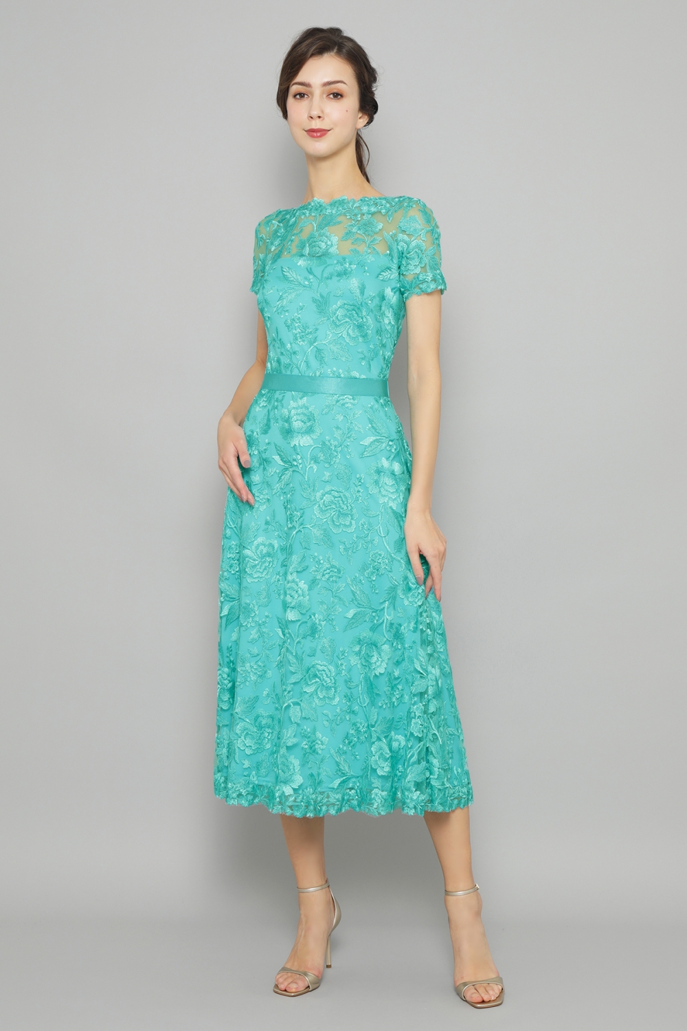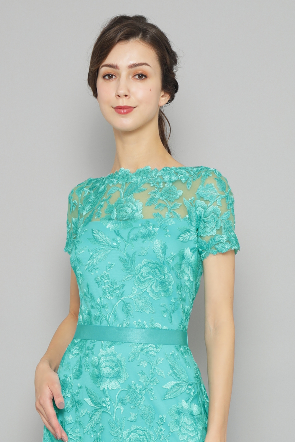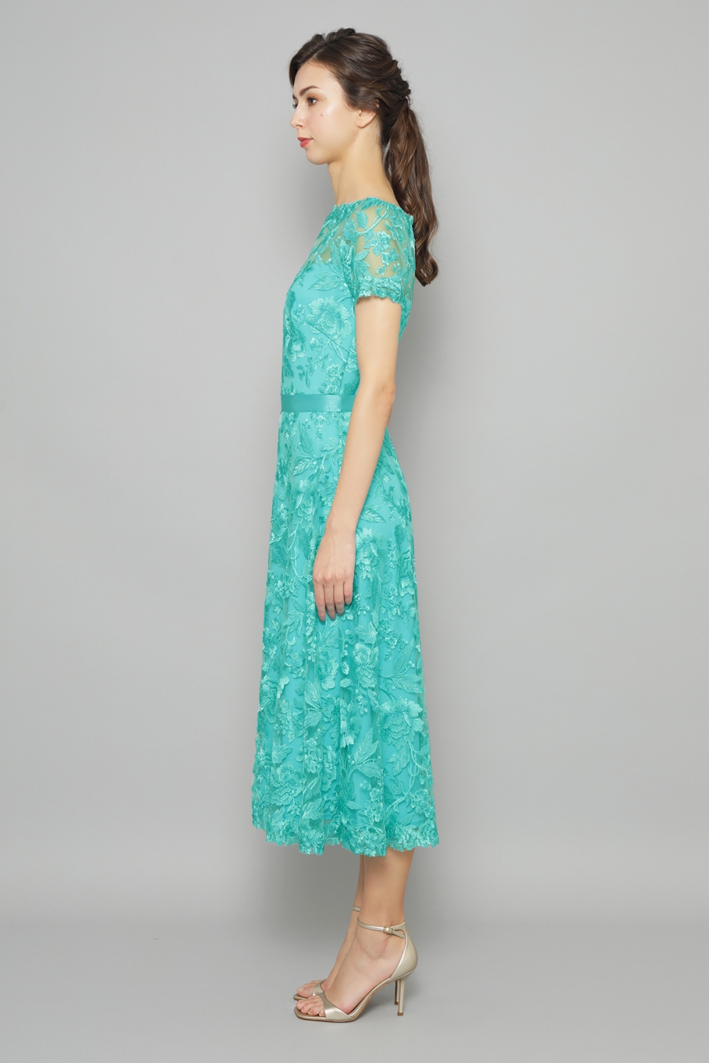 光沢のあるローズ柄のレースが美しい、柔らかなグリーンのミモレ丈ドレス。胸元と袖のシースルー部分にはベージュのチュールを重ねているので、肌を美しく見せます。ウェストにあしらわれたベルトはサテン地のゴムベルトで、締め付け感はありません。同系色の裏地を付けた総レースのドレスは、高級感があり、上品でエレガント。パーティーや結婚式のゲストなど特別なイベントにピッタリです。