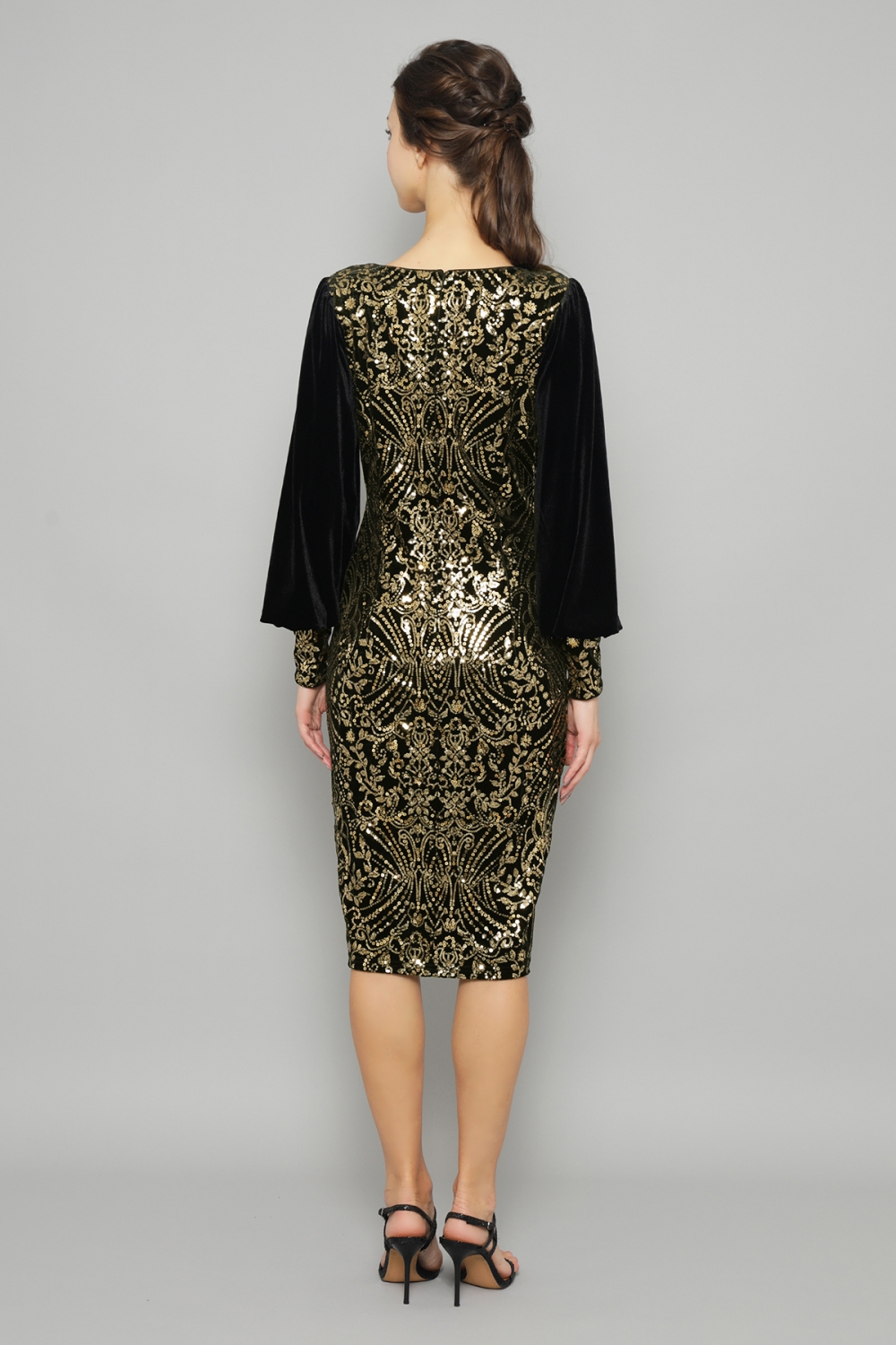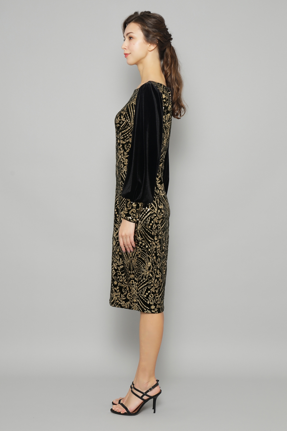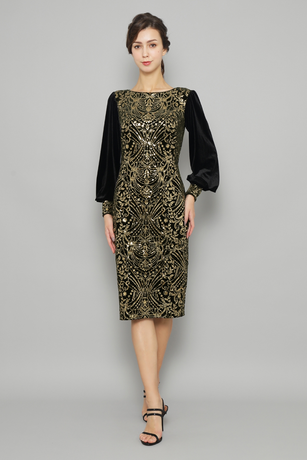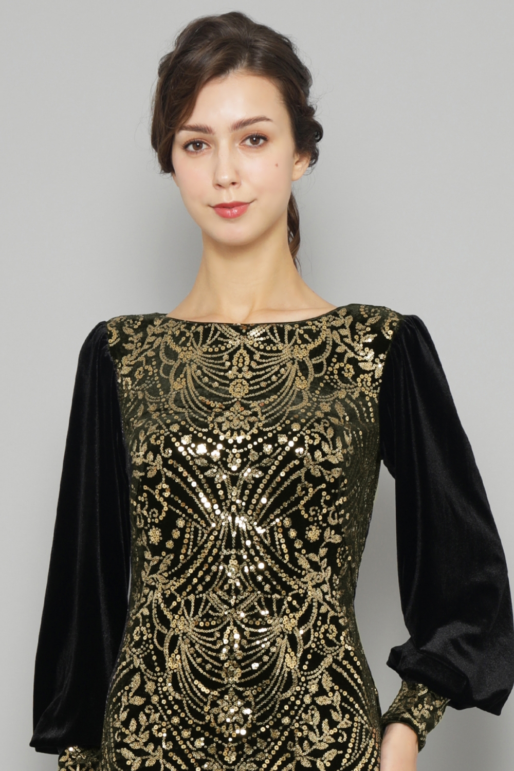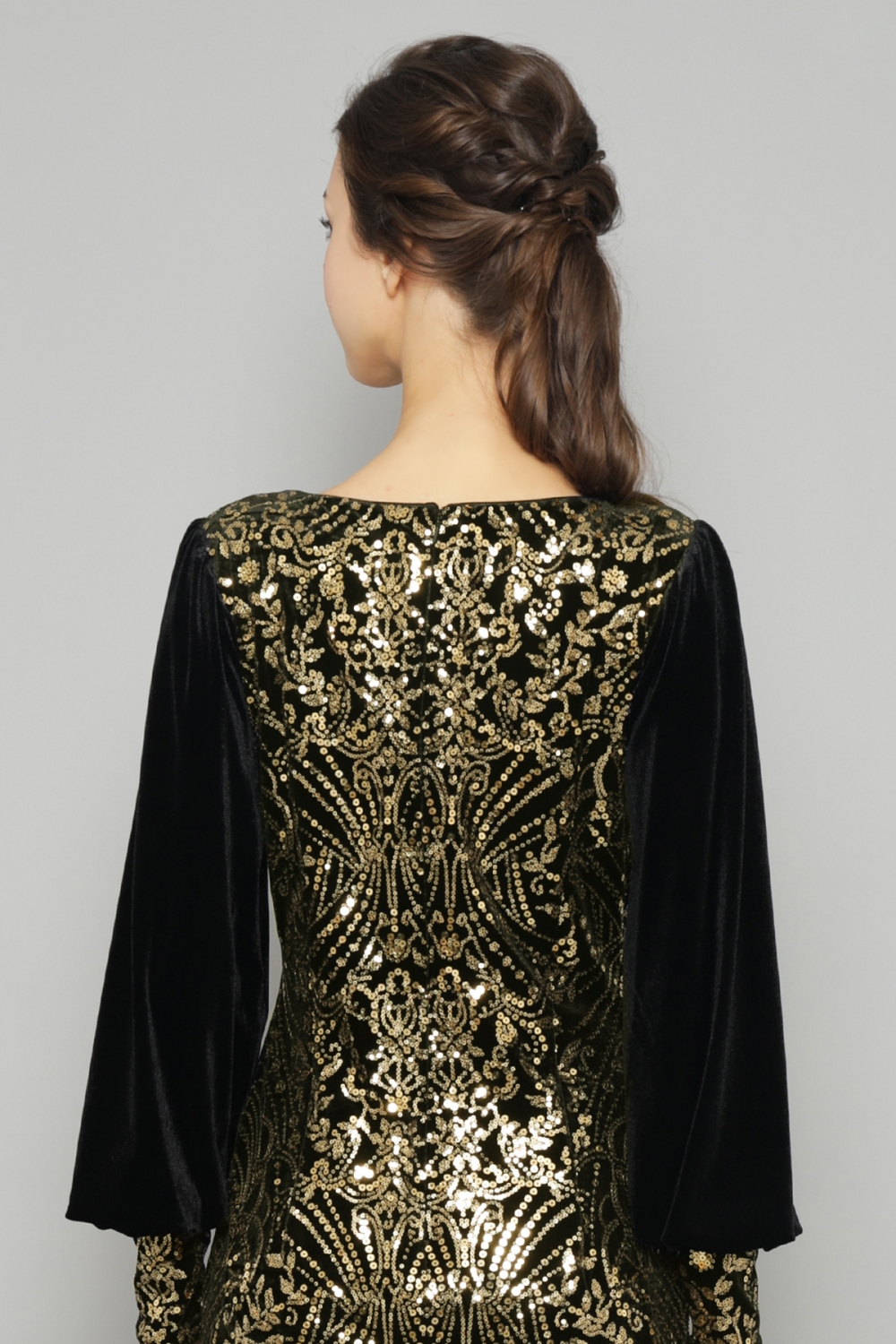なめらかなベルベットの生地に施されたゴージャスなスパンコール刺繍が美しいドレス。ブラックにゴールドのコンビネーションは派手なイメージですが、無地のロングスリーブが上品な落ち着きを加えます。華やかでありながら、エレガントな雰囲気です。