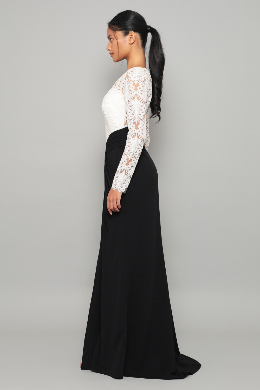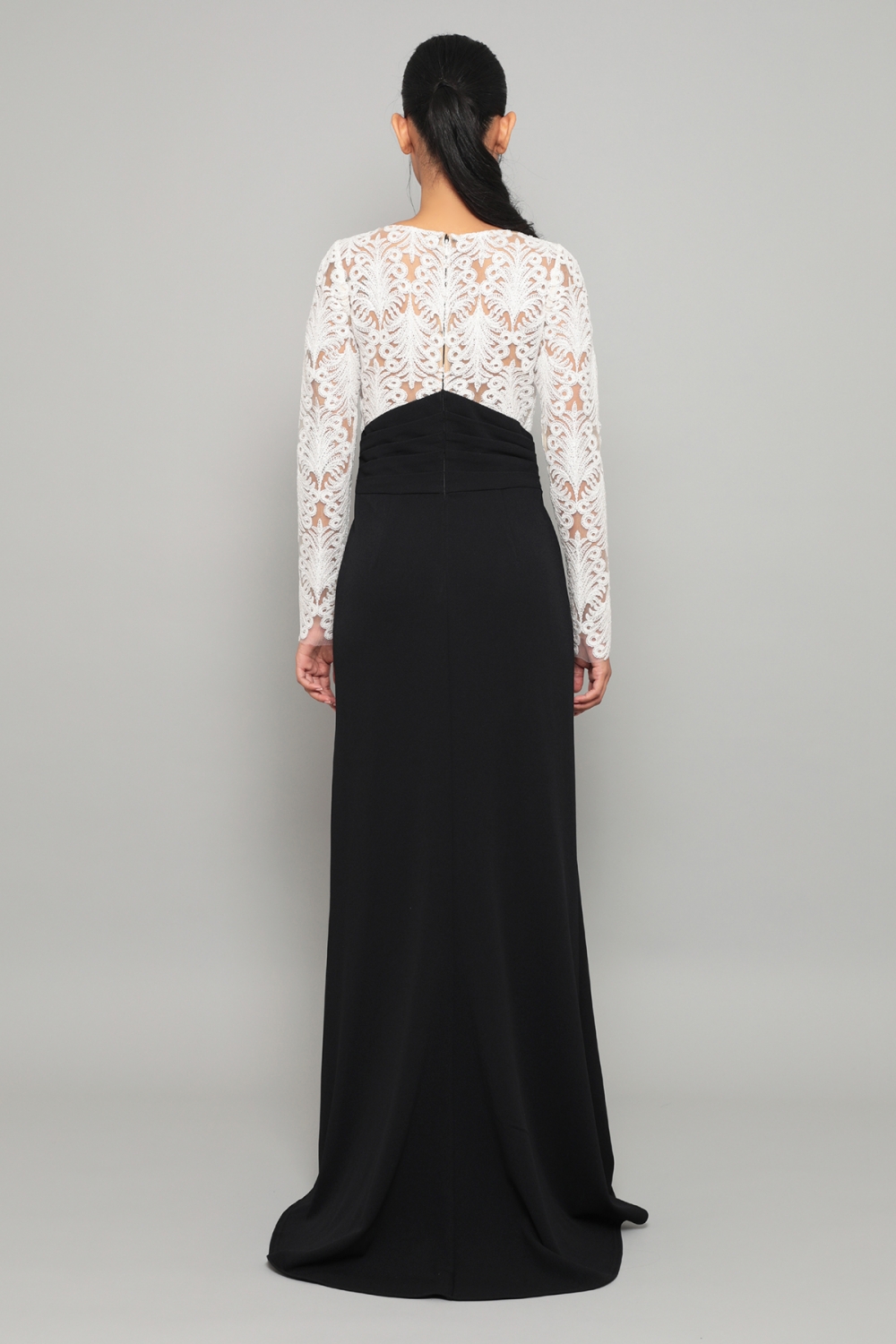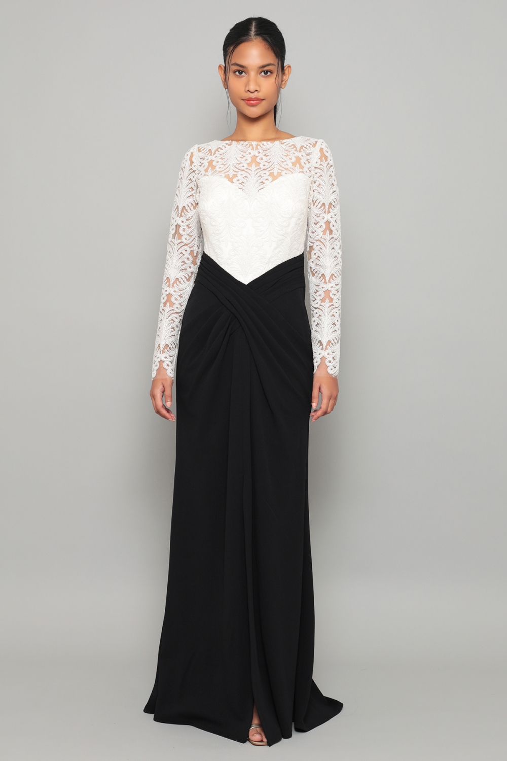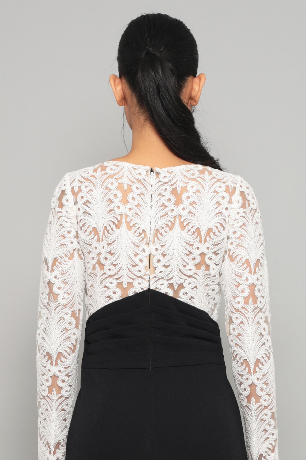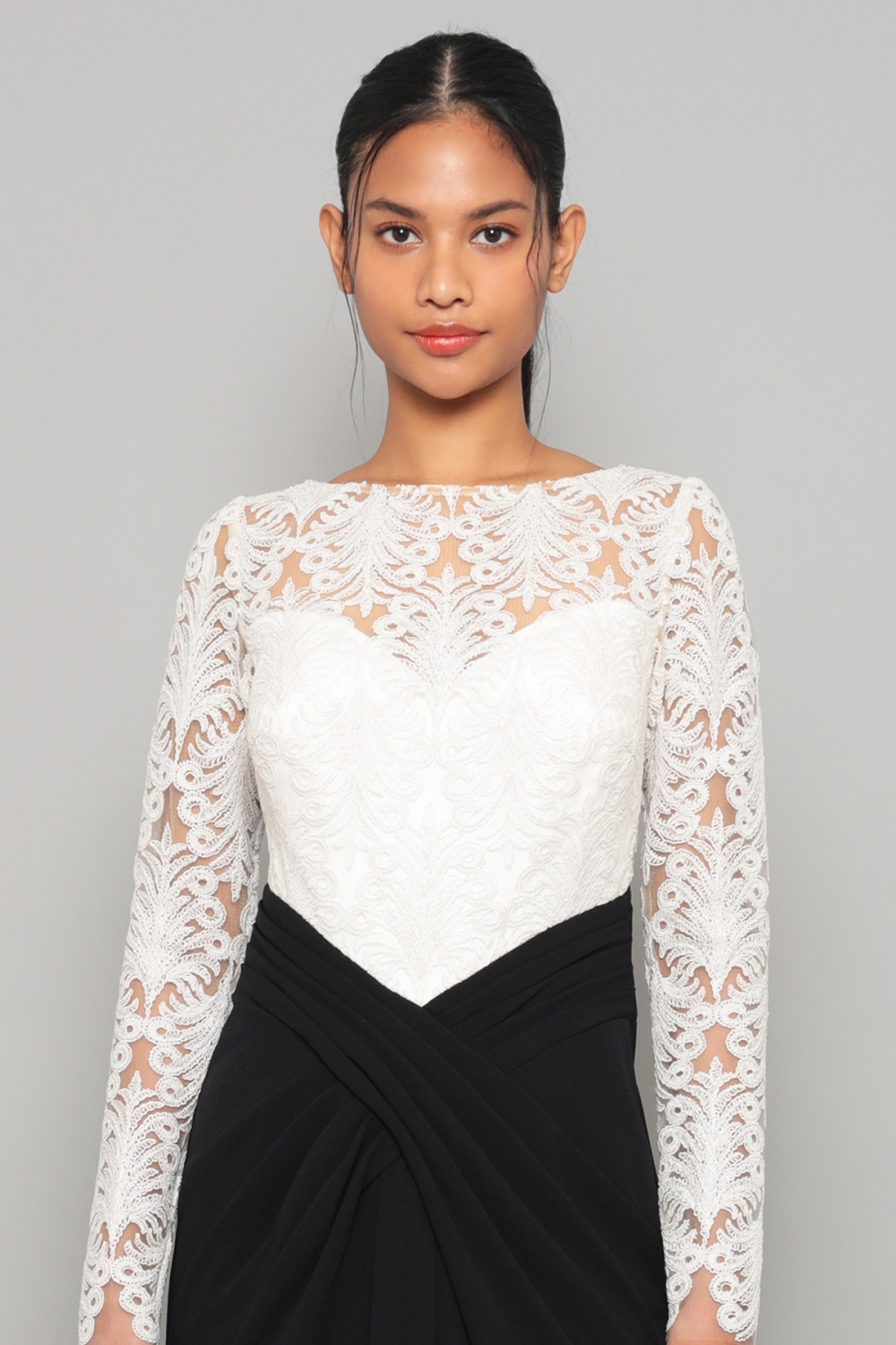 華やかなチュールレースのトップとシンプルなクレープジャージーのスカートのエレガントなコンビネーション。ボートネックは、首元をすっきり見せ、高めに配置したクロスウェストは、スタイルアップを叶えます。胸元から袖はシースルーで優雅な雰囲気です。パーティーでは、存在感を発揮できる一着です。