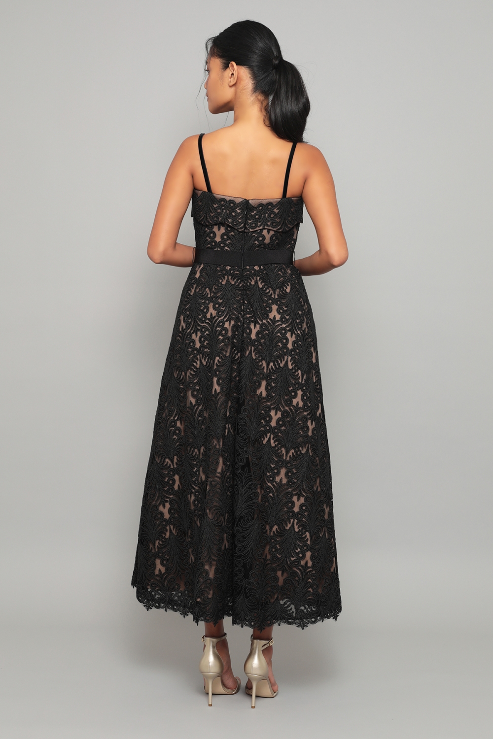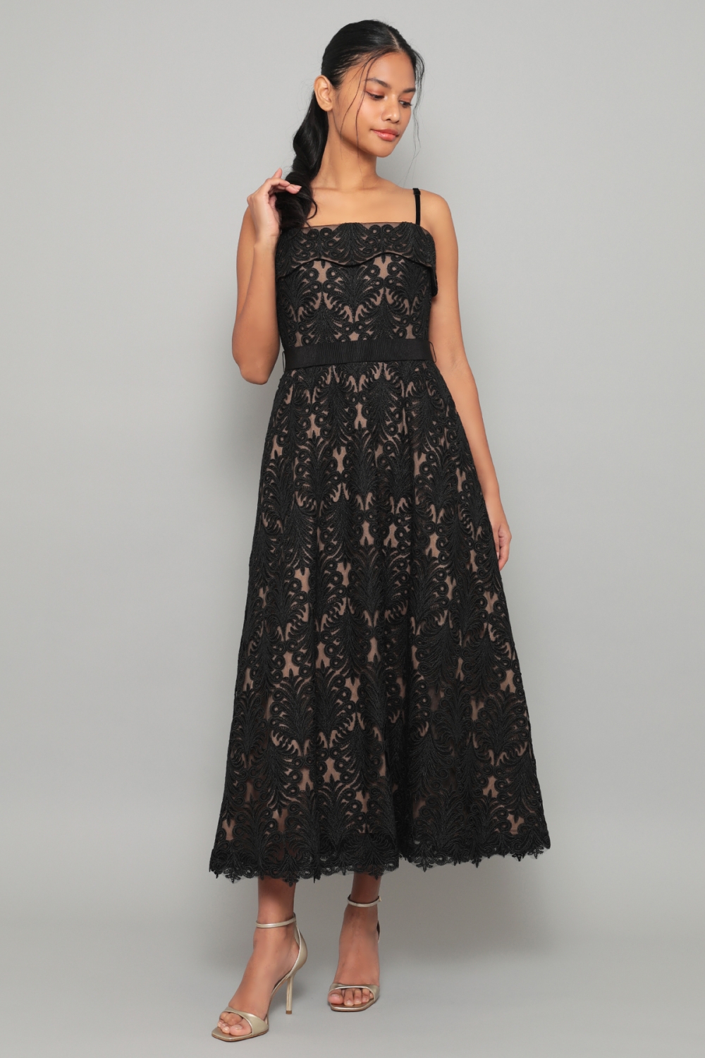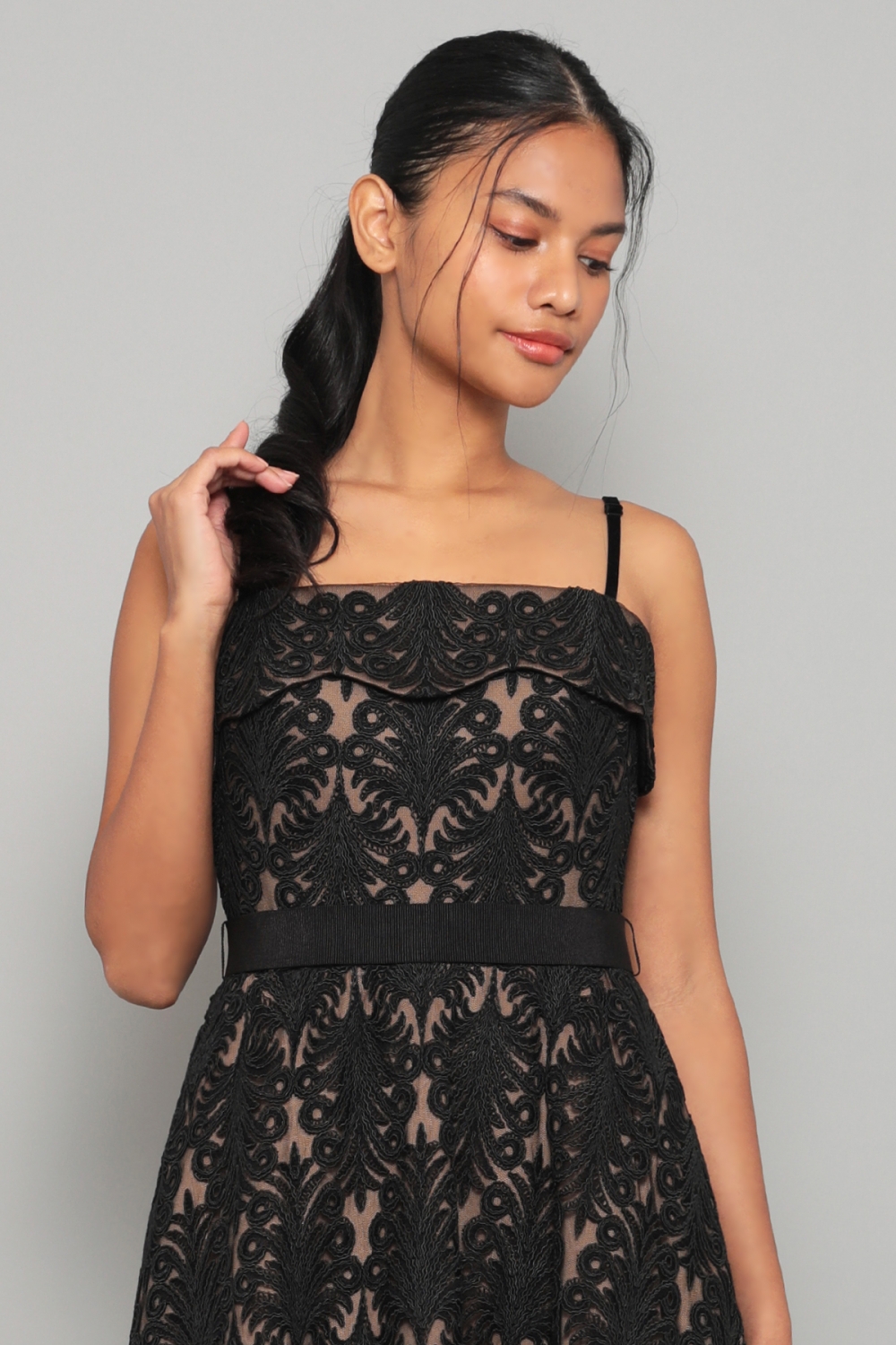 細部にまでこだわりを持って作られた、刺繍入りのチュール素材を使ったストラップレスのミモレ丈ドレス。ベアトップでもサイドにボーンが入っているため安定感があります。ドレスだけで華やかなパーティへ、同じ生地のボレロと合わせれば、フォーマルな席にもご着用いただけます。
