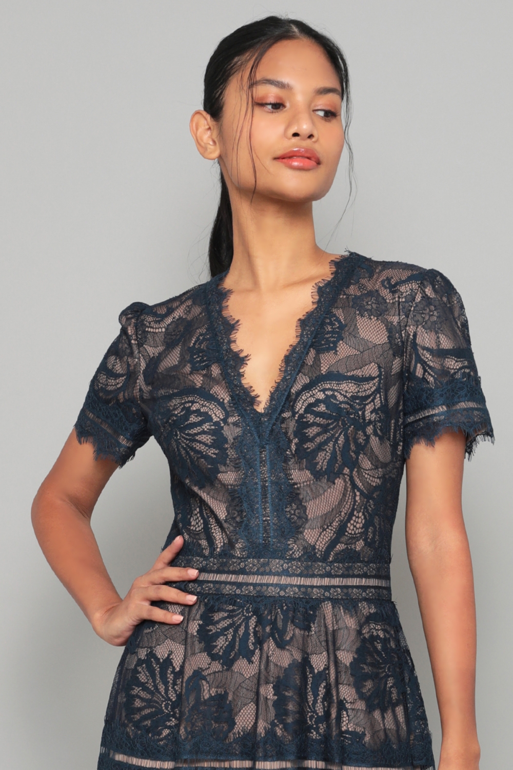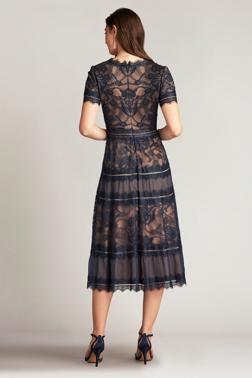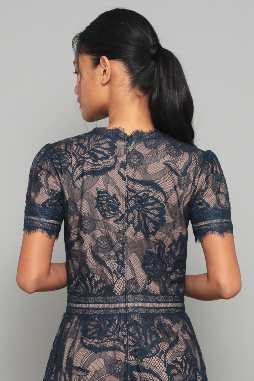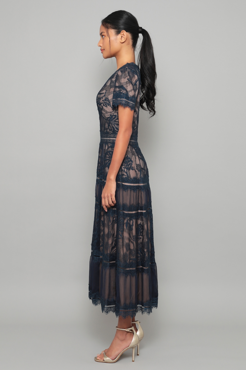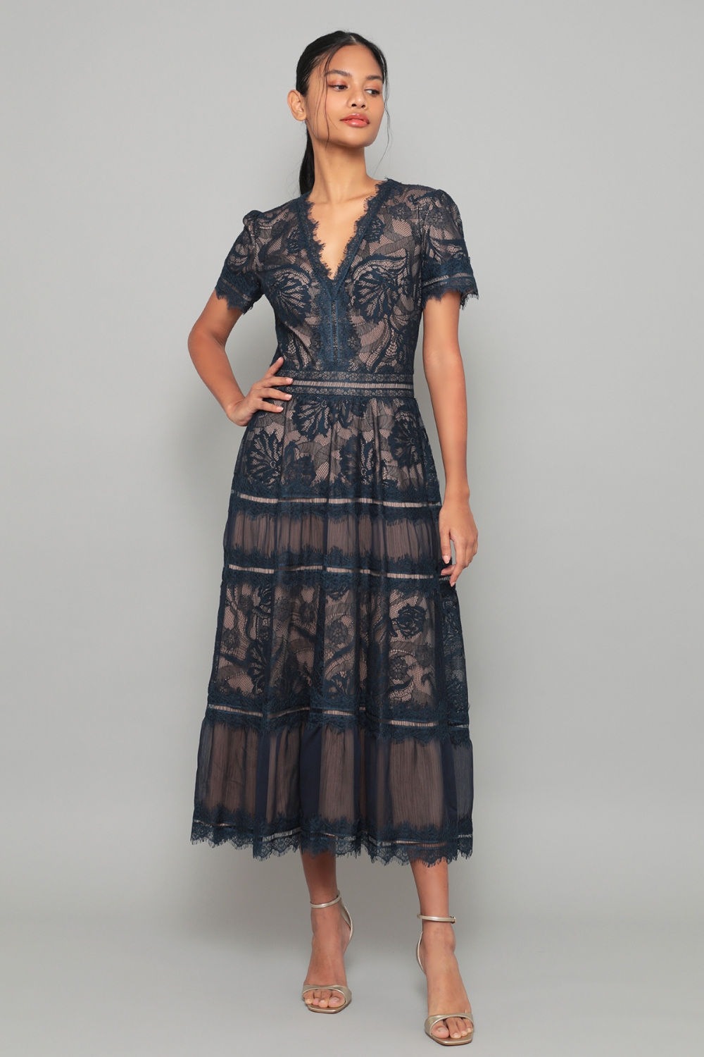 繊細で美しいネイビーのレースにヌードカラーの裏地を合わせたロマンティックな印象のミモレ丈ドレス。