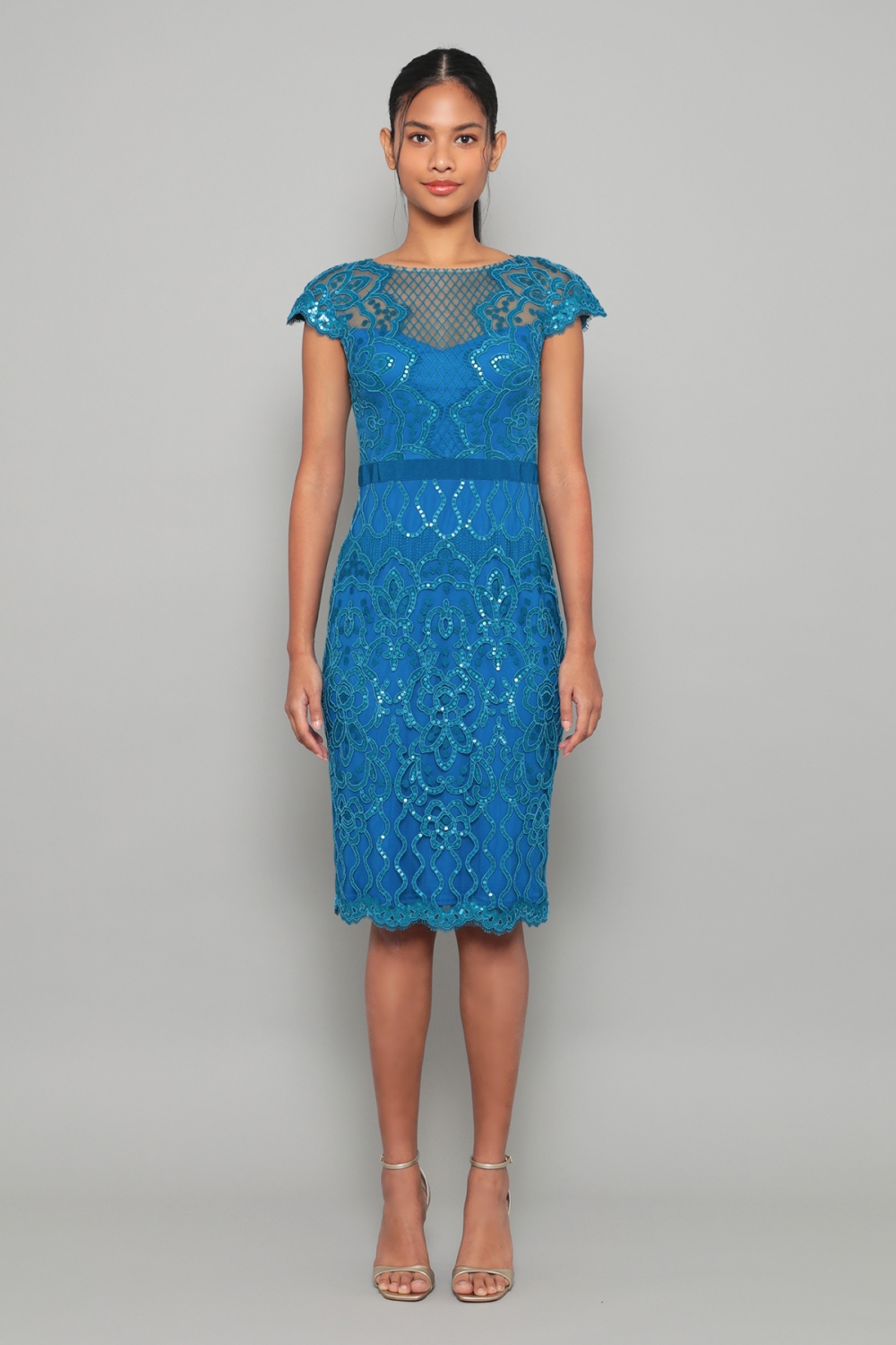 スパンコールの装飾が施された刺繍は立体的で華やかです。トップには刺繍チュールをVに配置しメッシュと組み合わせることでシャープな印象。スカート部分にも総刺繍を施していますが、光を抑えたスパンコールのを使用しているため、派手過ぎず、全体的にギラギラした感じはありません。海のようなブルーが美しい一着です。 モデルサイズ 身長170cm B:80cm W:59cm H:88cm /サイズ0着用 ■新作商品一覧はこちら■ □ミディアムドレス一覧はこちら□ ■デイリードレス一覧はこちら■