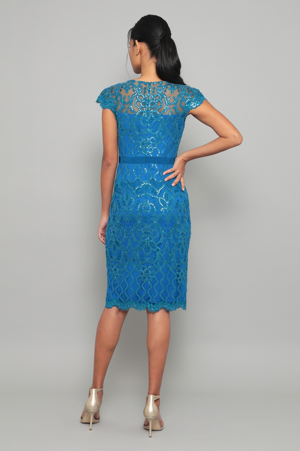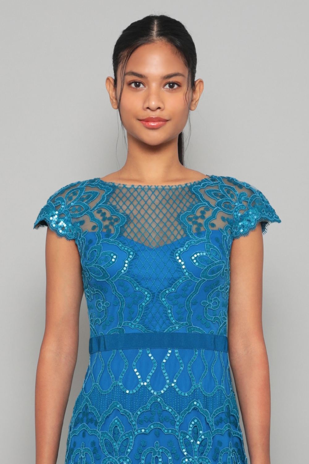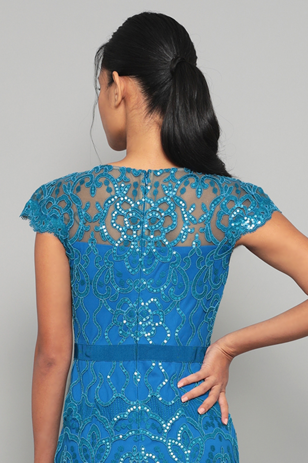 スパンコールの装飾が施された刺繍は立体的で華やかです。トップには刺繍チュールをVに配置しメッシュと組み合わせることでシャープな印象。スカート部分にも総刺繍を施していますが、光を抑えたスパンコールのを使用しているため、派手過ぎず、全体的にギラギラした感じはありません。海のようなブルーが美しい一着です。