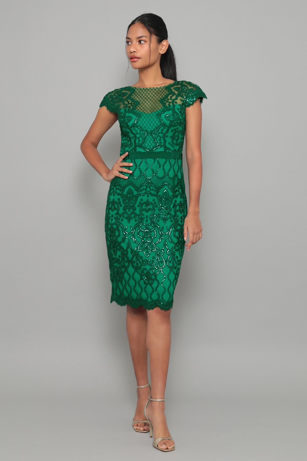 スパンコールの装飾が施された刺繍は立体的で華やかです。トップには刺繍チュールをVに配置しメッシュと組み合わせることでシャープな印象。スカート部分にも総刺繍を施していますが、光を抑えたスパンコールのを使用しているため、派手過ぎず、全体的にギラギラした感じはありません。深いグリーンが美しく、冬のパーティーにピッタリな一着です。 モデルサイズ 身長170cm B:80cm W:59cm H:88cm /サイズ0着用 ■新作商品一覧はこちら■ □ミディアムドレス一覧はこちら□ ■デイリードレス一覧はこちら■ □グリーンの商品一覧はこちら□