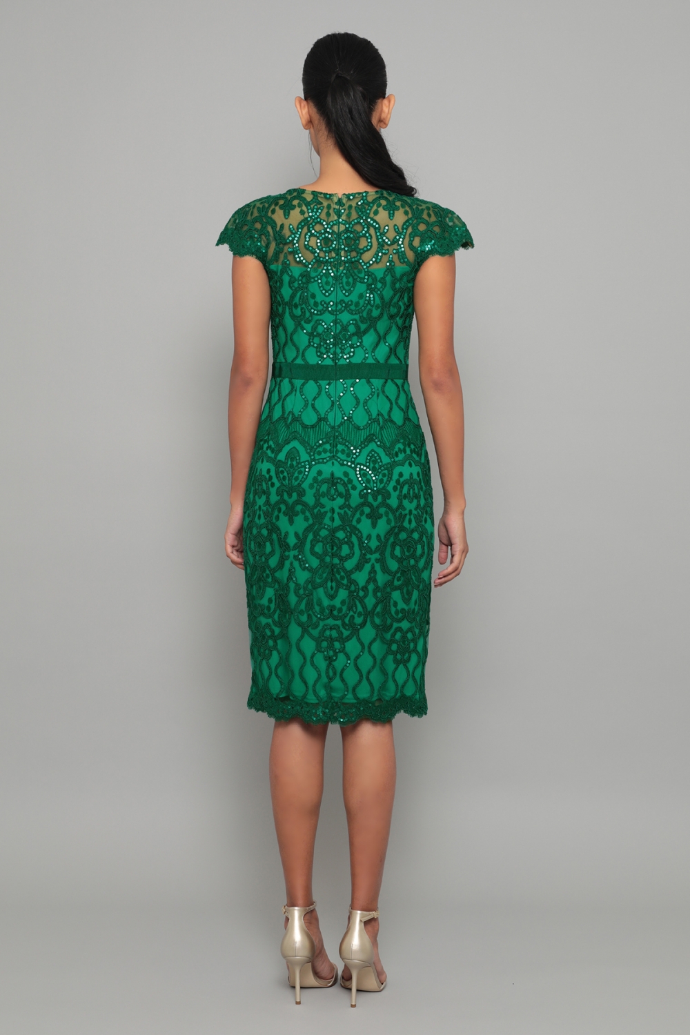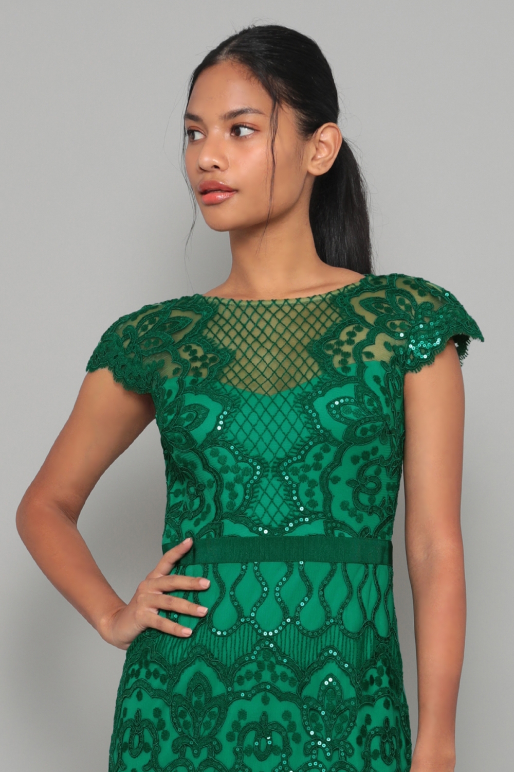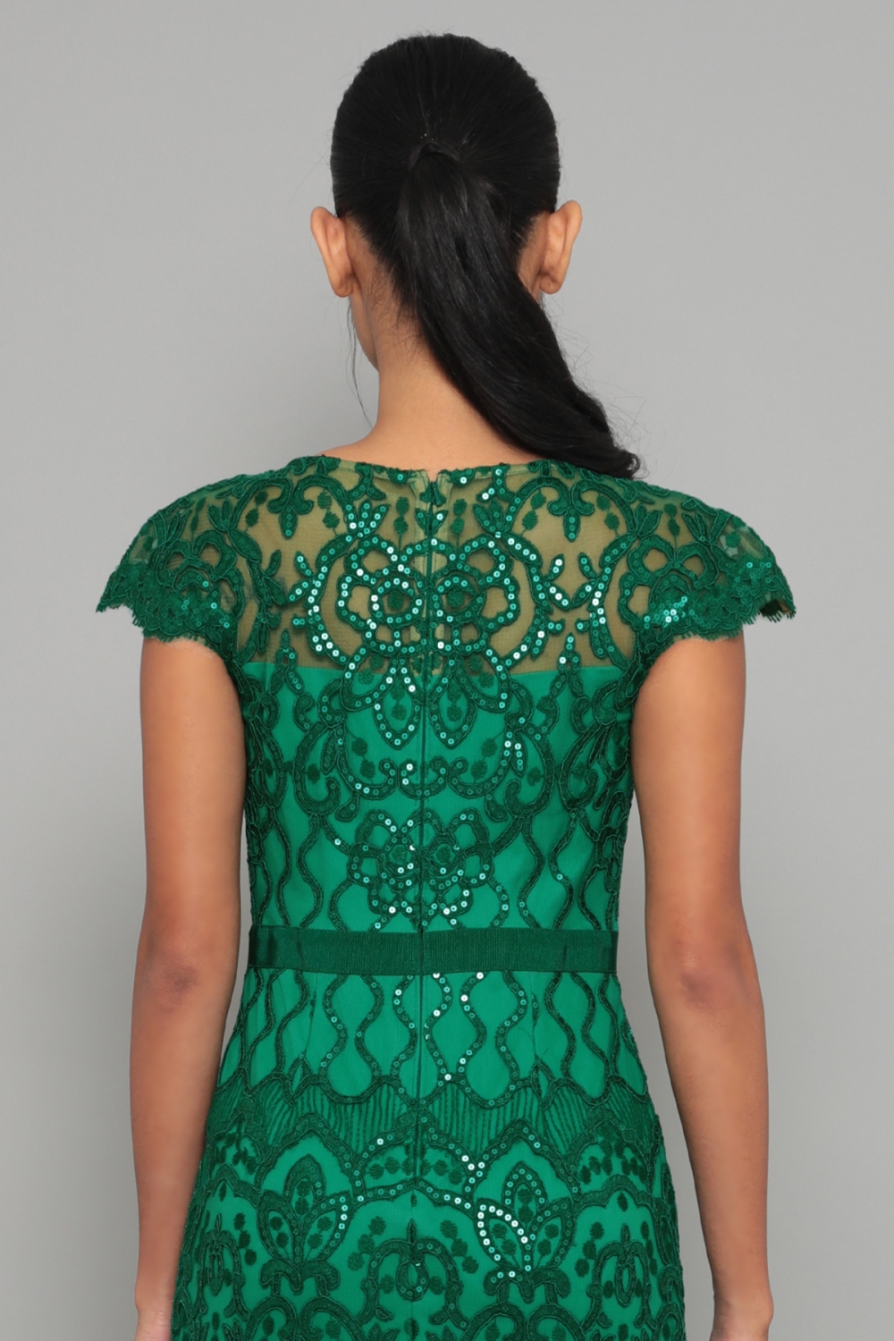 スパンコールの装飾が施された刺繍は立体的で華やかです。トップには刺繍チュールをVに配置しメッシュと組み合わせることでシャープな印象。スカート部分にも総刺繍を施していますが、光を抑えたスパンコールのを使用しているため、派手過ぎず、全体的にギラギラした感じはありません。深いグリーンが美しく、冬のパーティーにピッタリな一着です。
