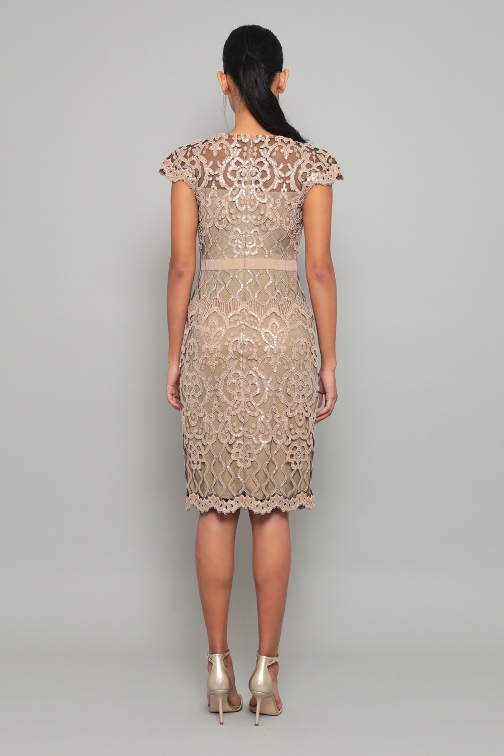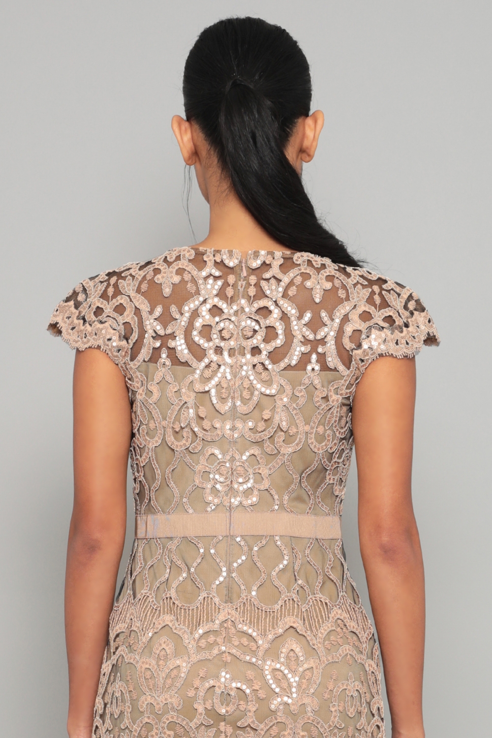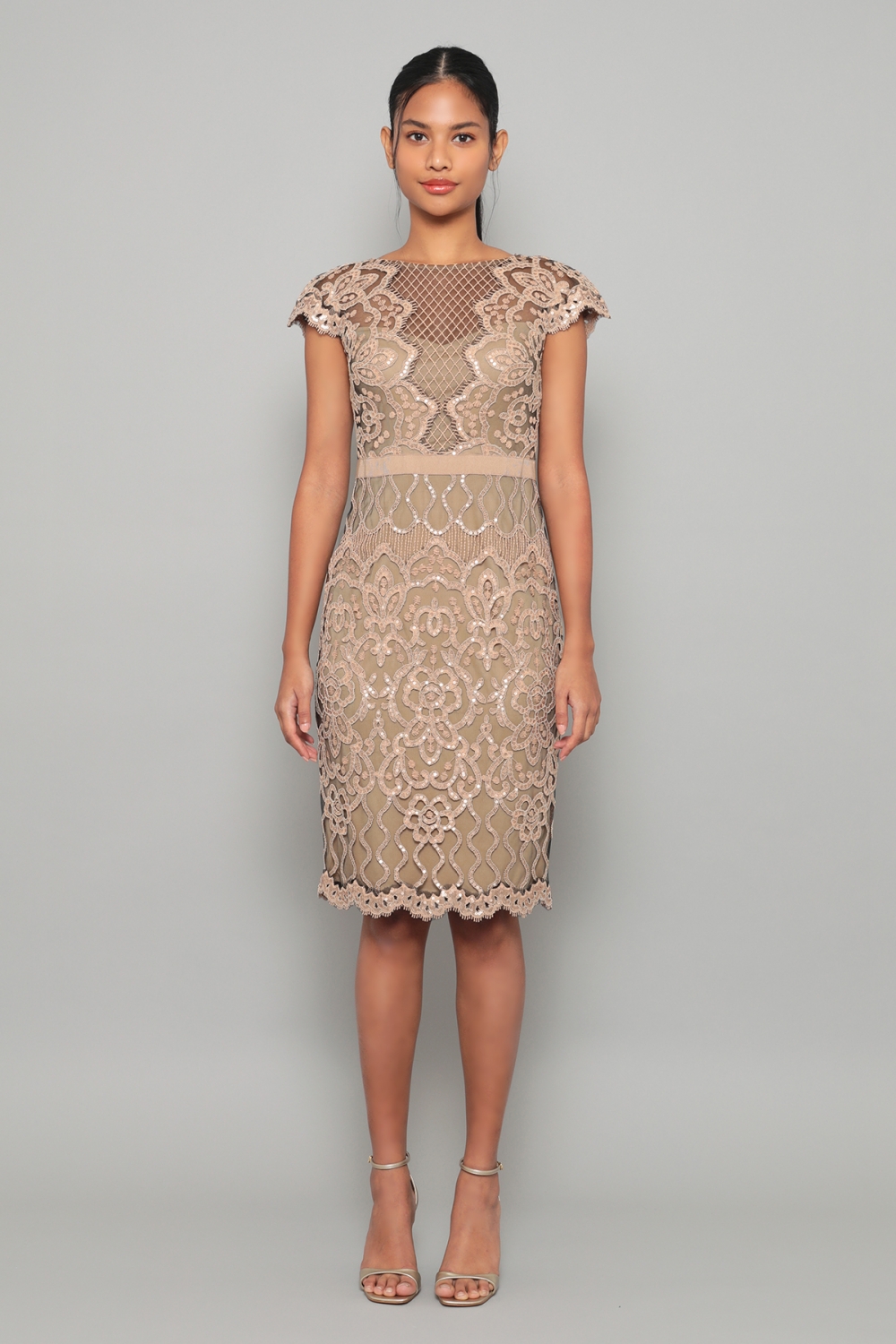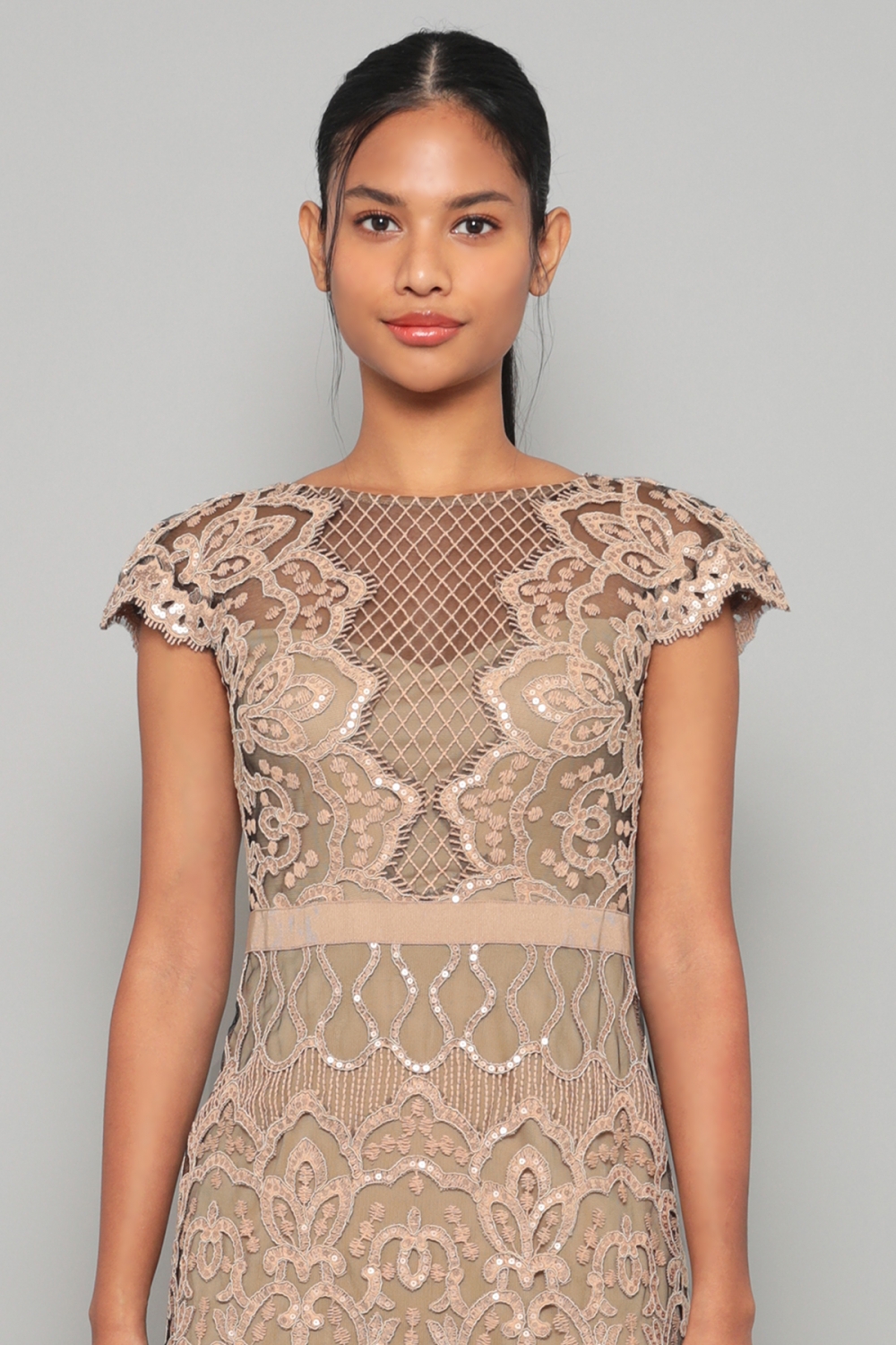 スパンコールの装飾が施された刺繍は立体的で華やかです。トップには刺繍チュールをVに配置しメッシュと組み合わせることでシャープな印象。スカート部分にも総刺繍を施していますが、光を抑えたスパンコールのを使用しているため、派手過ぎず、全体的にギラギラした感じはありません。肌なじみの良いベージュカラーは、上品で落ち着いた雰囲気です。
