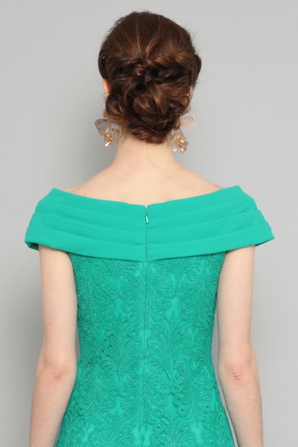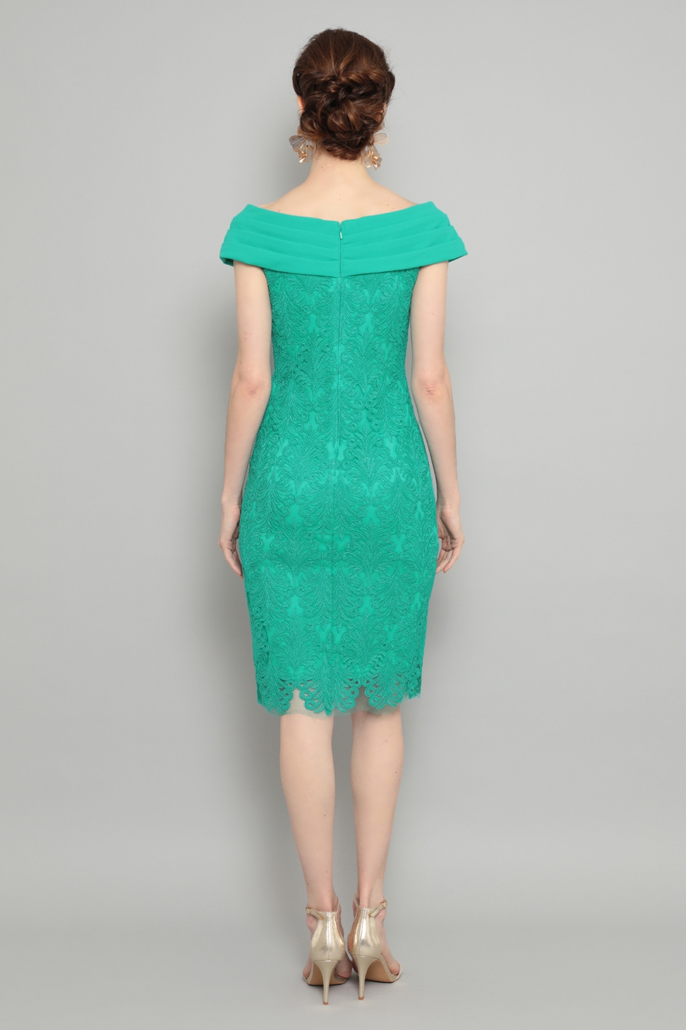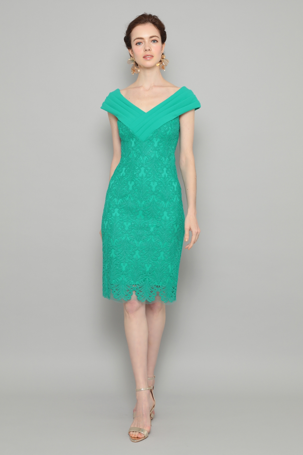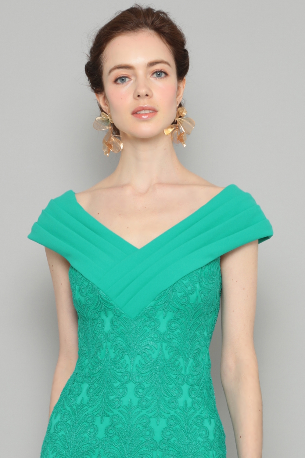 クレープジャージーと刺繍入りのチュール素材を使ったミディアムドレス。鎖骨を美しく見せるVネックラインに肩を華奢に見せるキャップスリーブでシンプルながら、エレガントな雰囲気です。爽やかなカラーはパーティーやブライダルゲスト、ディナーなど、様々なオケージョンでご着用いただけます。