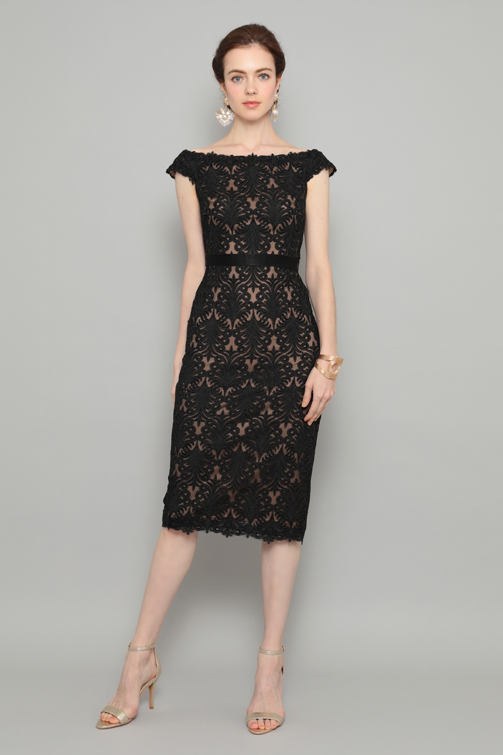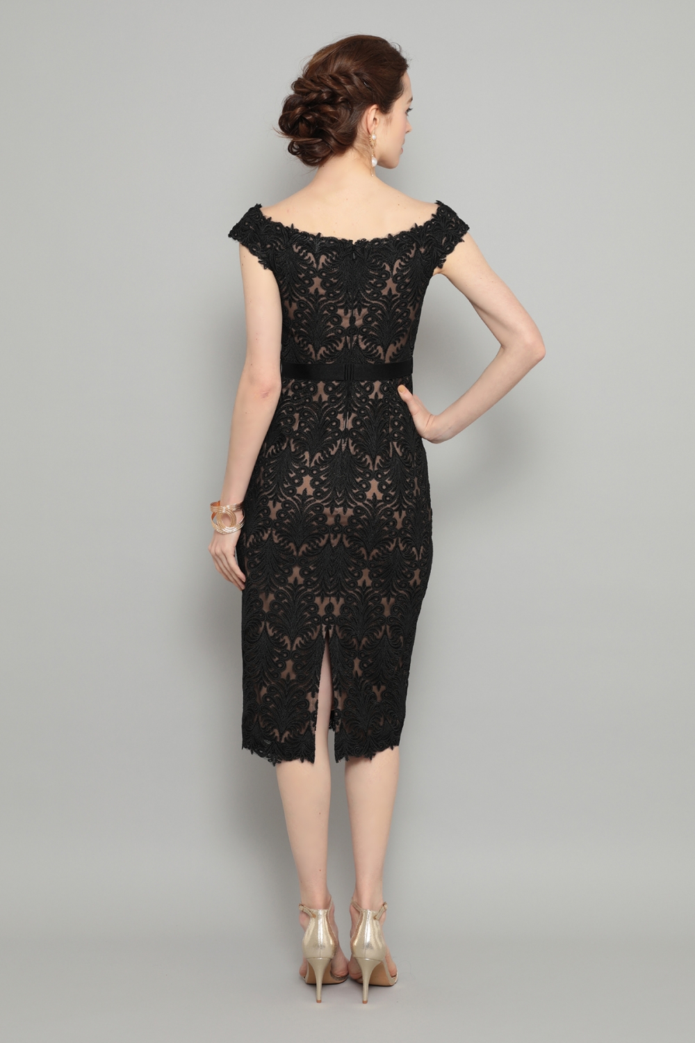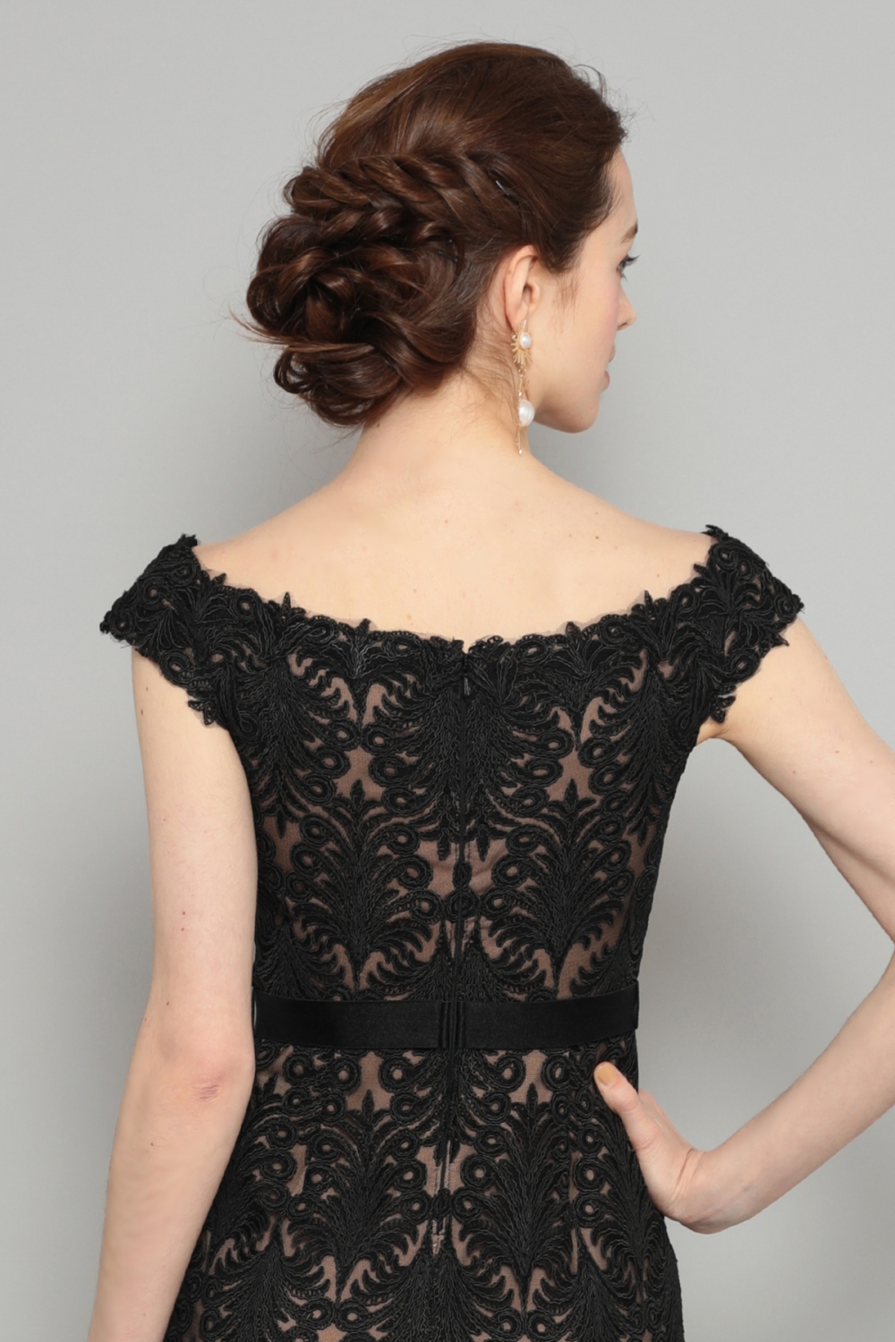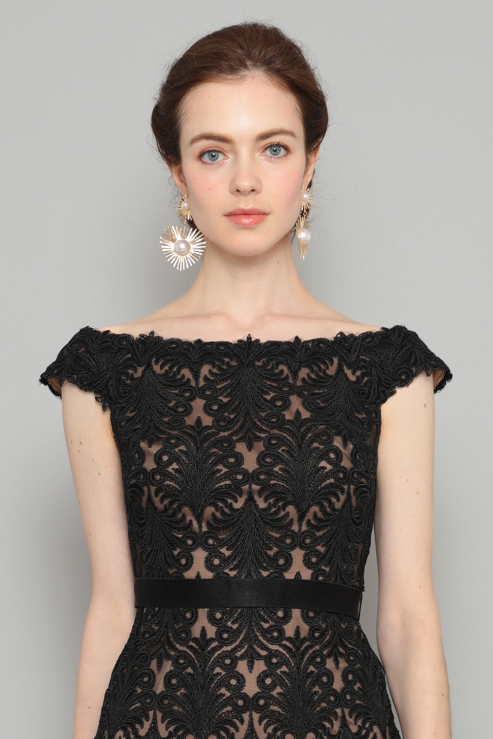 細部にまでこだわりを持って作られた、刺繍入りのチュール素材を使ったミモレ丈ドレス。オフショルダーのデザインがフェミニンな雰囲気を演出し、ウェストマークを少しだけ上に配置することにより足を長く見せます。また、スカートの後ろにはスリットが入っており、歩きやすさも考慮されています。落ち着いたブラックは、独特な存在感を放ち、パーティーや結婚式などのフォーマルなイベントにぴったりな特別な一着です。
