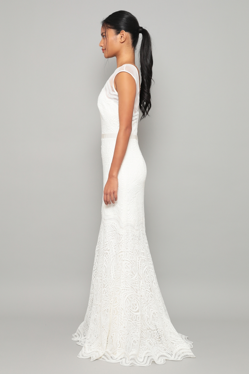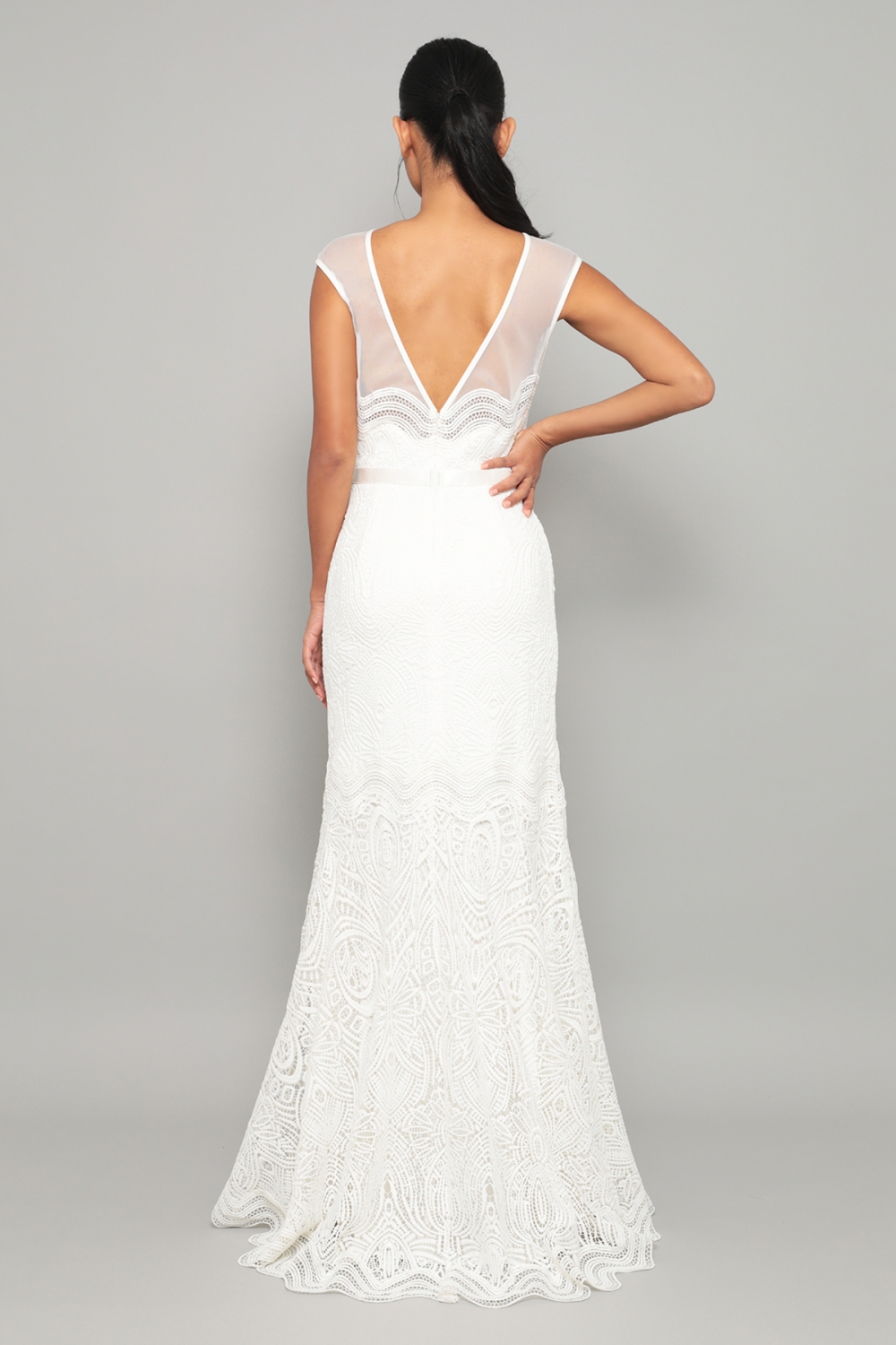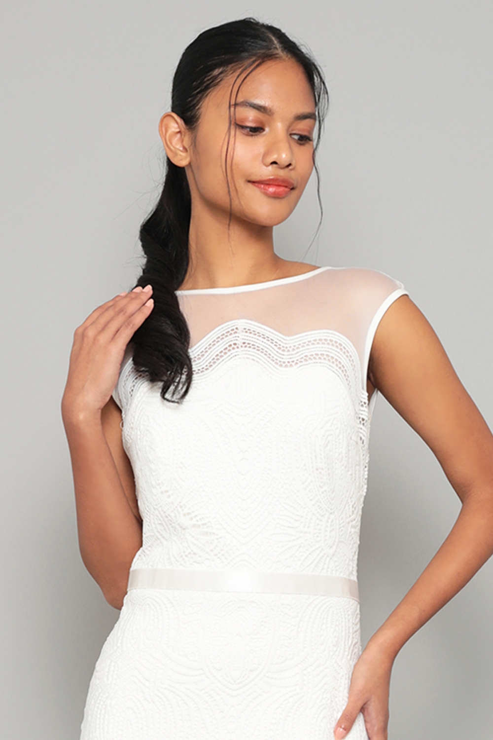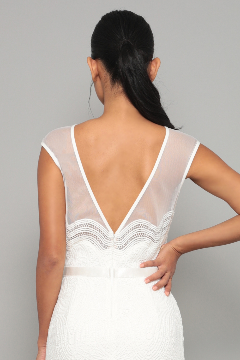 波打つような胸元とスカートの切り替え部分が愛らしいデザイン。立体的な刺繍が高級感を演出しています。おおきくVに開いたバックサイドがエレガントさを際立たせています。ブライダルだけでなく、パーティーやステージにもご着用いただけます。