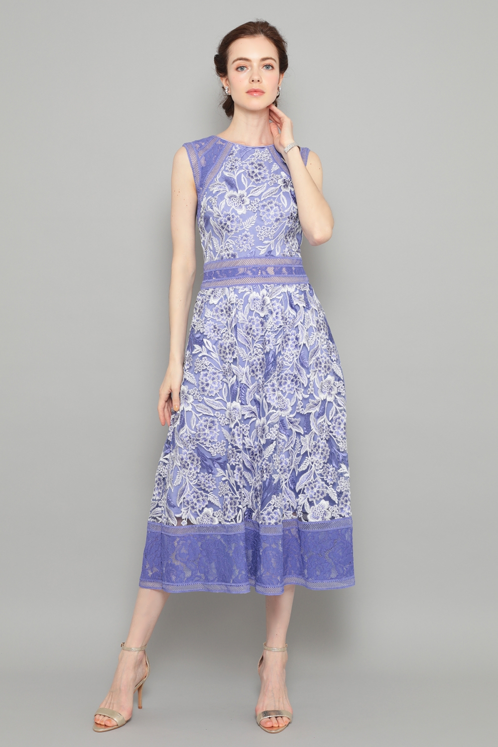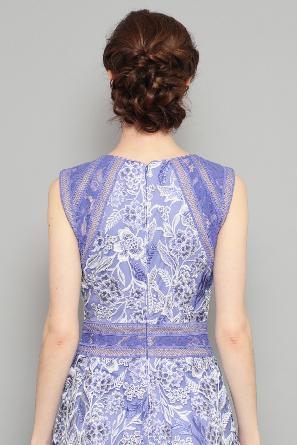 フラワー刺繍の総レースが華やかなミモレ丈のドレス。ライラックカラーが落ち着いて上品な雰囲気です。肩、ウェスト、裾に配置したトリムレースが全体を引き締め、すっきりと見せてくれます。動くたびにふんわり揺れるスカート、透け感のあるレースの切り替えが美しくフェミニンな印象。ブライダルのゲストや、カジュアルなパーティーでも、注目を浴びる一着です。