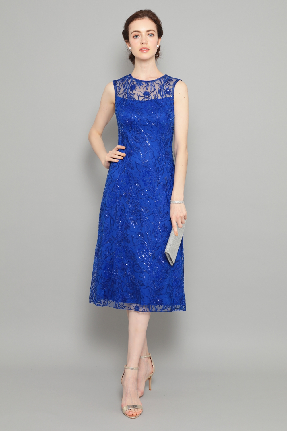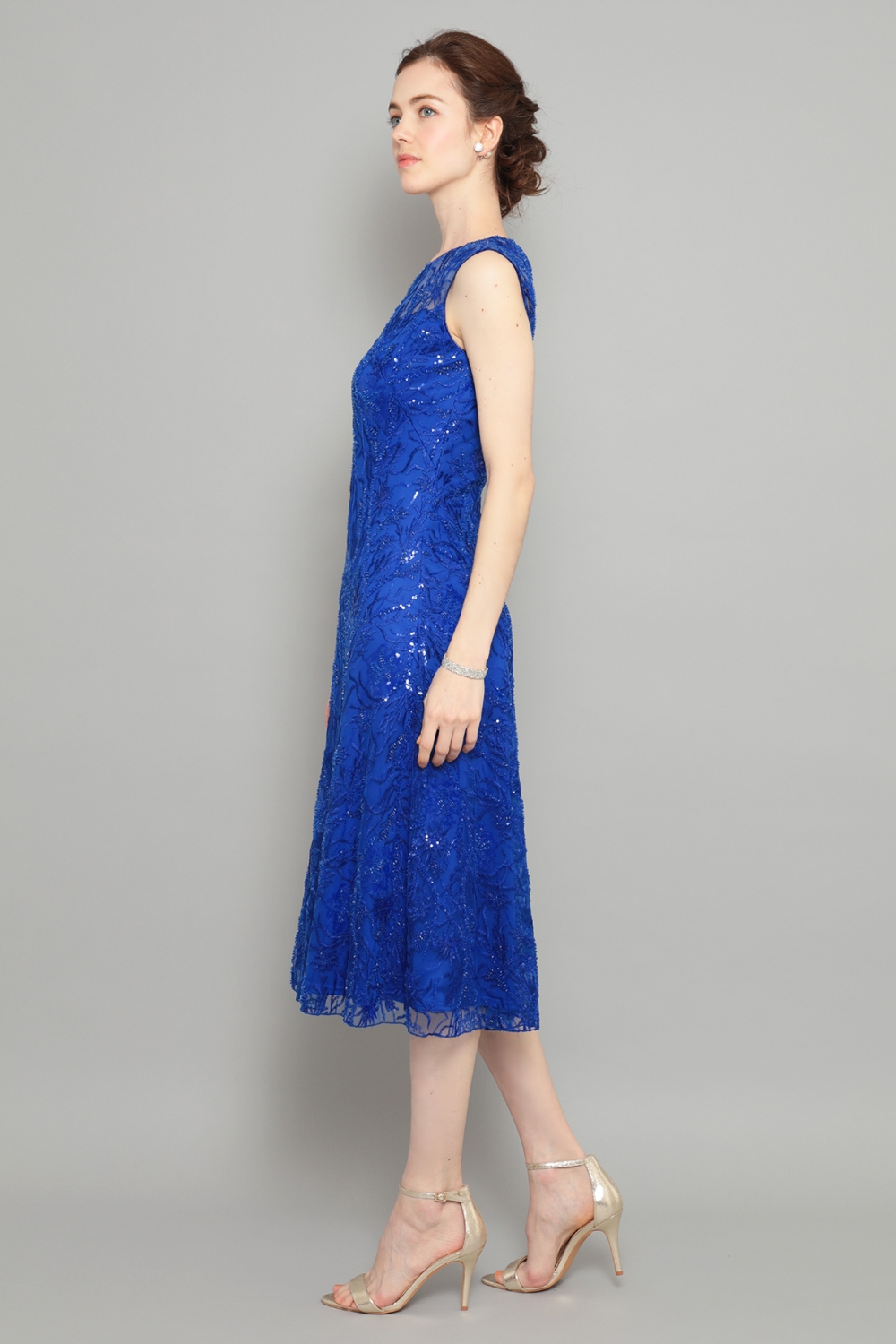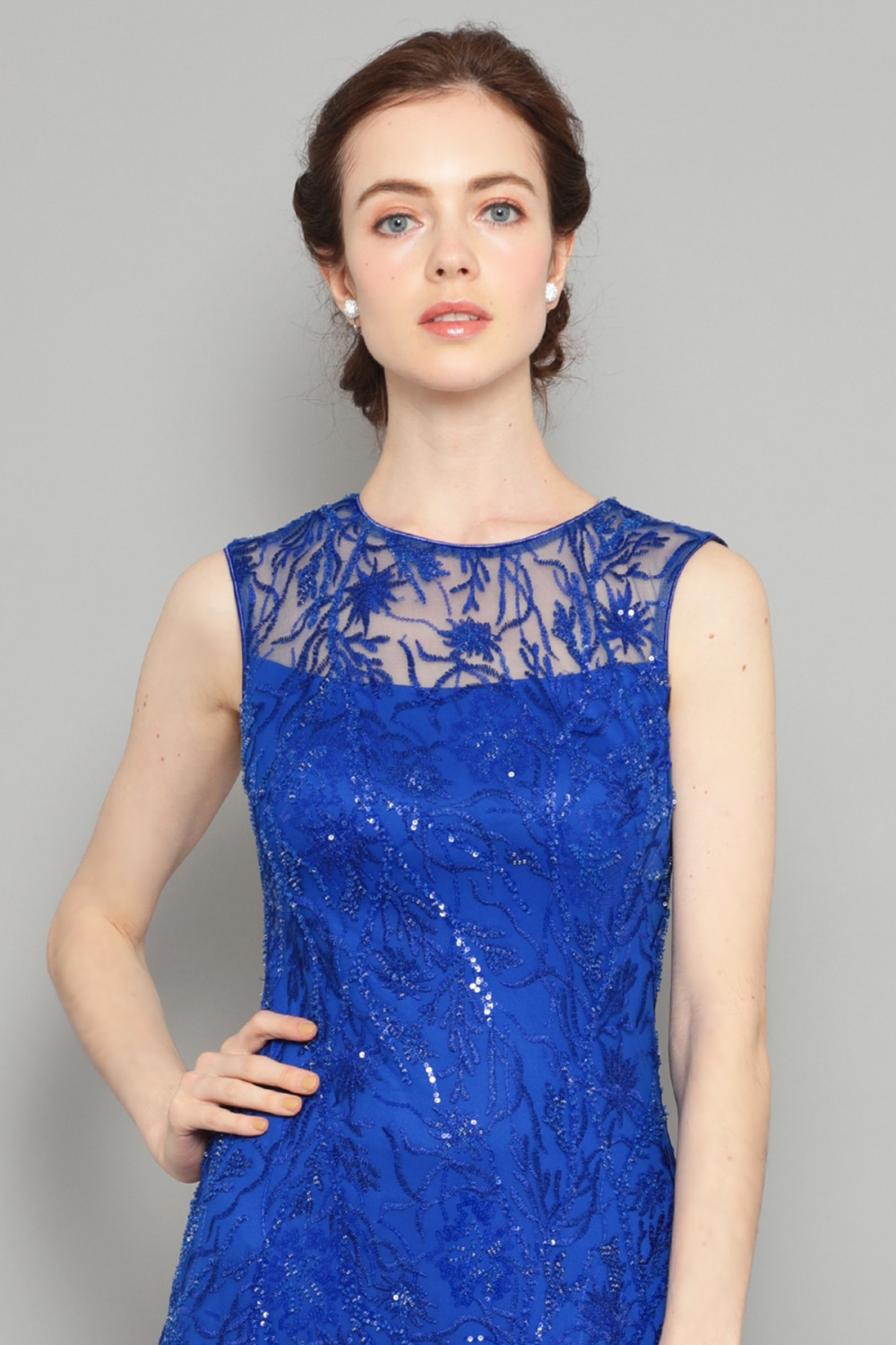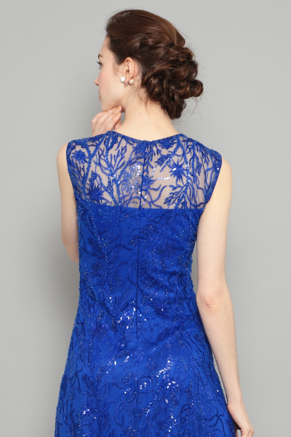 "深いブルーのレースにスパンコールがジュエリーのように輝く華やかなドレス。