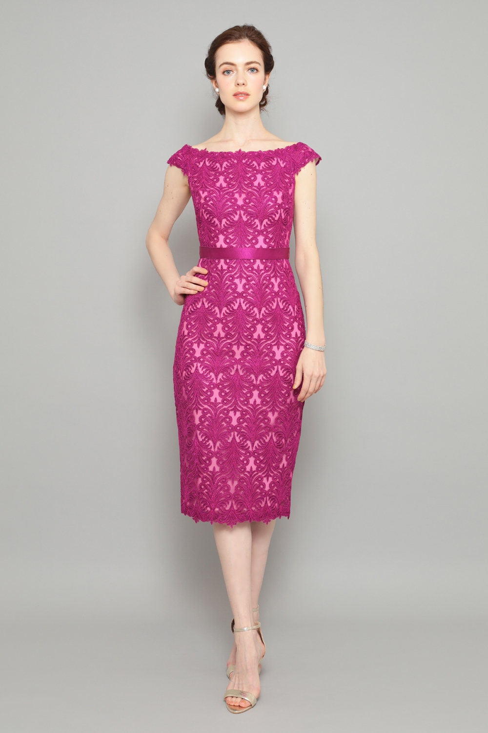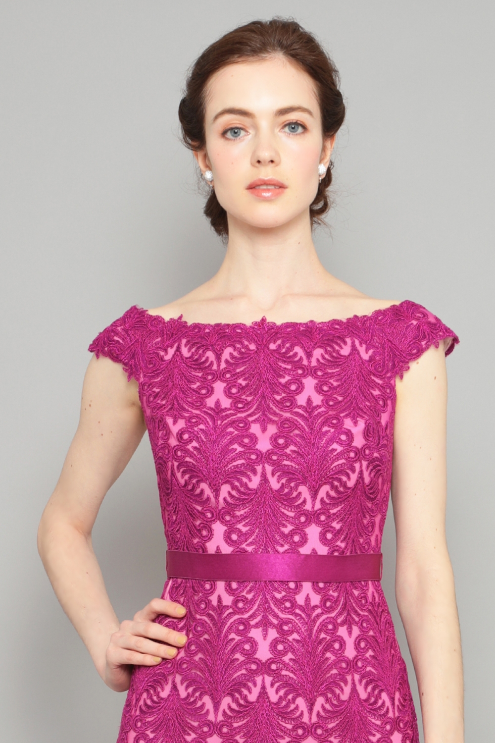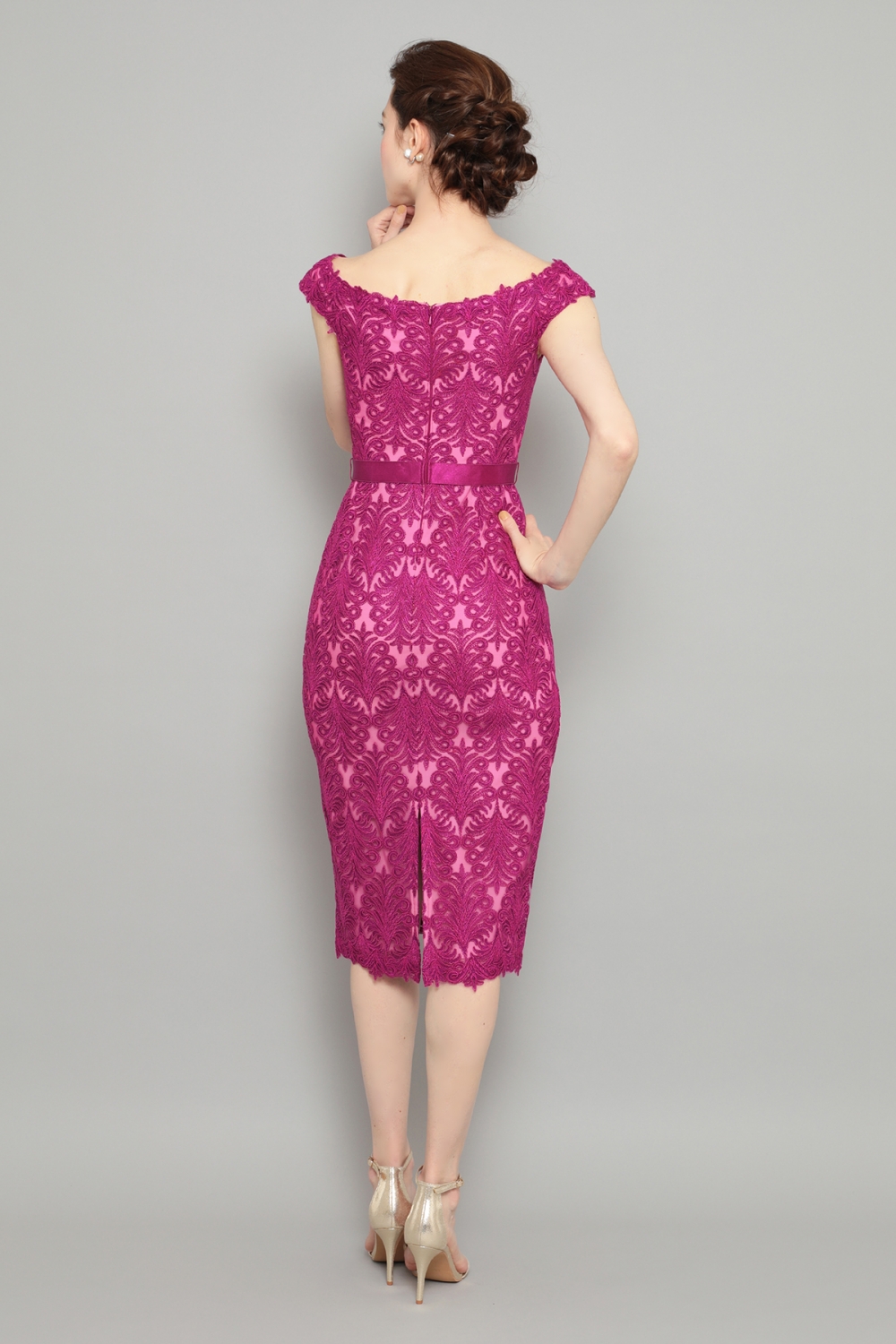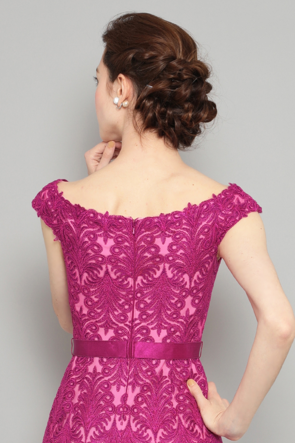高級感のある美しいレースで仕立てた、シンプルなデザインのドレス。オフショルダーのデザインがフェミニンな雰囲気を演出し、ウェストマークを少しだけ上に配置することにより足を長く見せます。また、スカートの後ろにはスリットが入っており、歩きやすさも考慮されています。裏地を同系色にすることで派手になりすぎず、ウォーターリリーの落ち着いたピンクが柔らかな印象です。パーティーやフォーマルなイベントだけでなく、ランチやディナーへもご着用いただけます。