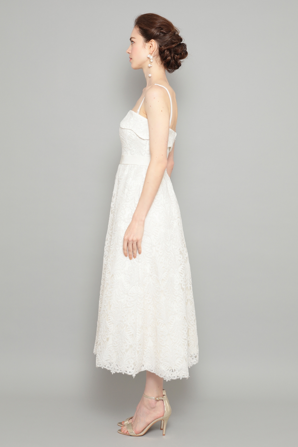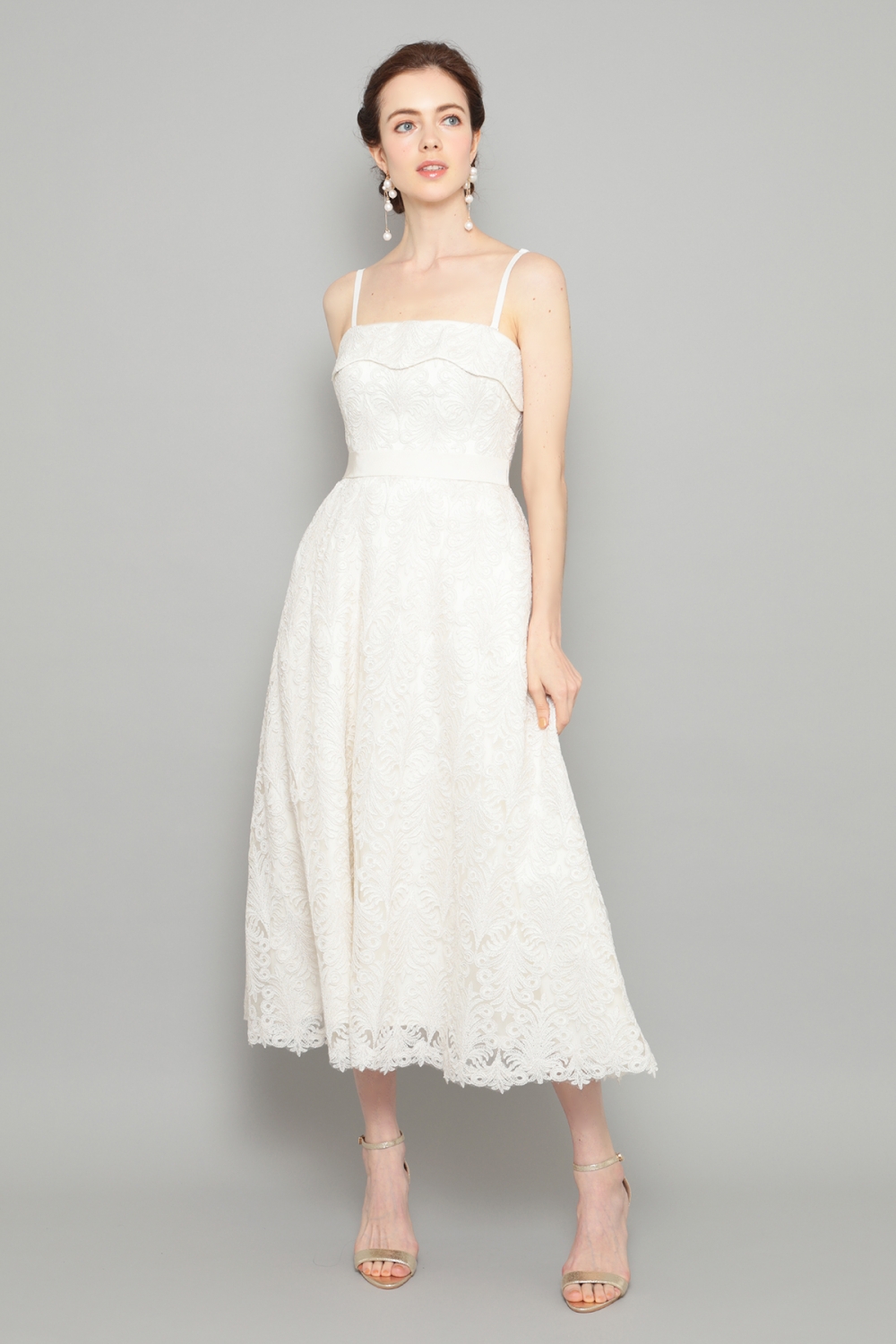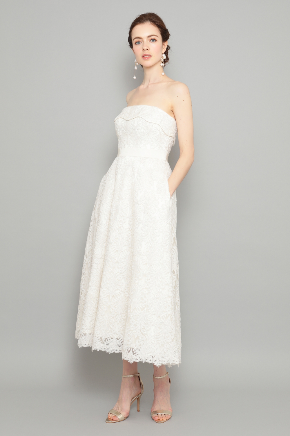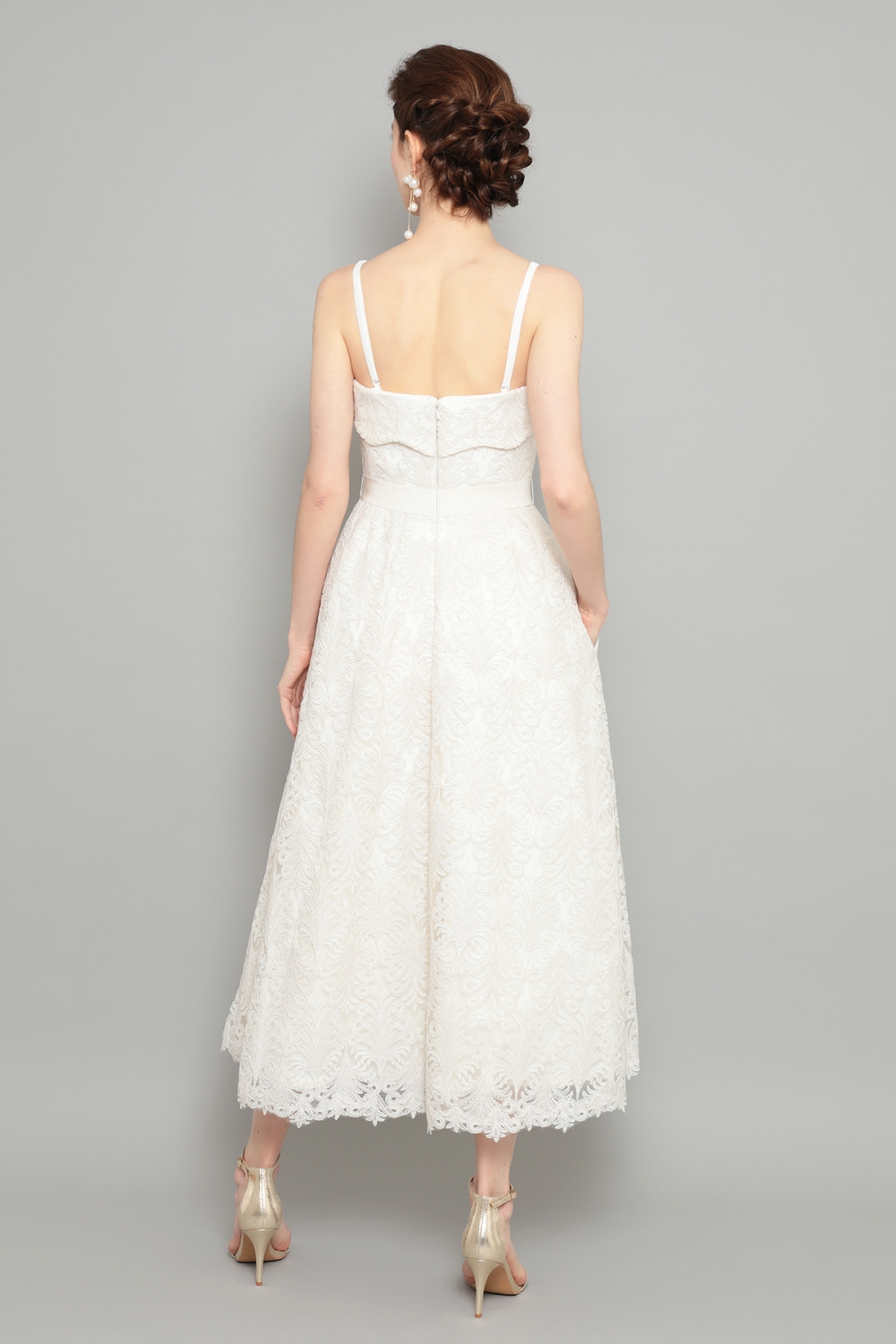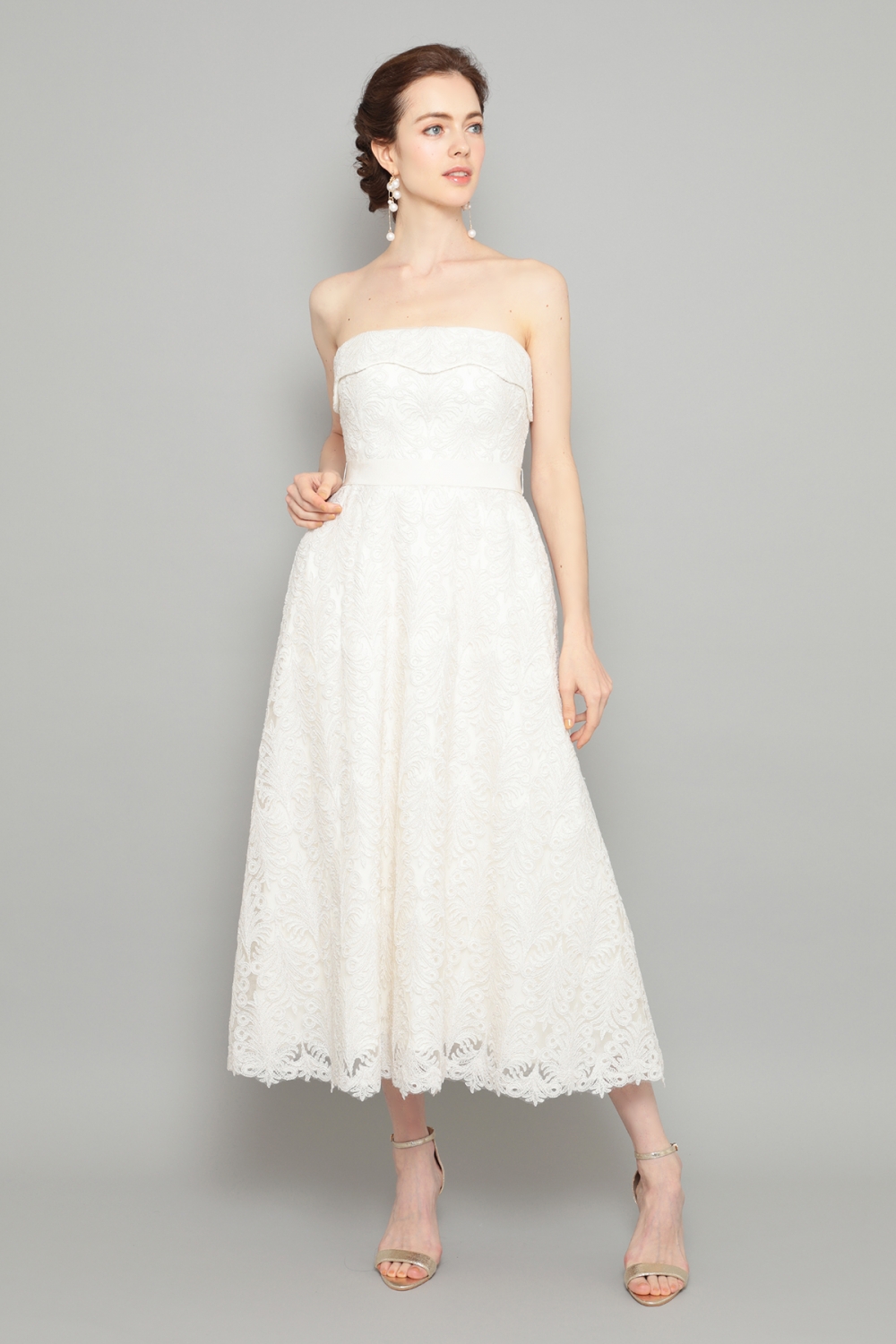 美しい刺繍入りチュールのベアトップドレス。取り外しができるストラップ付。内部にはビスチェが付いているため、しっかりとフィットし、ストラップなしでもずれる心配がありません。ふんわりと広がるスカートがロマンチックです。パーティーや特別なイベント、結婚式の二次会のドレスとしてもご着用いただけます。 "モデルサイズ 身長175cm B:84cm W:59cm H:89cm /サイズ0着用" ※日本人の平均身長158cmの方はくるぶしより少し上の丈となります。 ■新作商品一覧はこちら■ □ミディアムドレス一覧はこちら□ ■アイボリーの商品一覧はこちら■