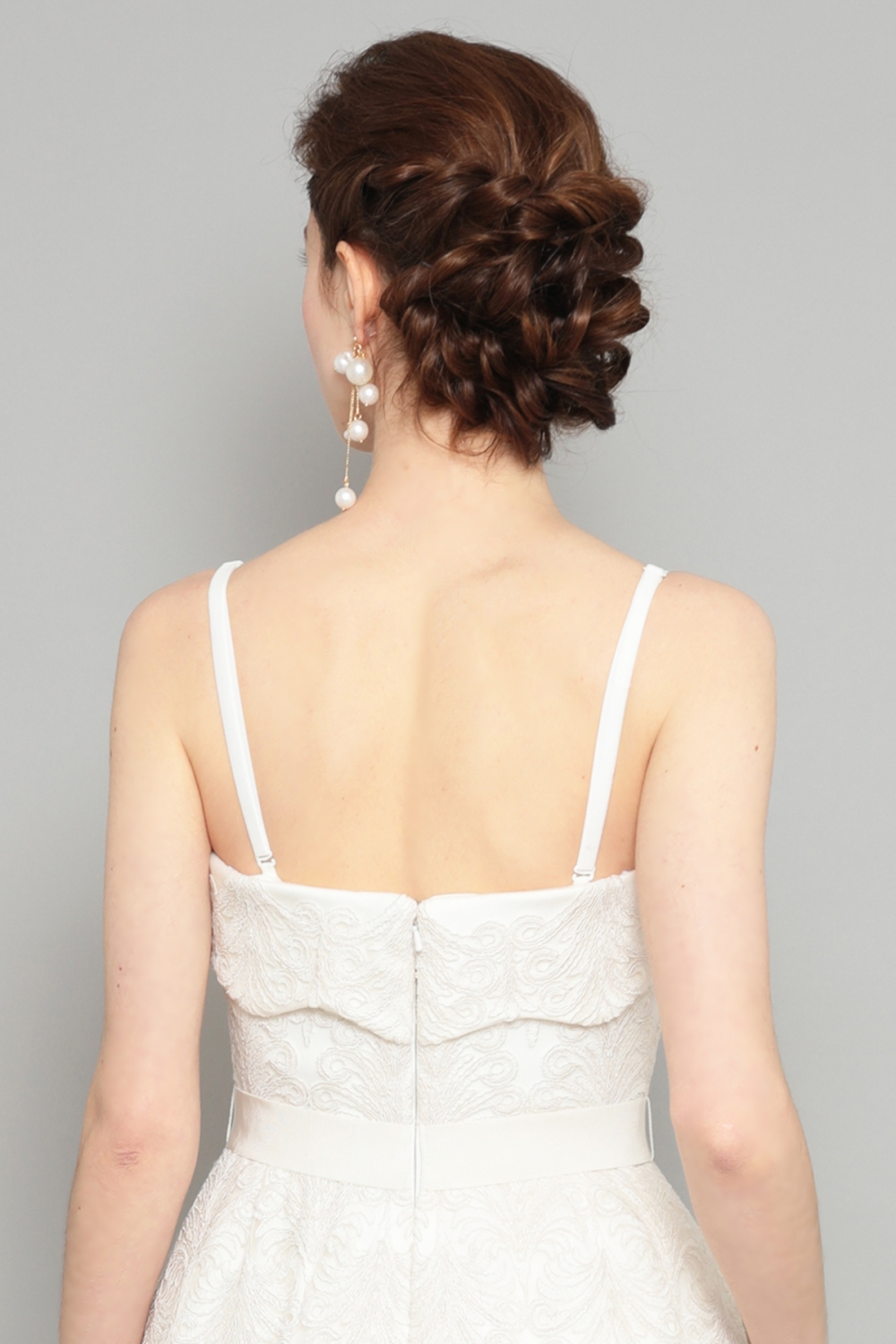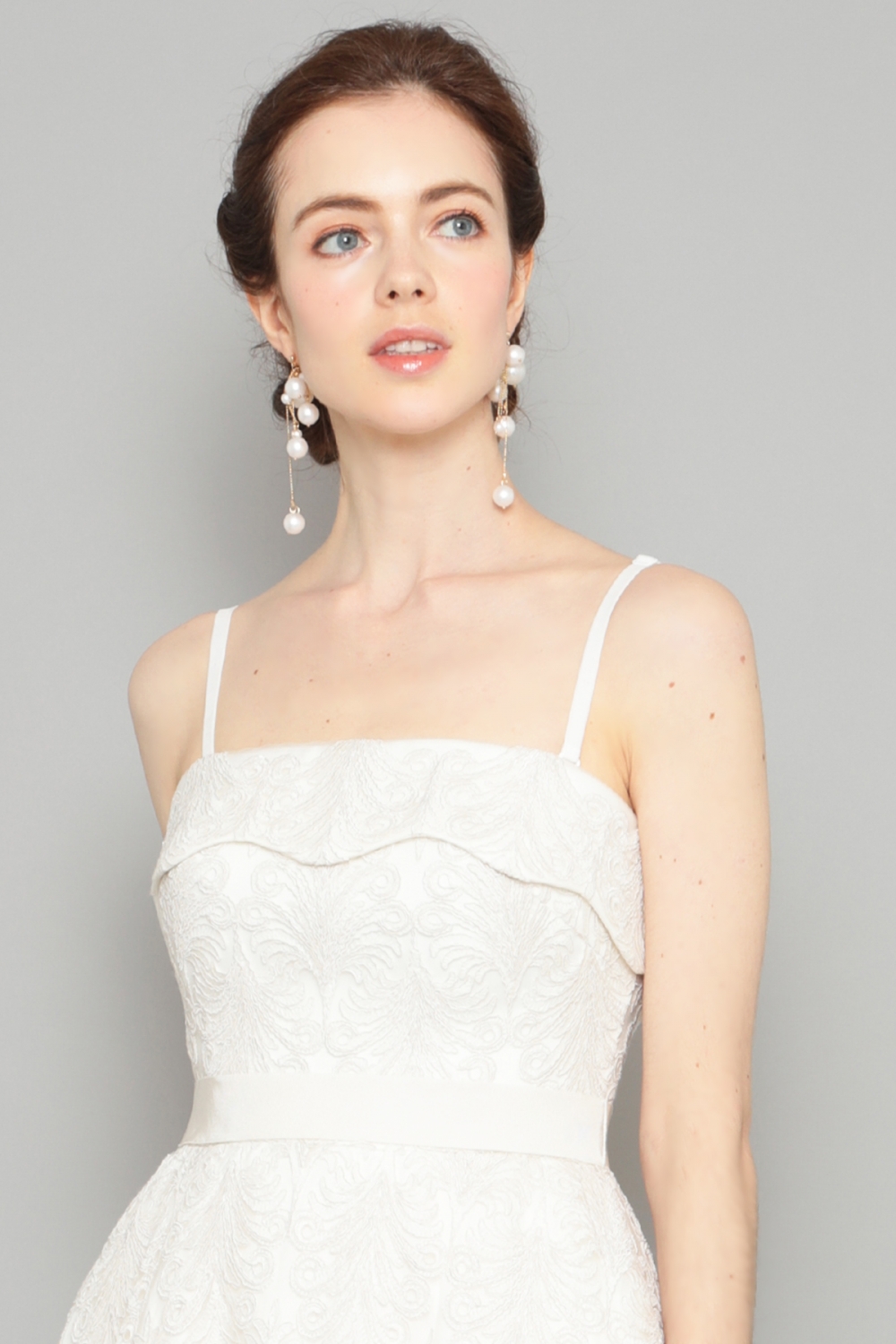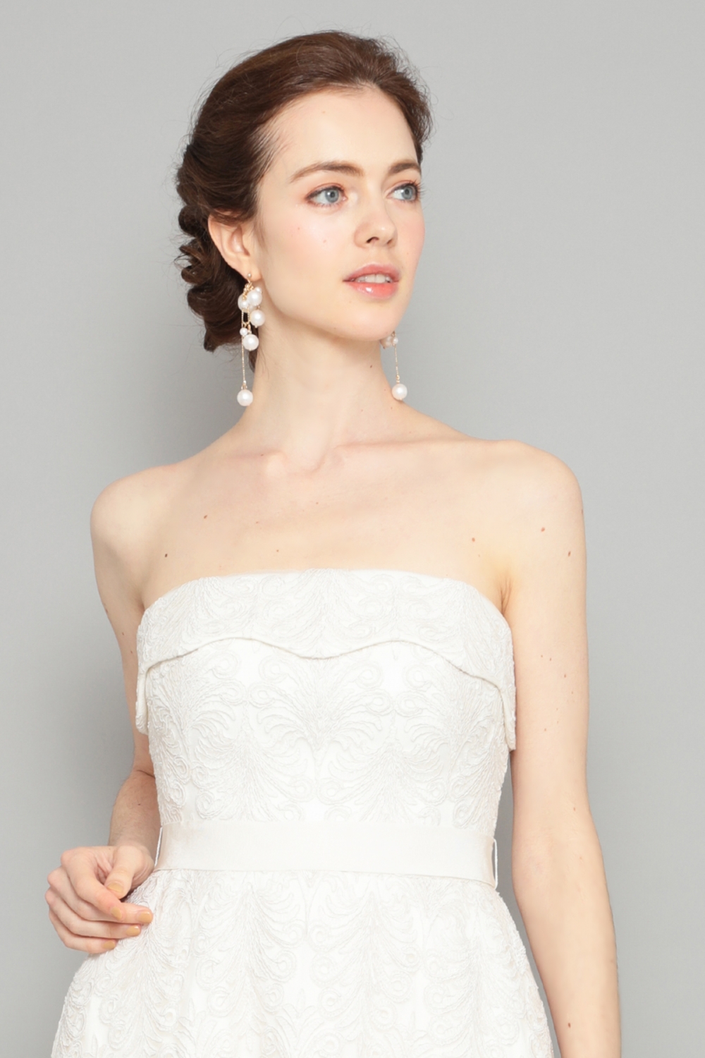 美しい刺繍入りチュールのベアトップドレス。取り外しができるストラップ付。内部にはビスチェが付いているため、しっかりとフィットし、ストラップなしでもずれる心配がありません。ふんわりと広がるスカートがロマンチックです。パーティーや特別なイベント、結婚式の二次会のドレスとしてもご着用いただけます。