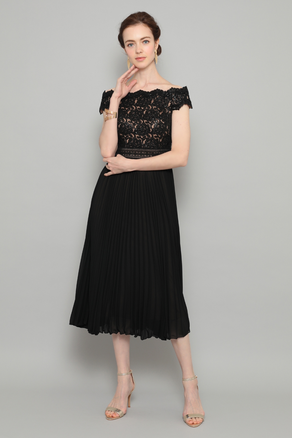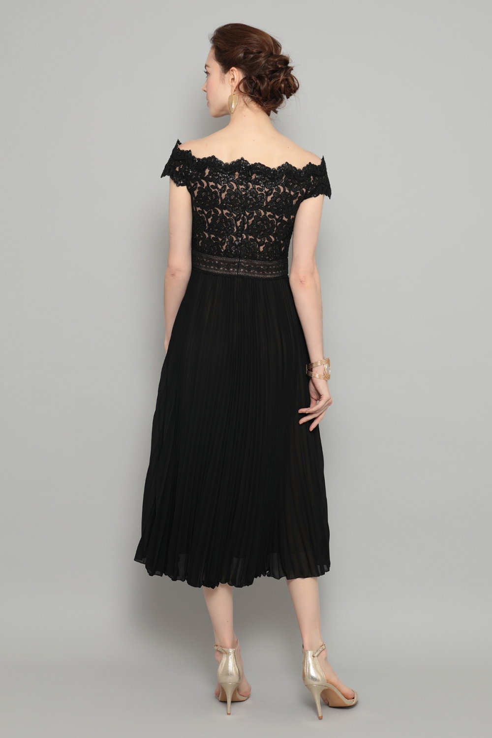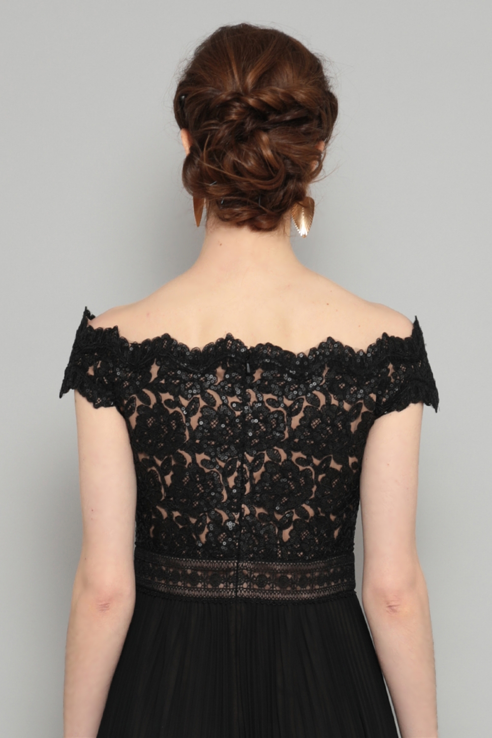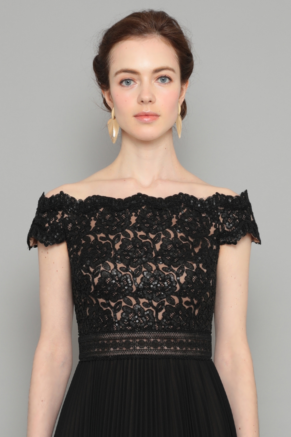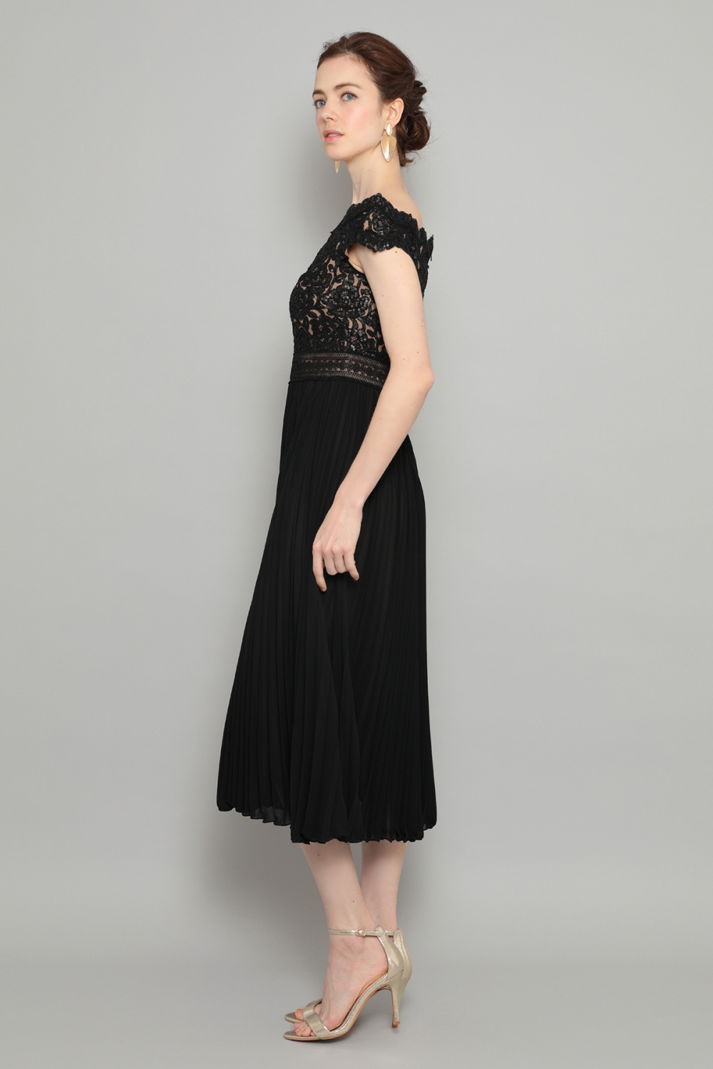 フラワーレース素材にマットなスパンコール刺繍を施したボディーに、ネックラインからデコルテを美しく見せるボートネックと肩を華奢に見せるキャップスリーブがクラシックな美しさを引き立てます。ウエスト部分には繊細なトリムレースを配置し、スリムなシルエットを強調します。歩くたびにふわりと揺れるプリーツスカートがフェミニンな雰囲気です。さまざまなフォーマルなイベントやカクテルパーティにピッタリです。