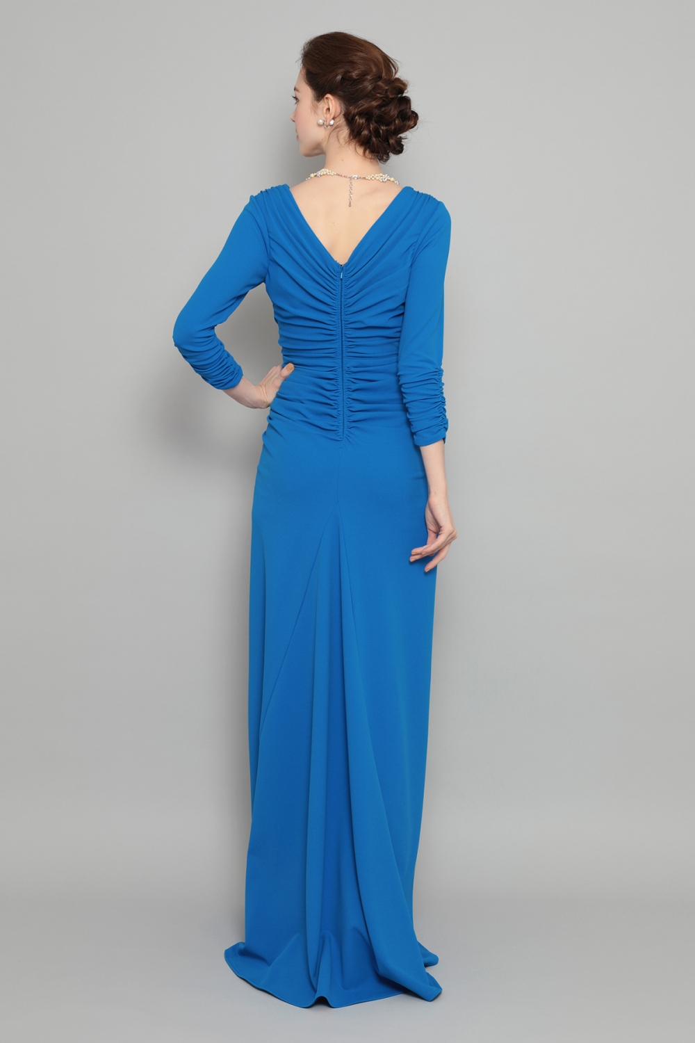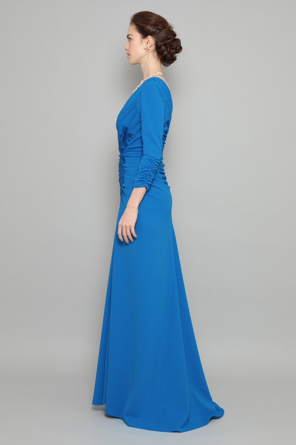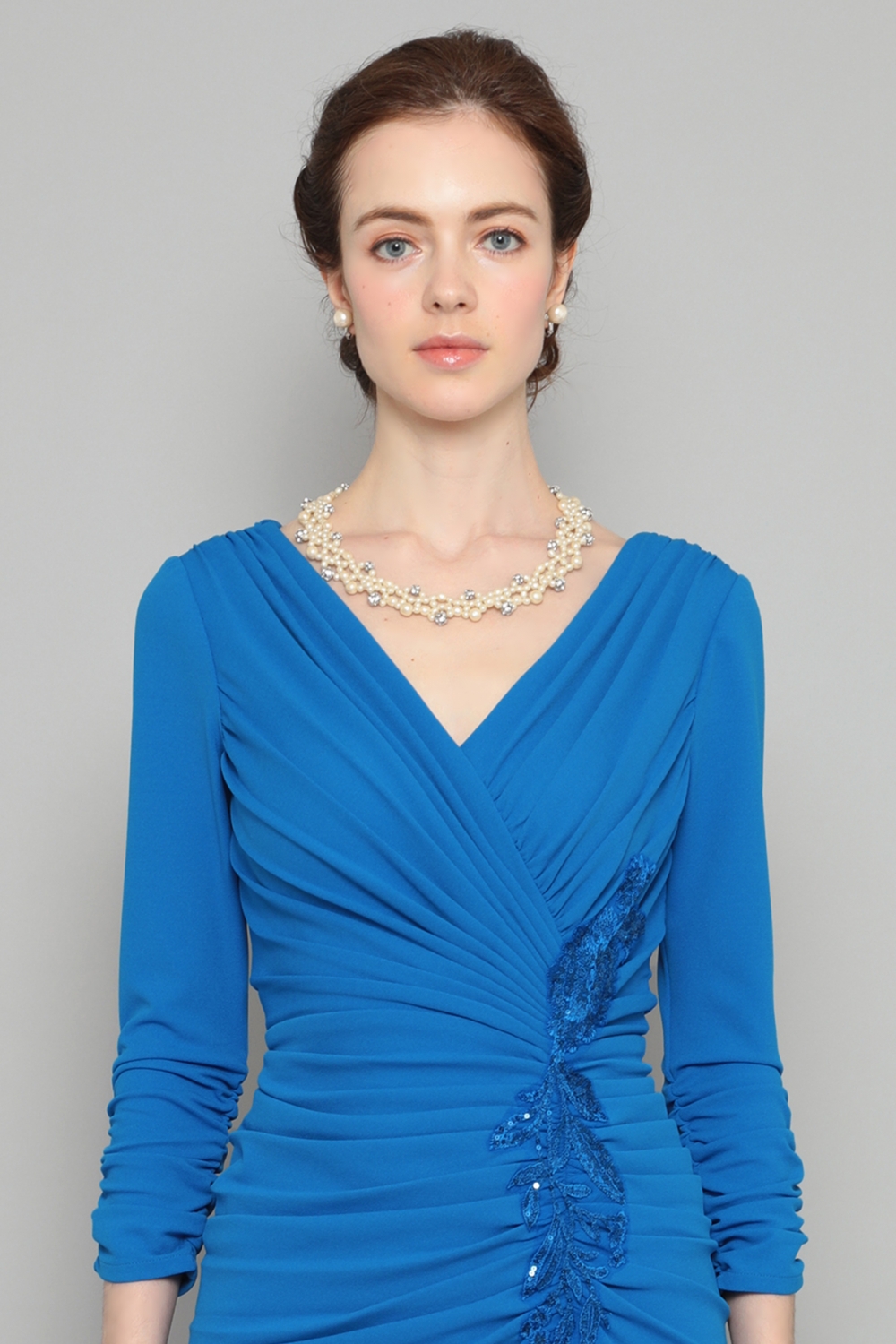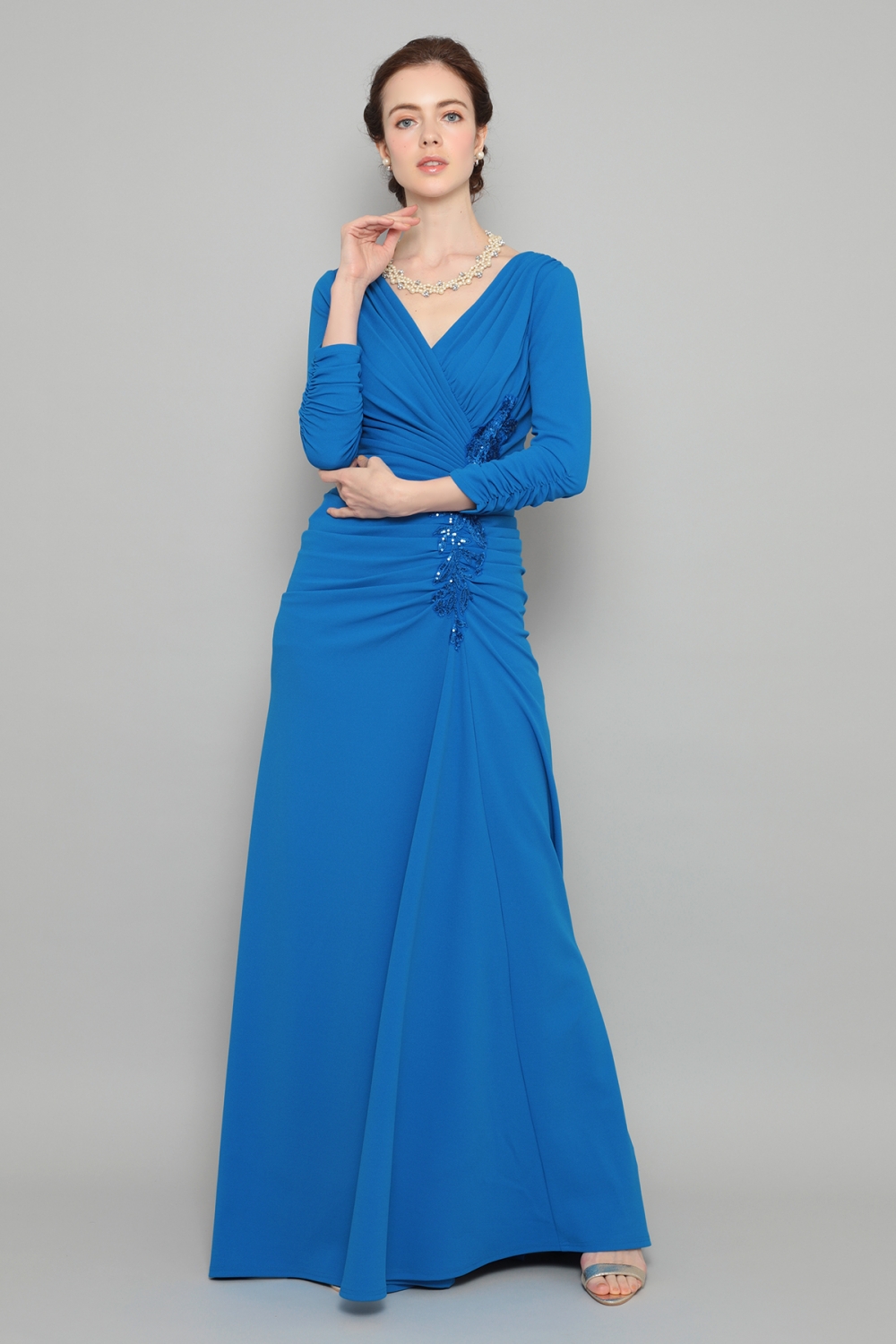鮮やかなブルーが美しいロングドレス。Vネックが胸元をすっきり見せてくれます。胸元からウェストにかけて斜めに入ったドレープには華やかな刺繍が施され、エレガントです。袖にもドレープのディテールが施され、全体のデザインと美しく調和しています。着心地のいいクレープジャージー生地で、動きやすく、疲れません。特別なイベントや、パーティーにぴったりです。