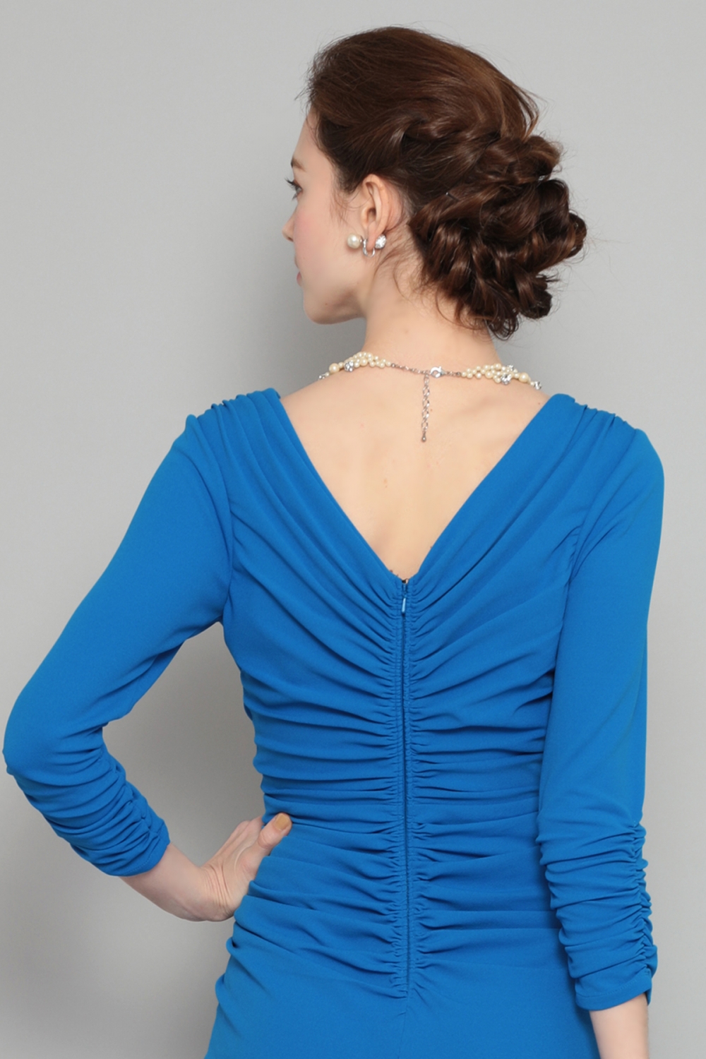 鮮やかなブルーが美しいロングドレス。Vネックが胸元をすっきり見せてくれます。胸元からウェストにかけて斜めに入ったドレープには華やかな刺繍が施され、エレガントです。袖にもドレープのディテールが施され、全体のデザインと美しく調和しています。着心地のいいクレープジャージー生地で、動きやすく、疲れません。特別なイベントや、パーティーにぴったりです。 モデルサイズ 身長175cm B:84cm W:59cm H:89cm /サイズ0着用 ■新作商品一覧はこちら■ □ロングドレス一覧はこちら□ ■ブルーの商品一覧はこちら■