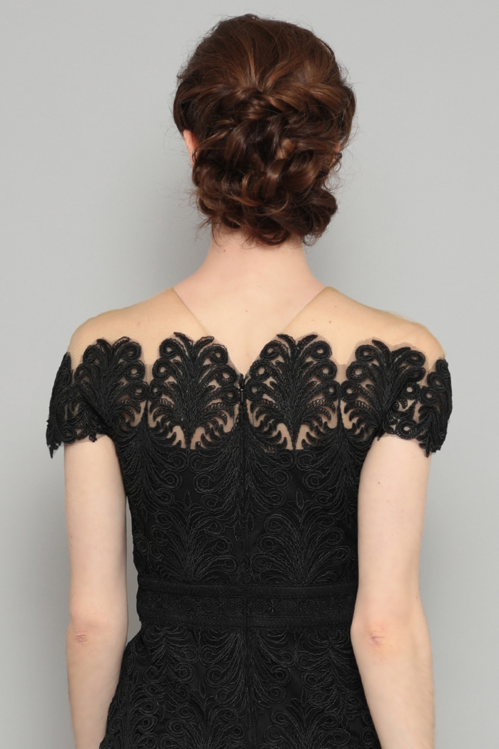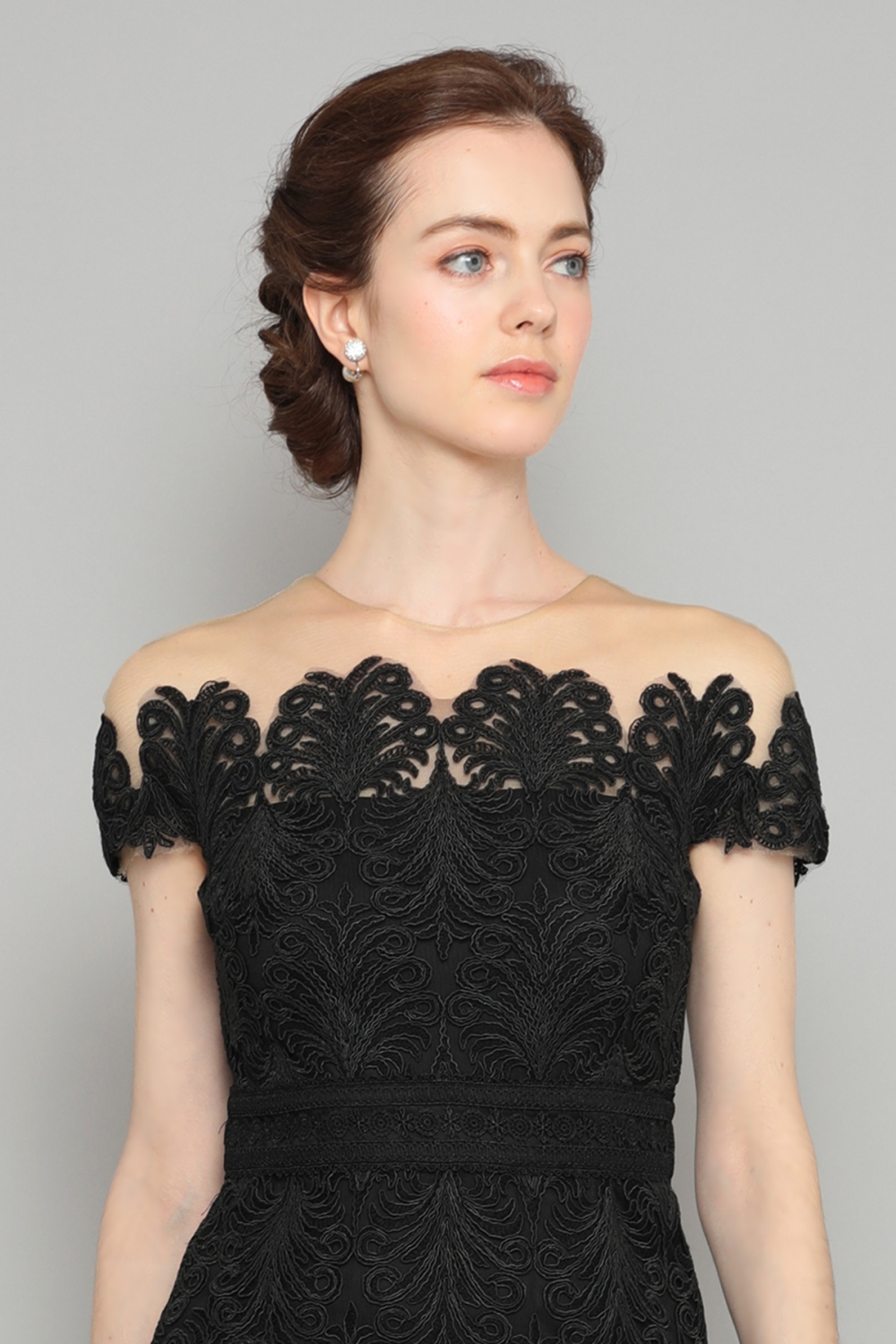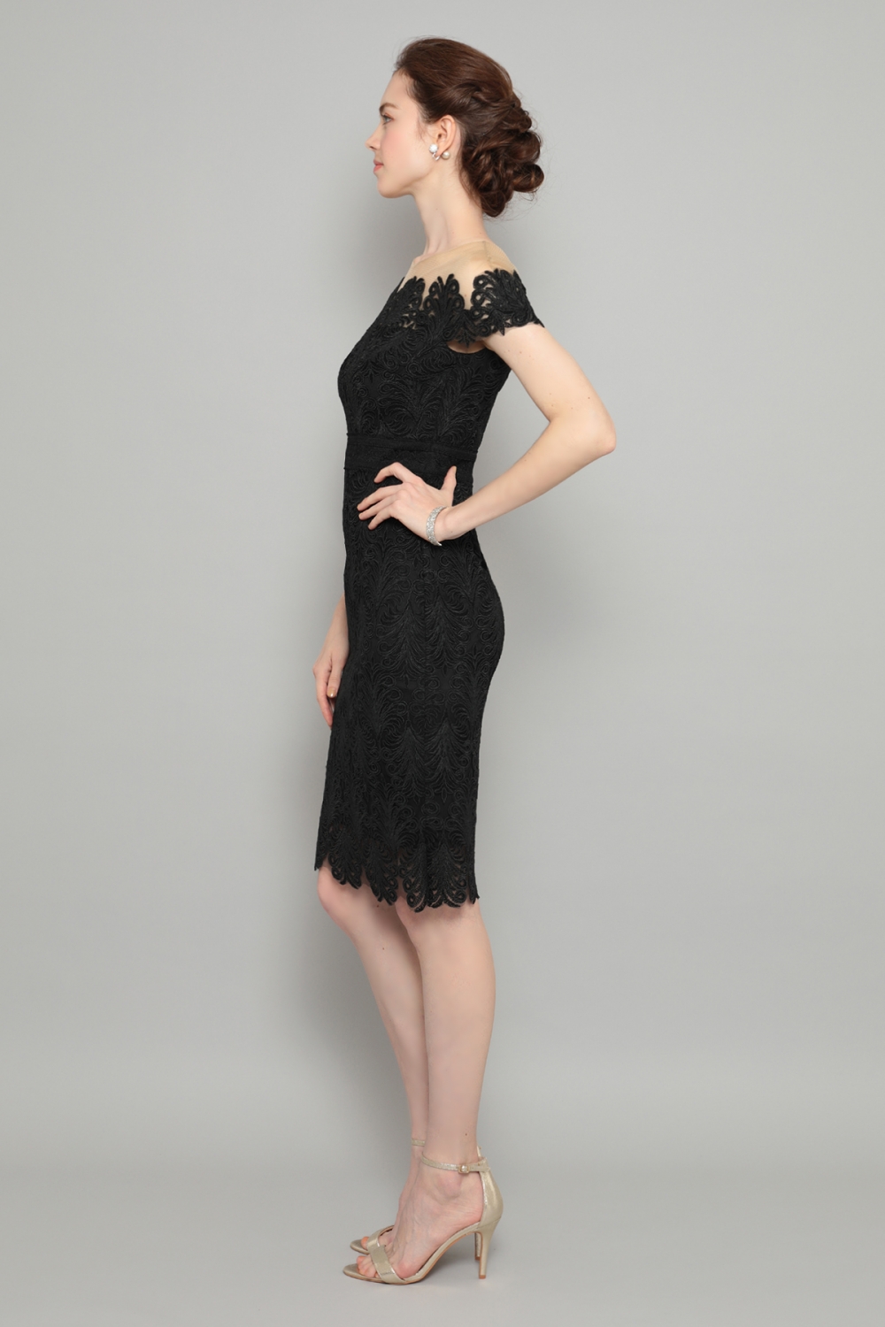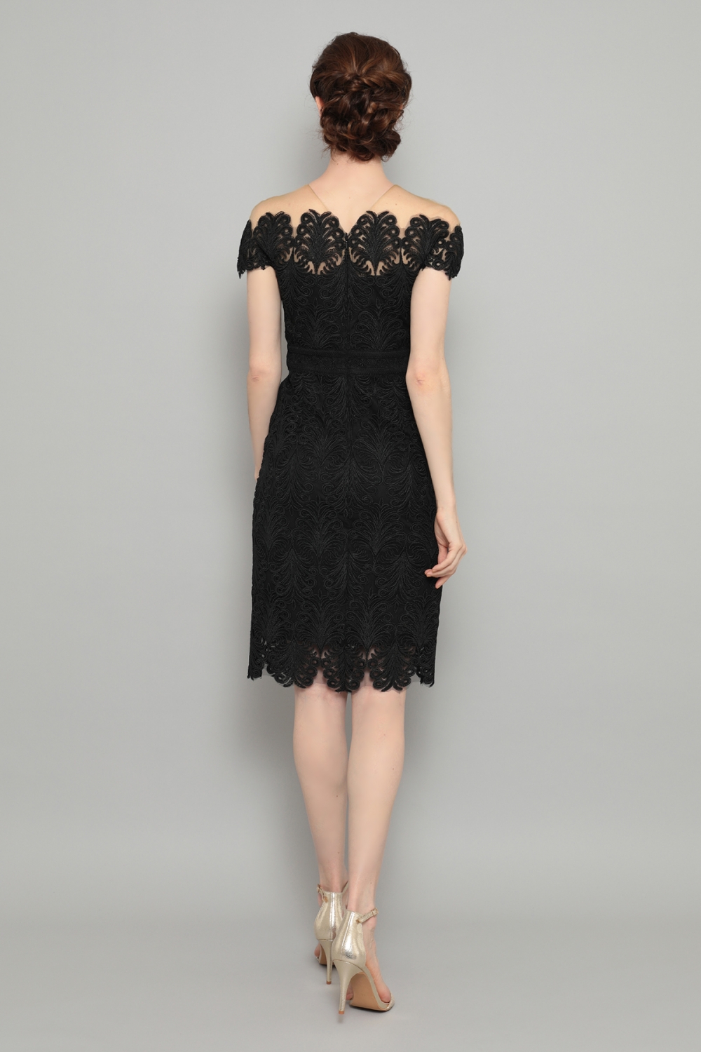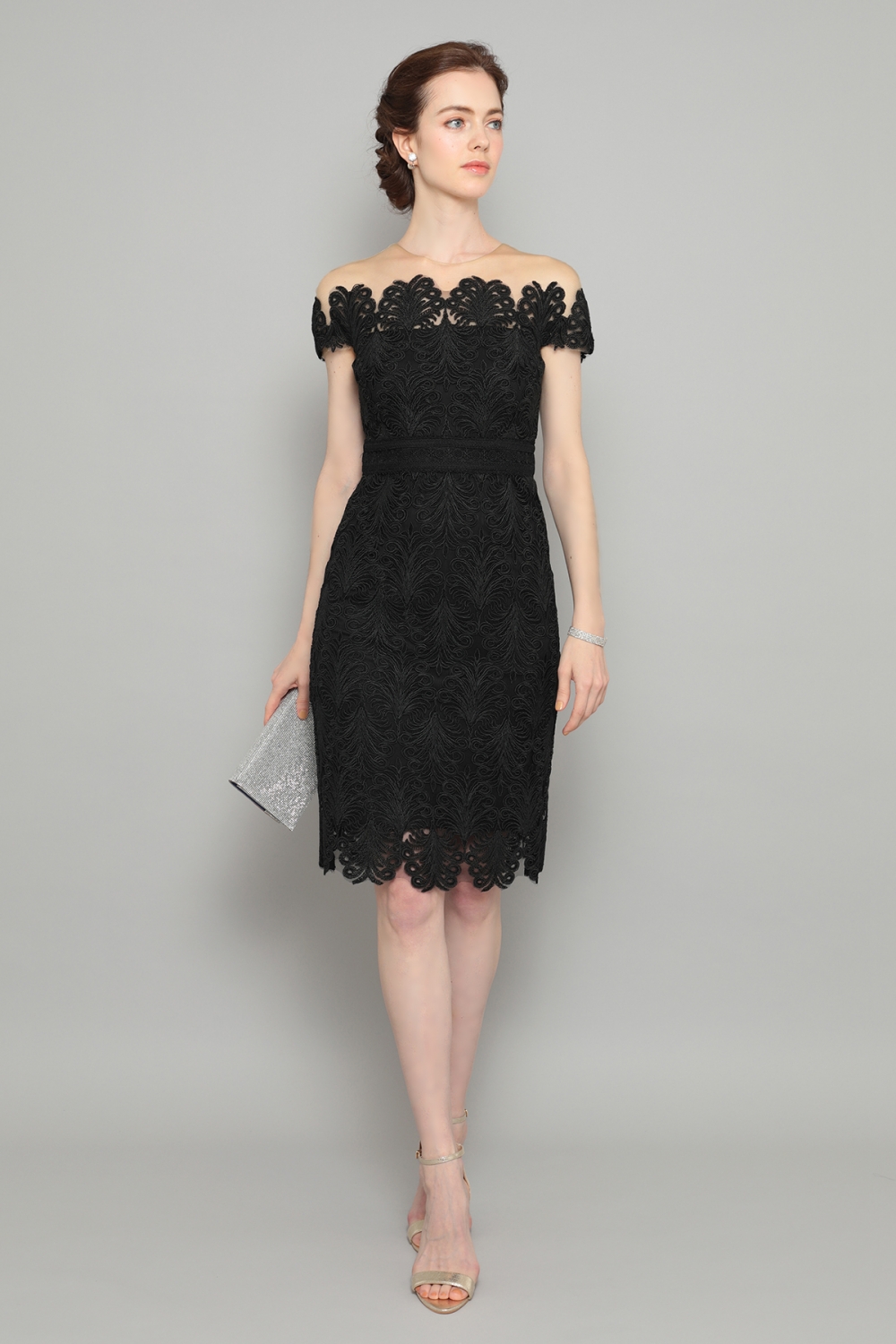タイトなシルエットの総レースミディアムドレス。オフショルダーのネックラインにはチュールが付けられていて、ずれ落ちることはありません。胸元から袖口は、繊細なスカラップデザインで飾られ、ロマンティックな雰囲気です。スカートの裾部分も同じスカラップで縁取られ、全体を引き締めます。ウェストマークで足を長く見せ、すっきりとした印象。シンプルなジャケットを合わせれば、デイウェアーとして、大ぶりのイヤリングとクラッチバッグでパーティーへも、色々な場面で活躍する一着です。