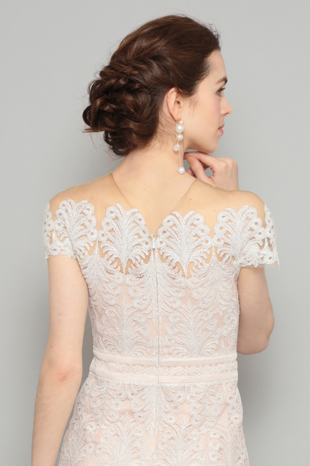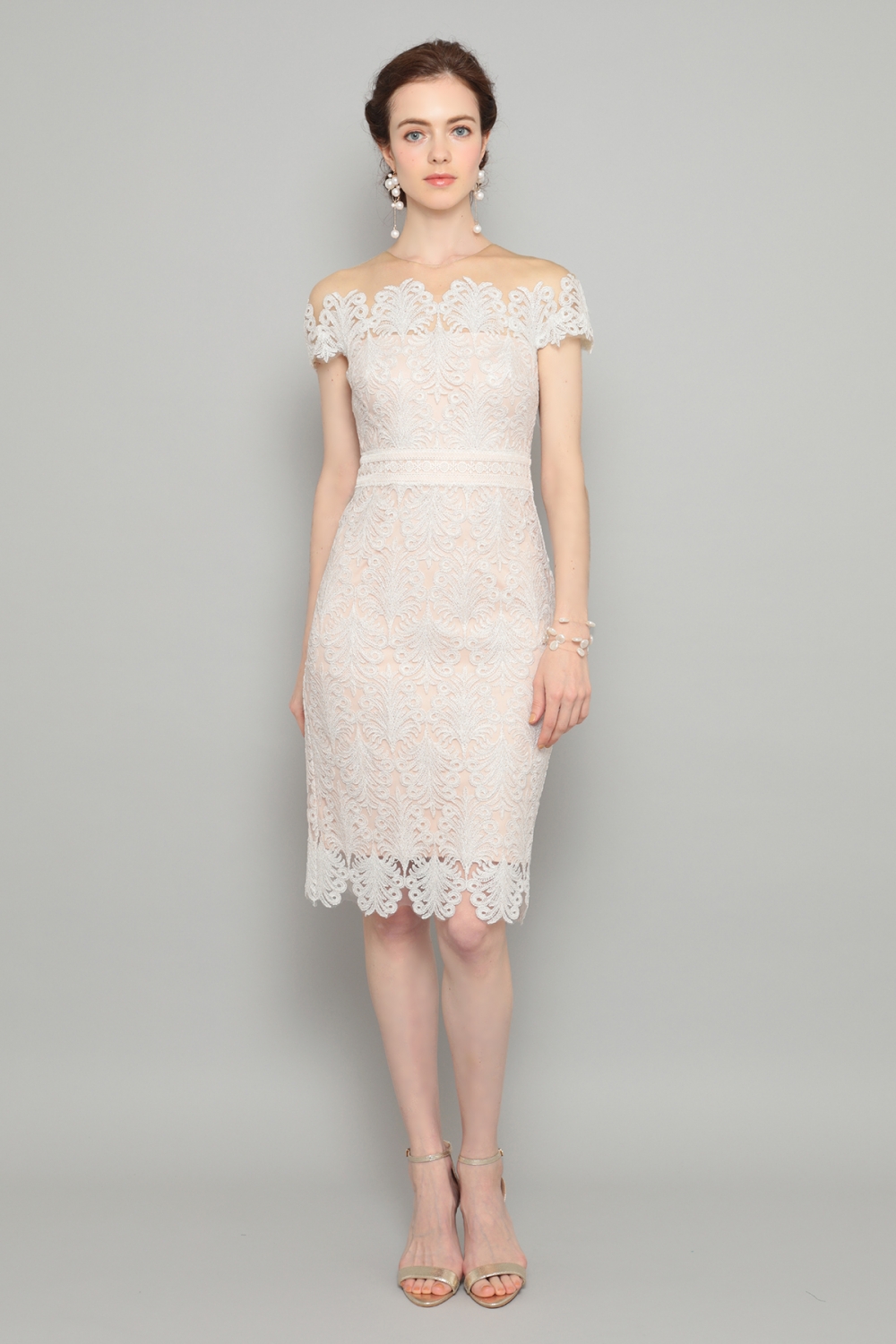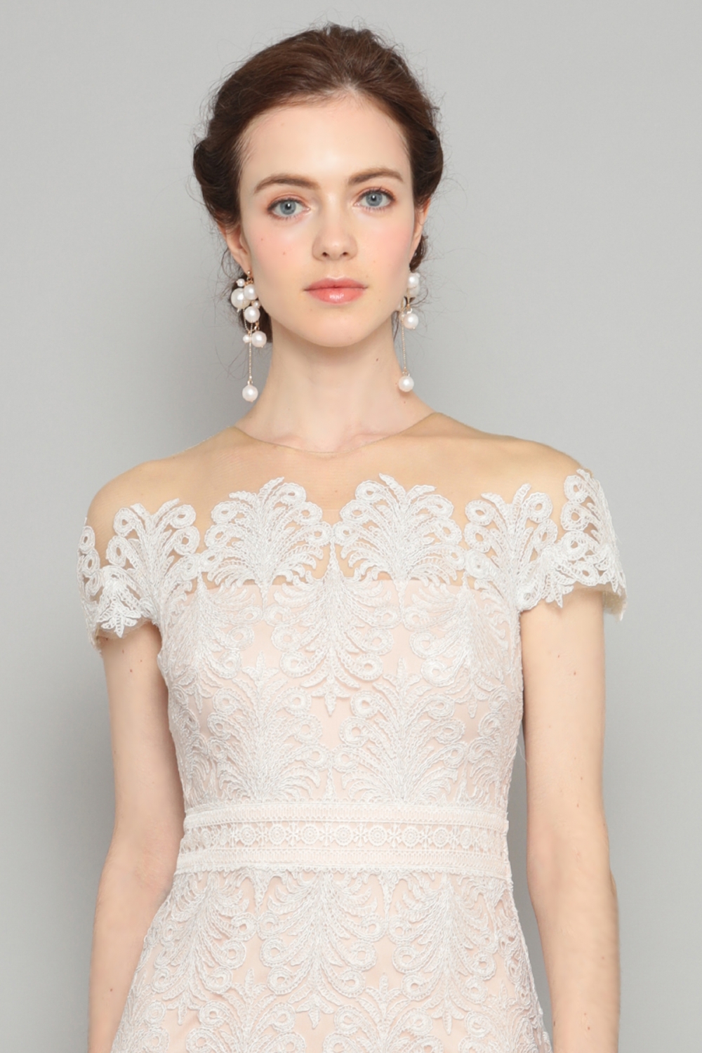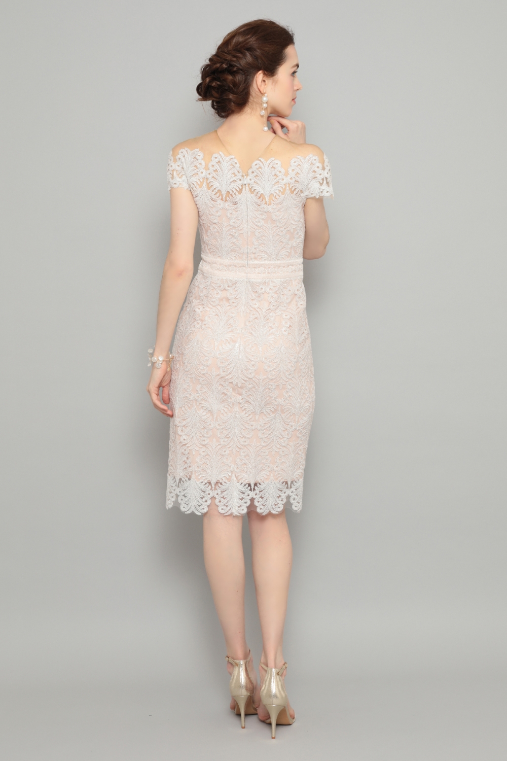 タイトなシルエットの総レースミディアムドレス。オフショルダーのネックラインにはチュールが付けられていて、ずれ落ちることはありません。胸元から袖口は、繊細なスカラップデザインで飾られ、ロマンティックな雰囲気です。スカートの裾部分も同じスカラップで縁取られ、全体を引き締めます。ウェストマークで足を長く見せ、すっきりとした印象。シンプルなジャケットを合わせれば、デイウェアーとして、大ぶりのイヤリングとクラッチバッグでパーティーへも、色々な場面で活躍する一着です。