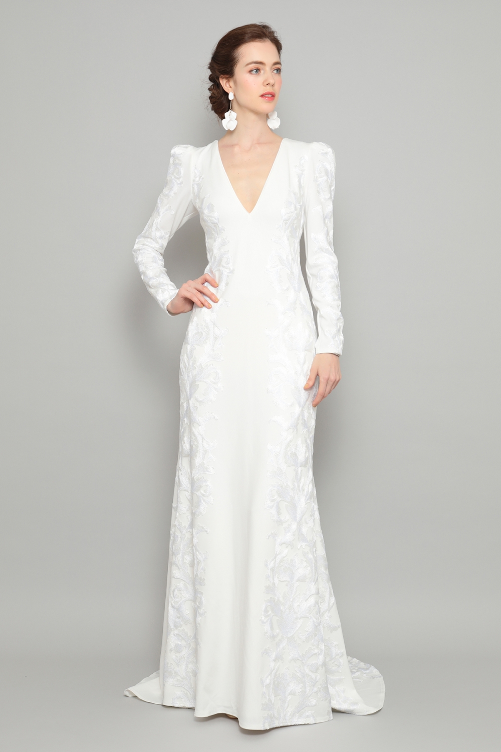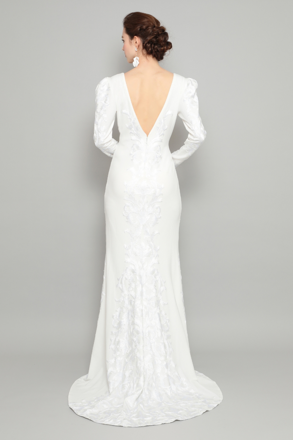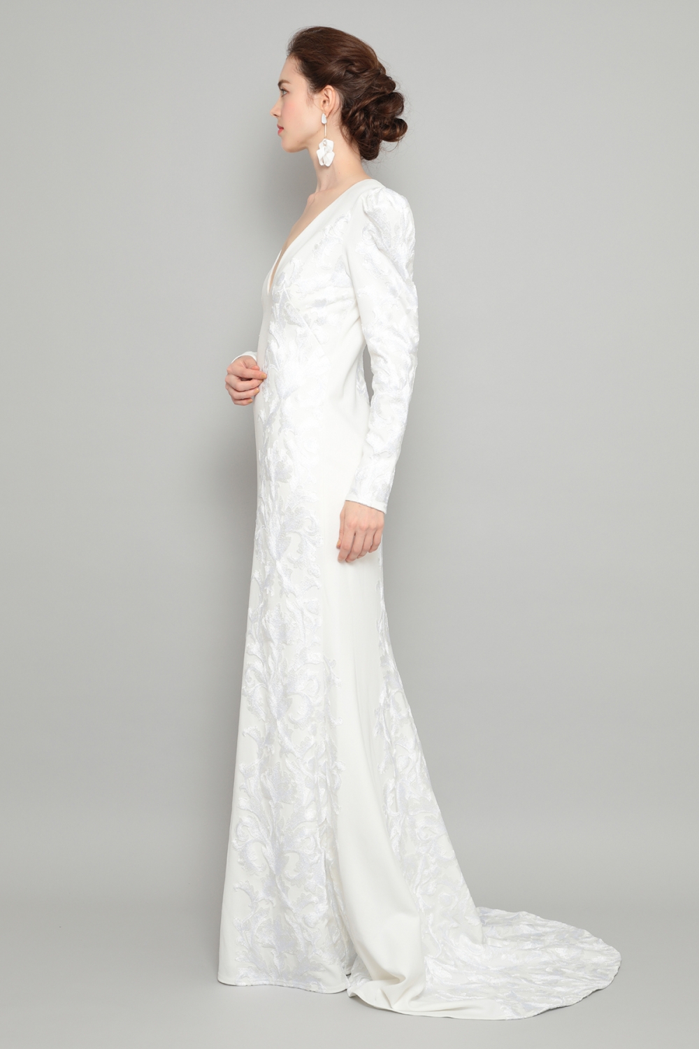 フォーマルでラグジュアリーな印象のブライダルドレス。深めのVネックラインが胸元を美しく演出し、女性らしさを引き立てます。パフスリーブがクラシックな雰囲気を醸し出し、長めのトレーンが後姿に存在感を与えます。シンプルながらも、ディテールにこだわったデザインがエレガンスを強調しています。