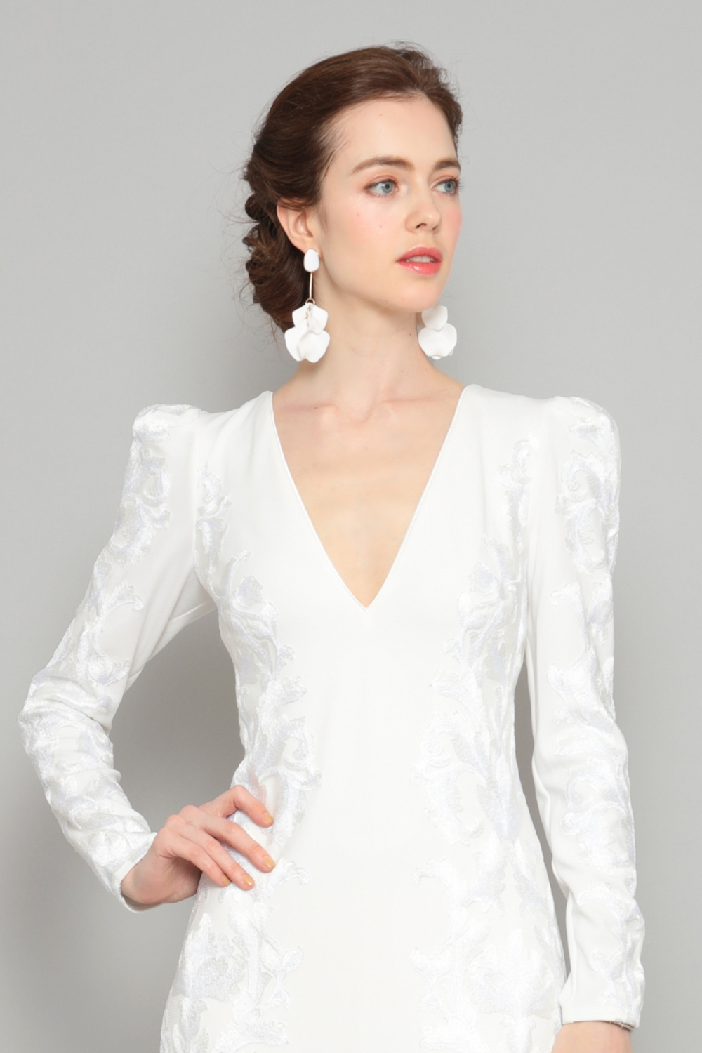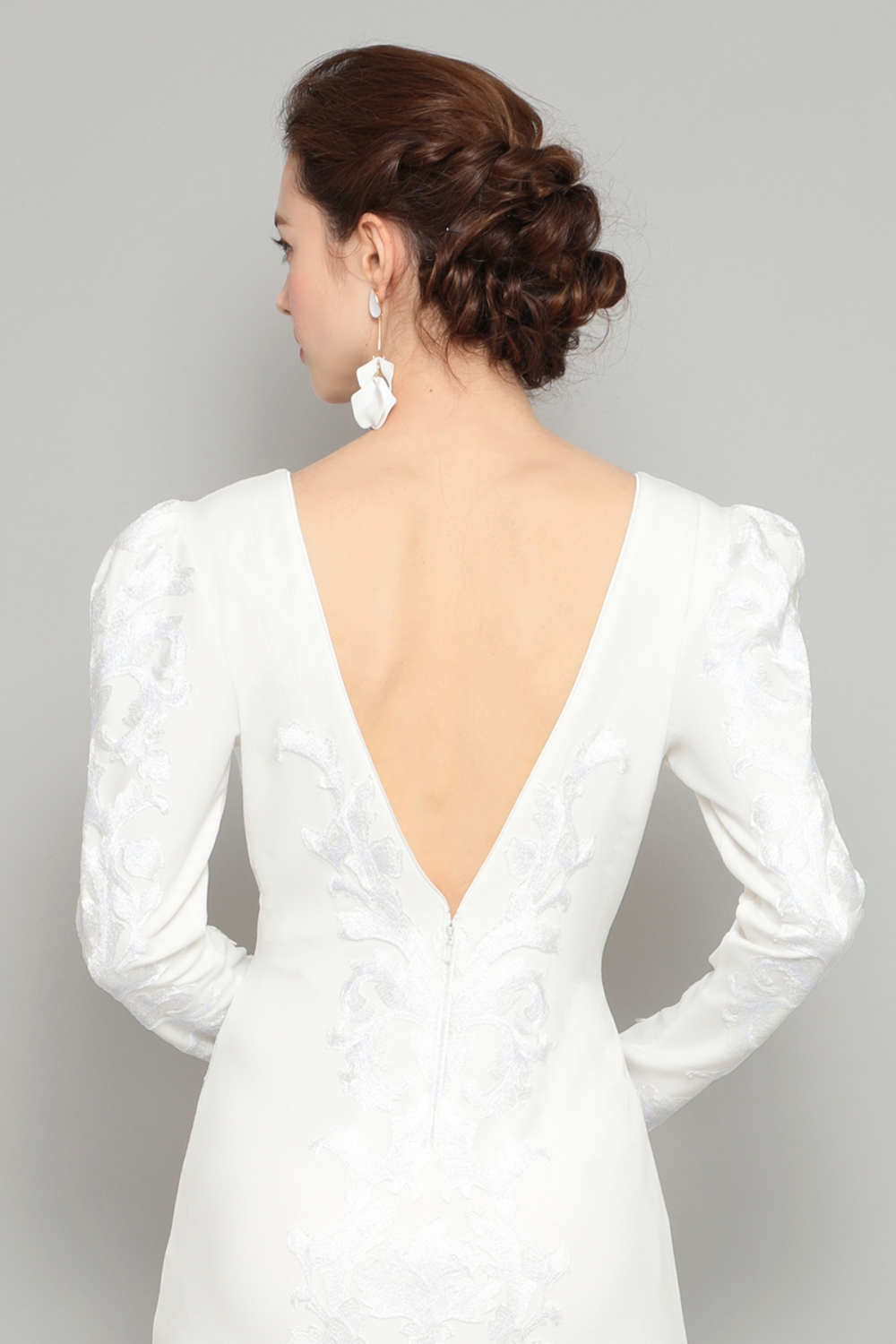 フォーマルでラグジュアリーな印象のブライダルドレス。深めのVネックラインが胸元を美しく演出し、女性らしさを引き立てます。パフスリーブがクラシックな雰囲気を醸し出し、長めのトレーンが後姿に存在感を与えます。シンプルながらも、ディテールにこだわったデザインがエレガンスを強調しています。 モデルサイズ 身長175cm B:84cm W:59cm H:89cm /サイズ2着用 ■新作商品一覧はこちら■ □ロングドレス一覧はこちら□ ■ブライダル商品一覧はこちら■ □アイボリーの商品一覧はこちら□