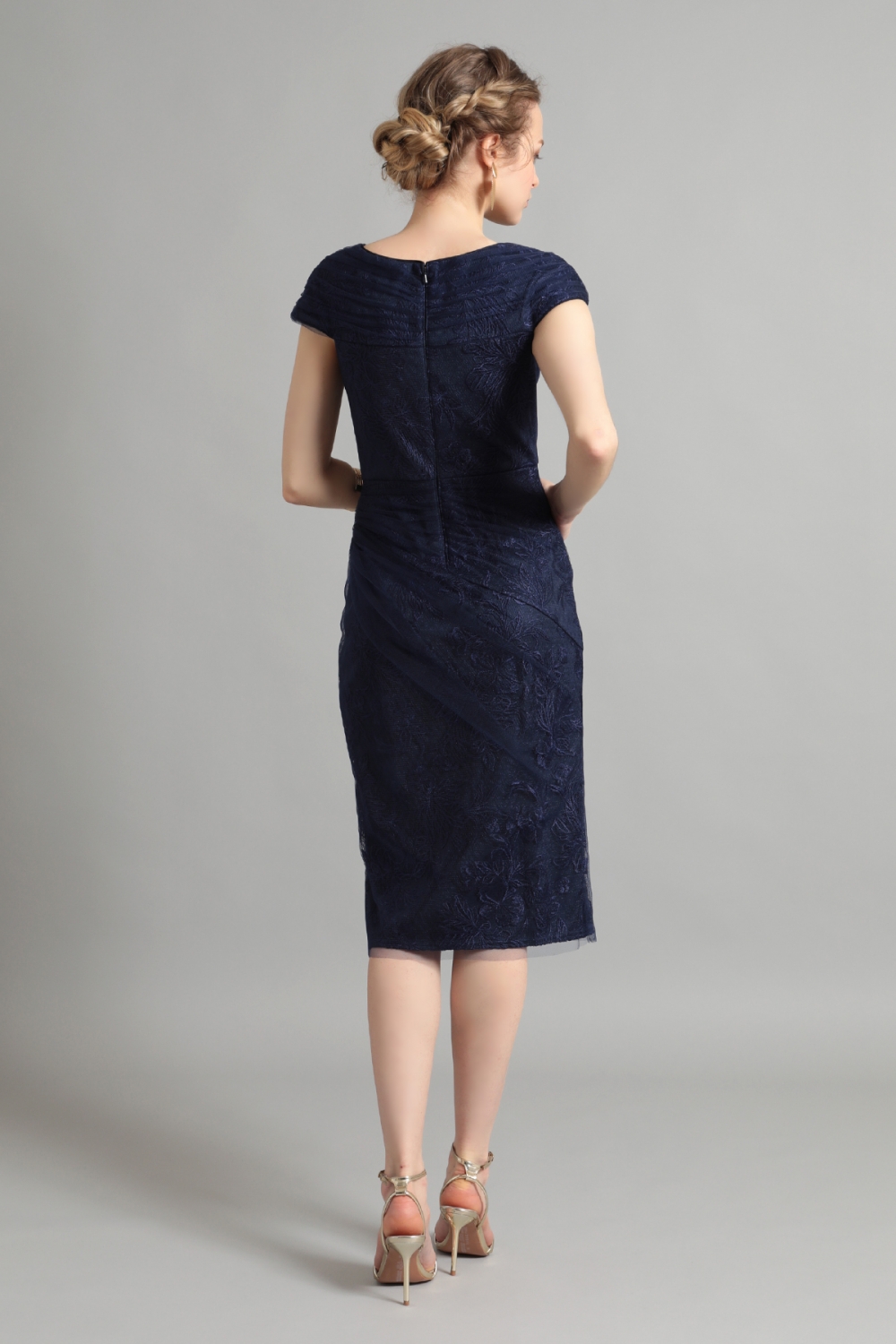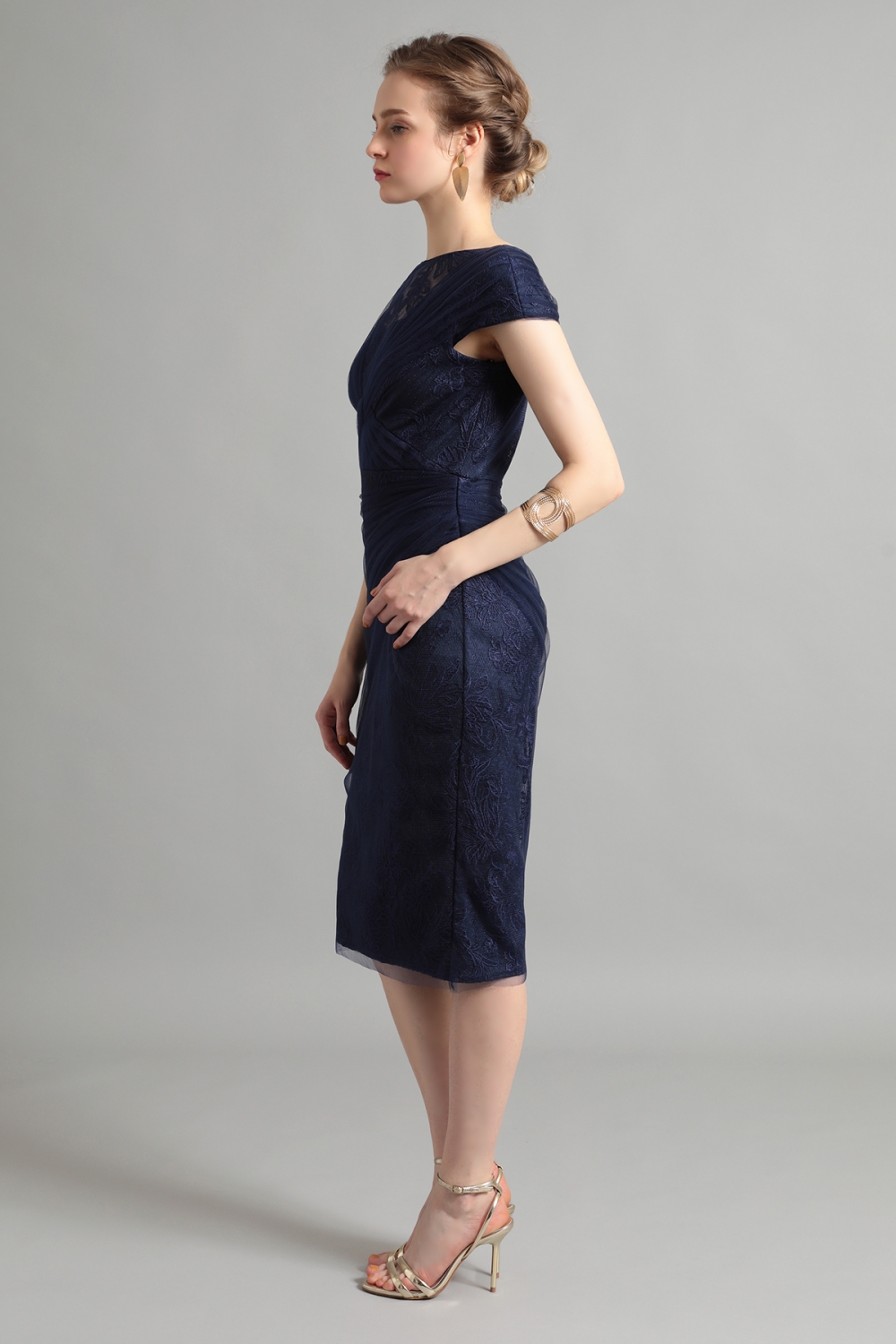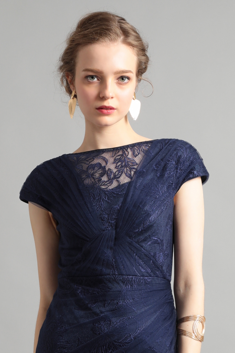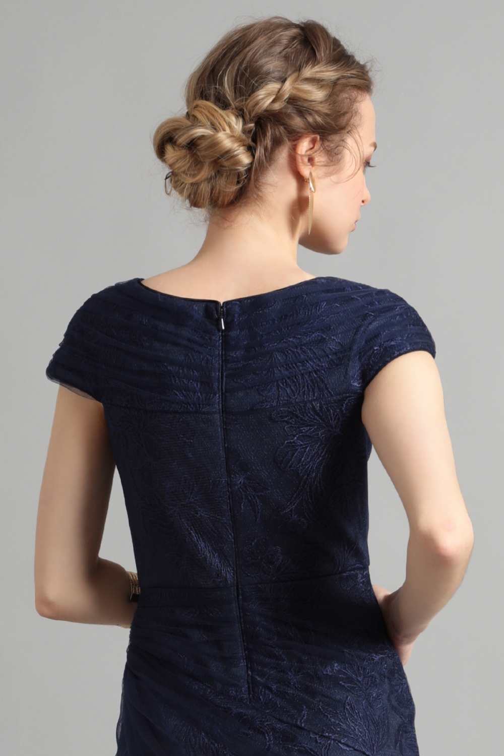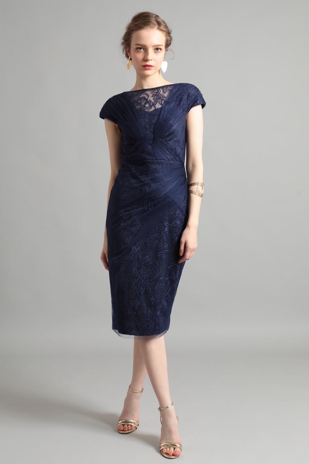 繊細なボタニカル刺繍レースにチュールを重ね合わせた、上品でフェミニンな印象のミディアムドレス。短めのキャップスリーブに、シースルーの胸元、ボディラインに沿ったデザインが女性らしいシルエットを際立たせています。シンプルなシルエットですが、トップにはチュールをツイストし、スカート部分にはドレーピングして重ねることで華やかさを演出します。パーティーやフォーマルな場面はもちろん、コンサートや観劇にもオールマイティーに活躍する一着です。 モデルサイズ 身長170cm B:81cm W:58cm H:87cm /サイズ0着用 ■新作商品一覧はこちら■ □ミディアムドレス一覧はこちら□ ■ネイビーの商品一覧はこちら■