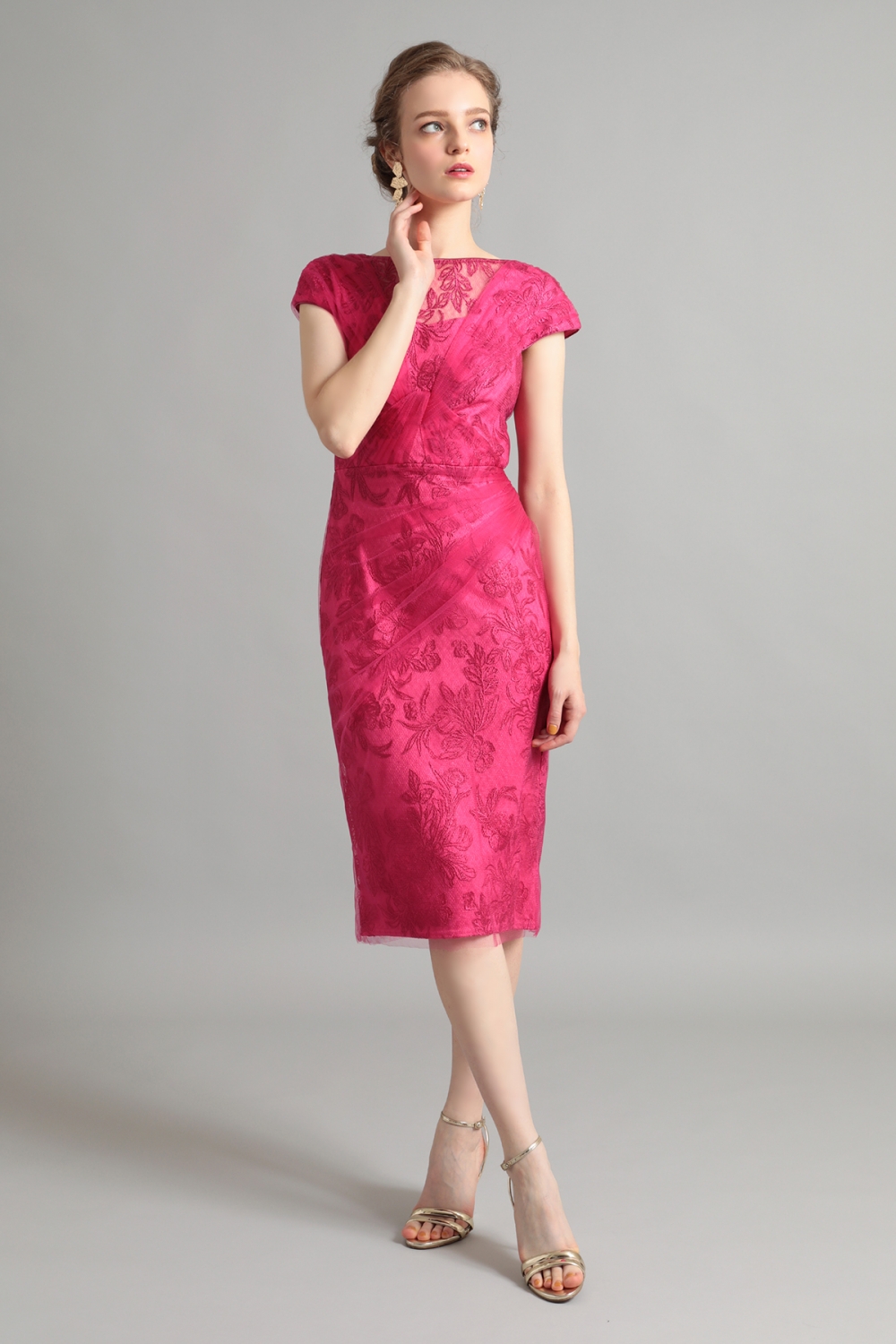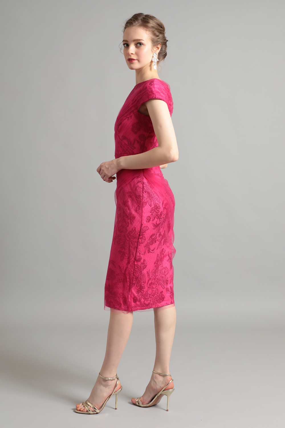 繊細なボタニカル刺繍レースにチュールを重ね合わせた、上品でフェミニンな印象のミディアムドレス。短めのキャップスリーブに、シースルーの胸元、ボディラインに沿ったデザインが女性らしいシルエットを際立たせています。シンプルなシルエットですが、トップにはチュールをツイストし、スカート部分にはドレーピングして重ねることで華やかさを演出します。パーティーやフォーマルな場面はもちろん、コンサートや観劇にもオールマイティーに活躍する一着です。 モデルサイズ 身長170cm B:81cm W:58cm H:87cm /サイズ0着用 ■新作商品一覧はこちら■ □ミディアムドレス一覧はこちら□ ■ピンクの商品一覧はこちら■
