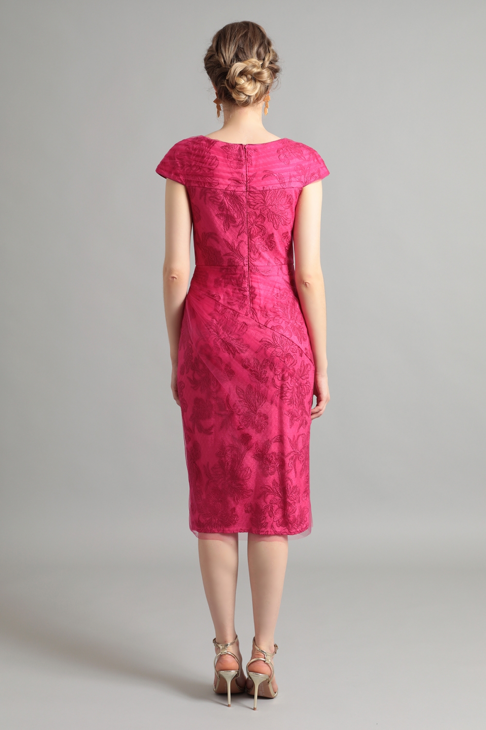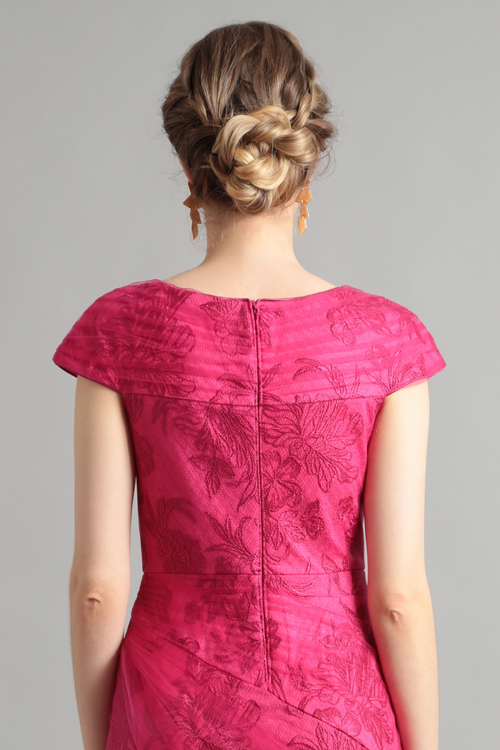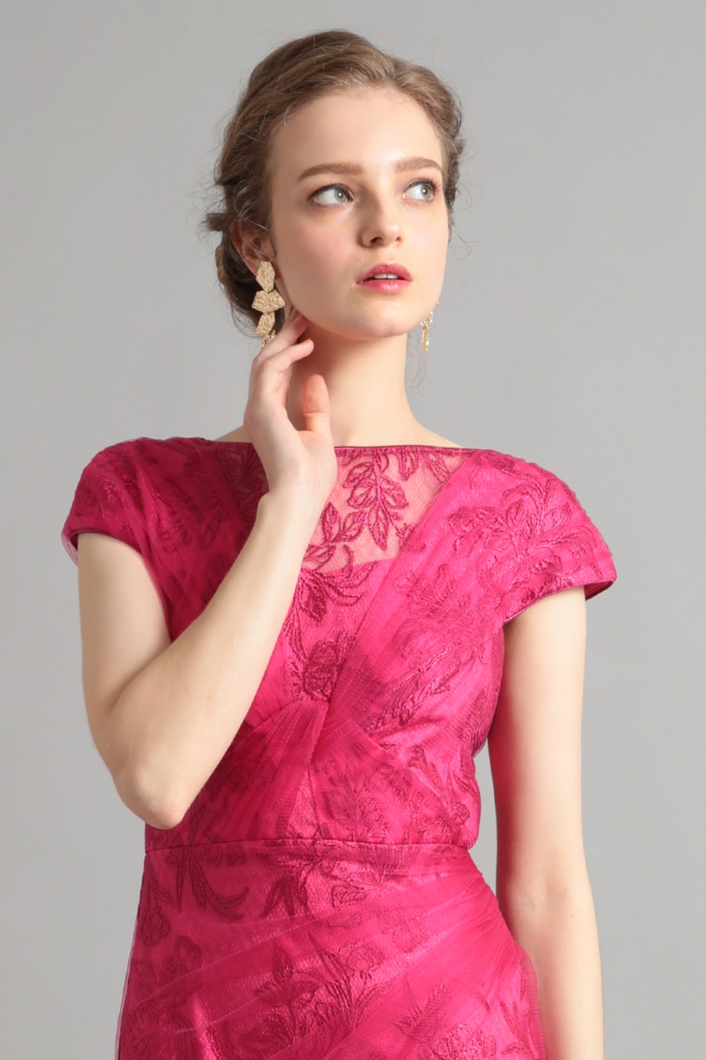 繊細なボタニカル刺繍レースにチュールを重ね合わせた、上品でフェミニンな印象のミディアムドレス。短めのキャップスリーブに、シースルーの胸元、ボディラインに沿ったデザインが女性らしいシルエットを際立たせています。シンプルなシルエットですが、トップにはチュールをツイストし、スカート部分にはドレーピングして重ねることで華やかさを演出します。パーティーやフォーマルな場面はもちろん、コンサートや観劇にもオールマイティーに活躍する一着です。