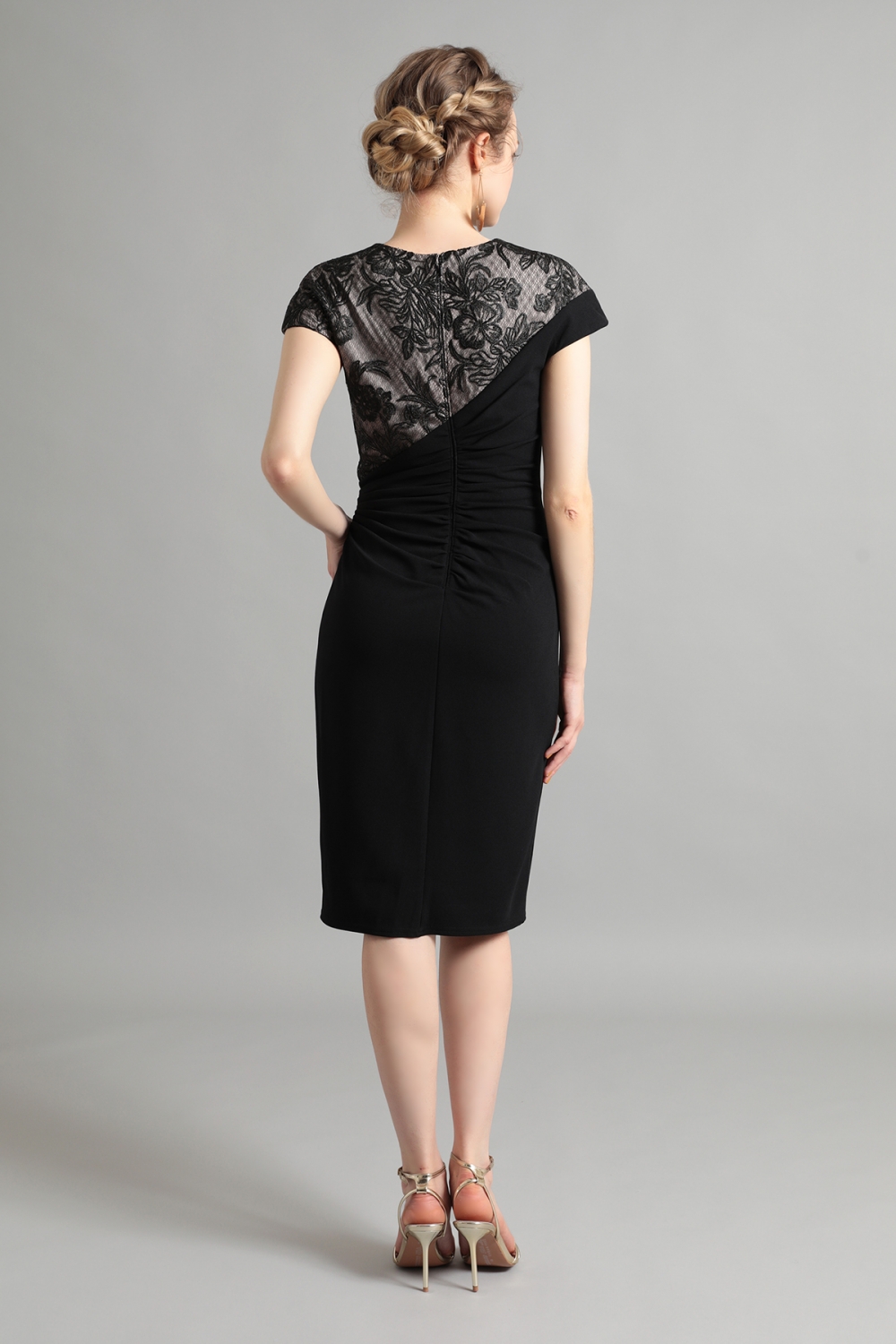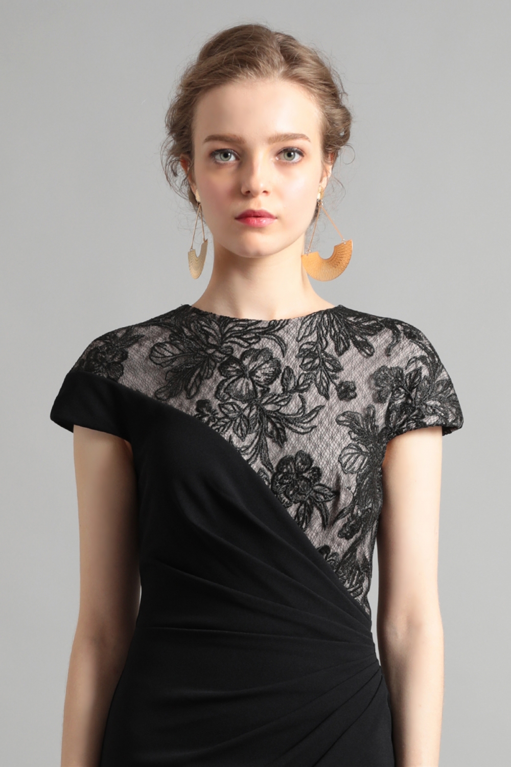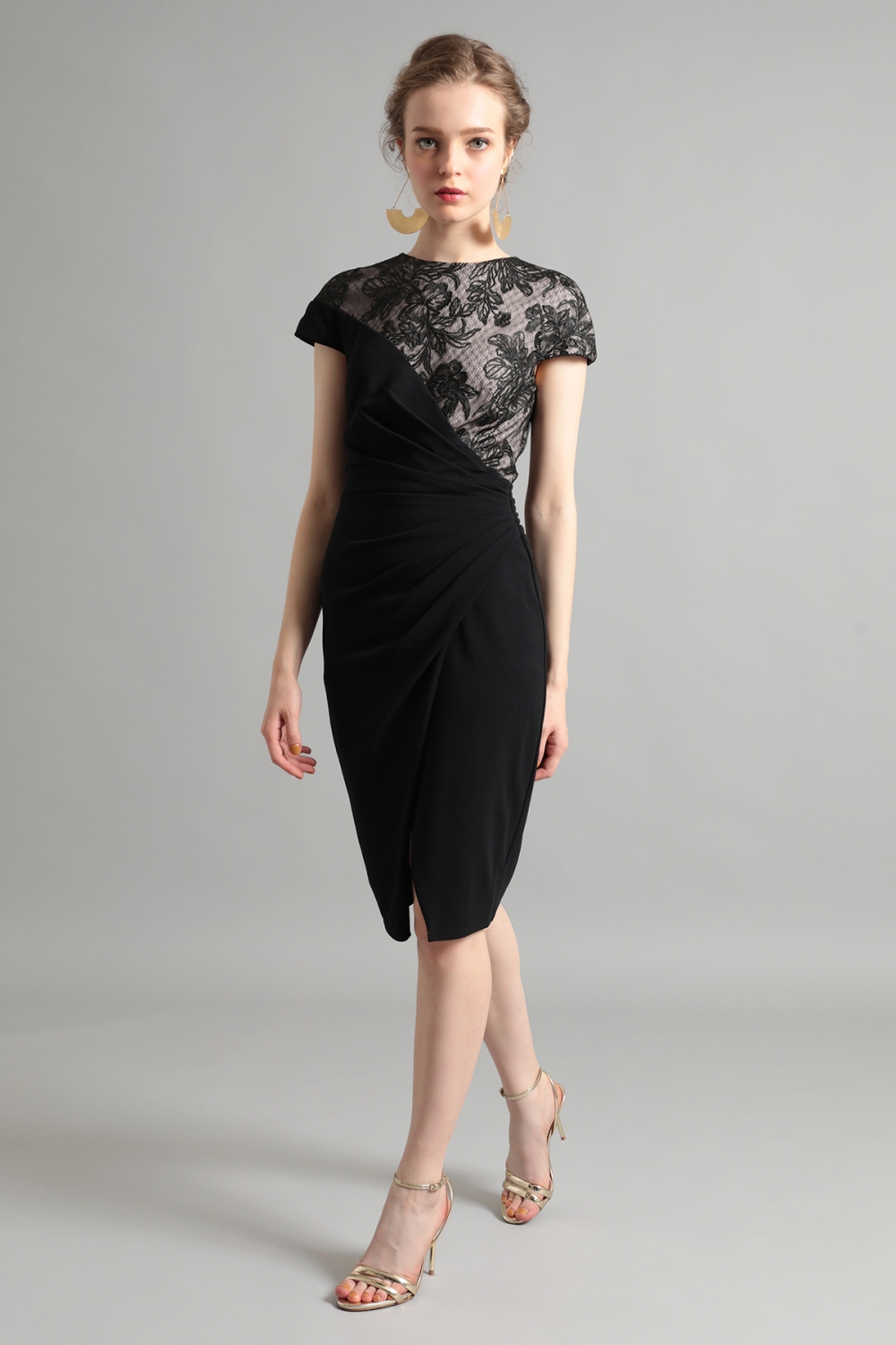 立体的なボタニカル刺繍レースとクレープジャージー生地のコンビネーションがスタイリッシュなミディアムドレス。ウェストに放射線状に入れられたドレープが、美しいラインを作り出します。ラップスタイルのスカートの生地が重なることで生まれる小さなスリットが、歩きやすさを確保すると同時に、過度に露出することなく、上品な印象を保ちます。