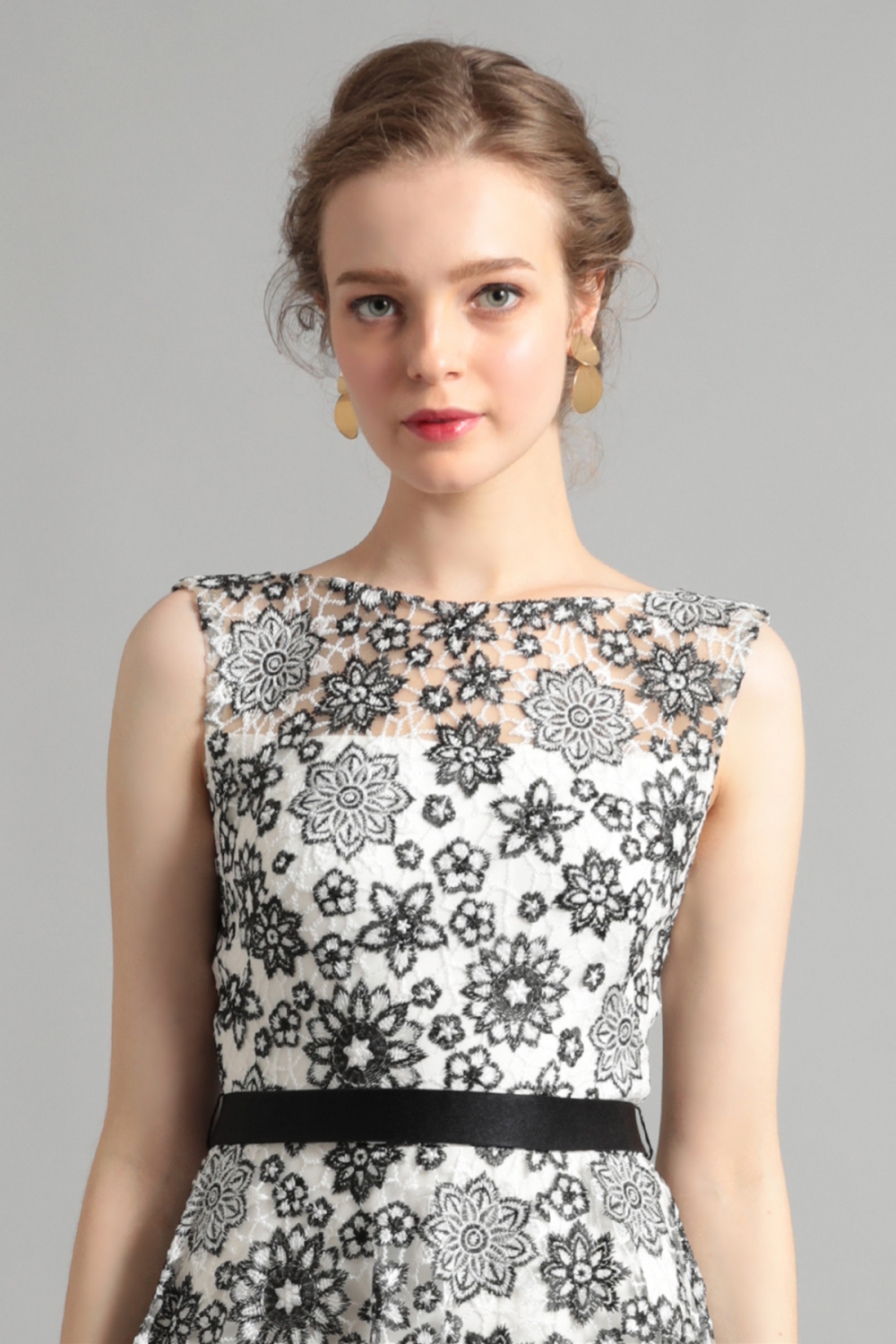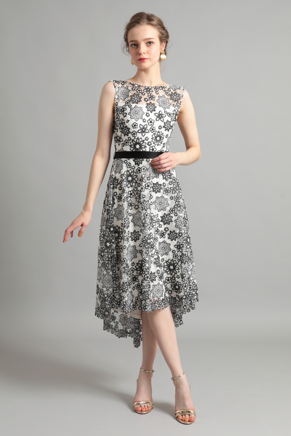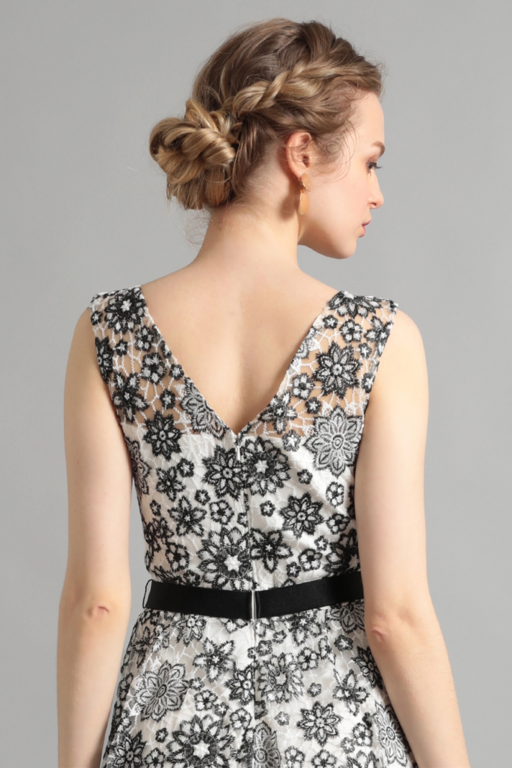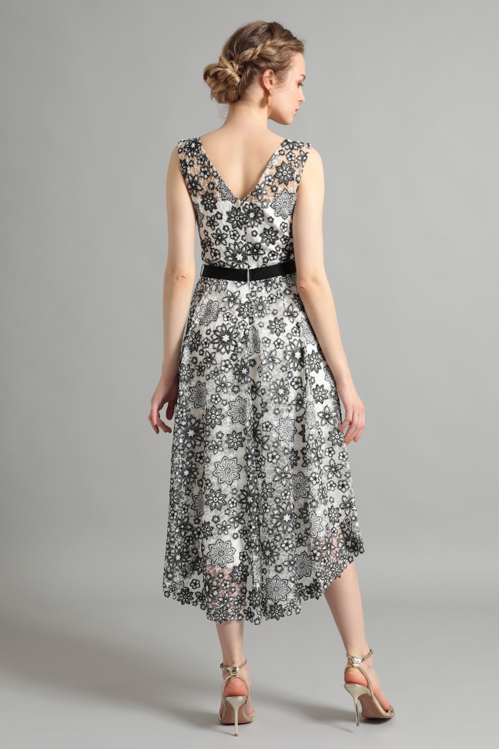 アイボリーの裏地にくっきりと浮かび上がるブラックのフローラルレースが印象的です。スタイリッシュなアイボリーブラックのコンビネーションが、幾何学模様にも見える花々で可憐な雰囲気を纏います。スカート部分は、フロントが少し短く、バックが長めのアシンメトリーなデザインで、動きに合わせてドレスが優雅に揺れるシルエットが魅力的です。Vに開いたバックのネックラインと長めのスカートで、後ろ姿も目を引く美しさです。