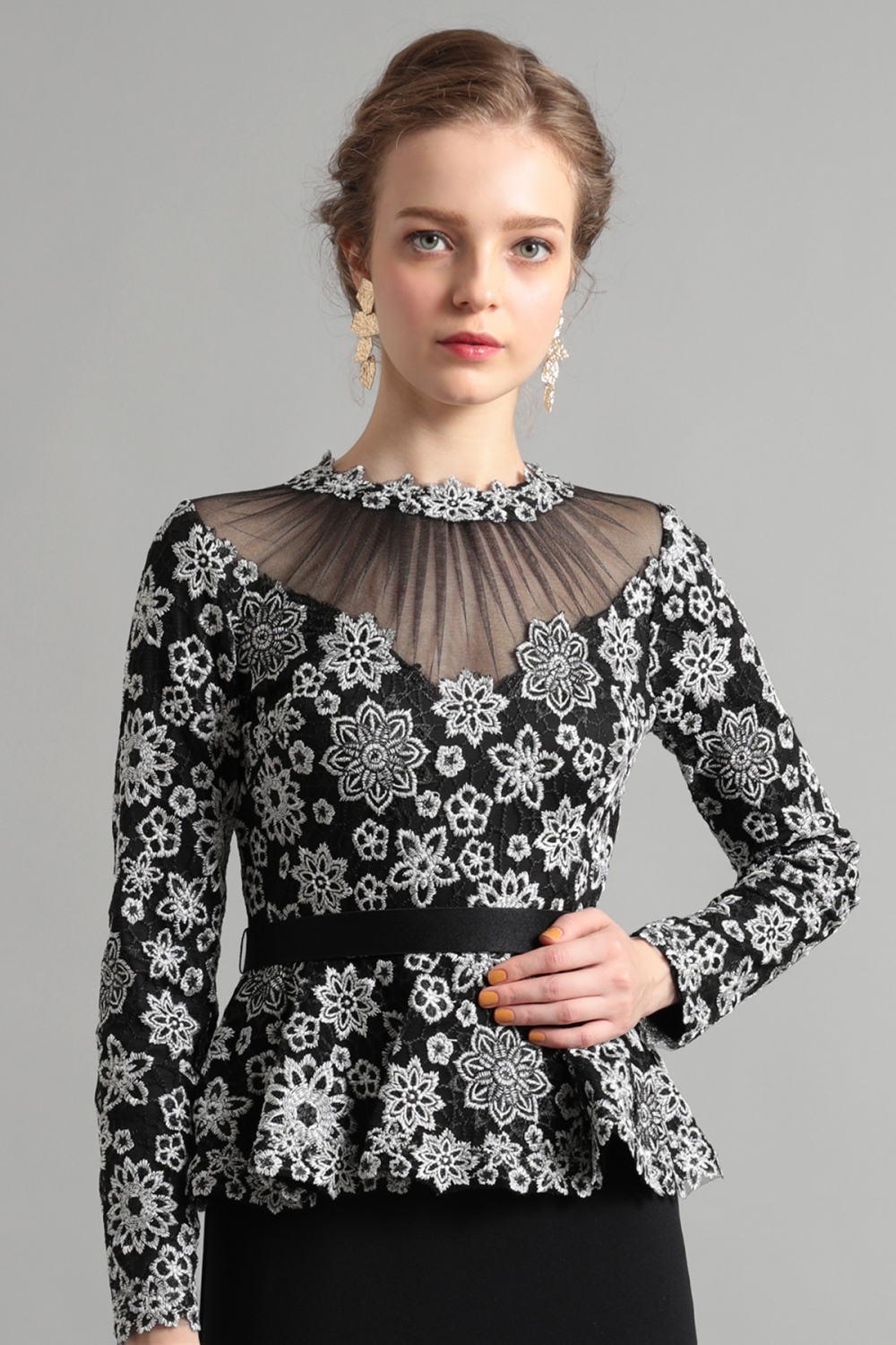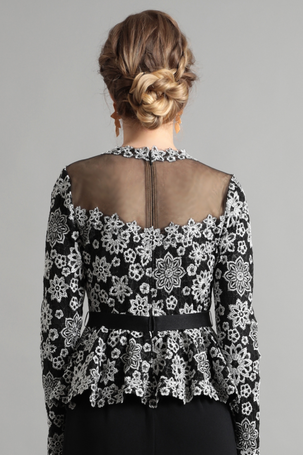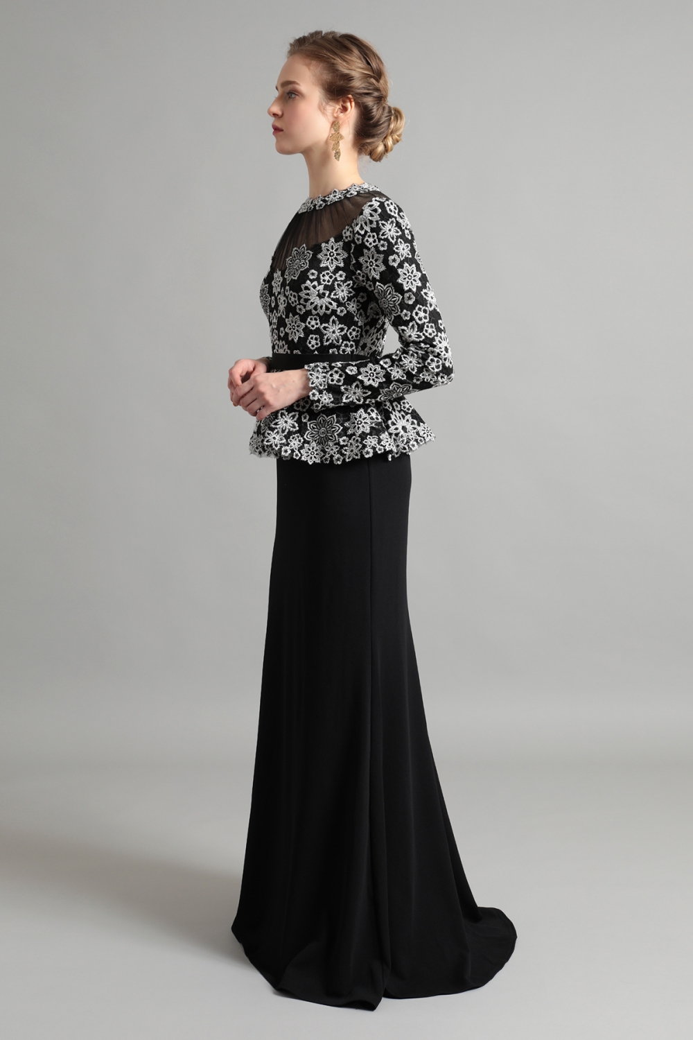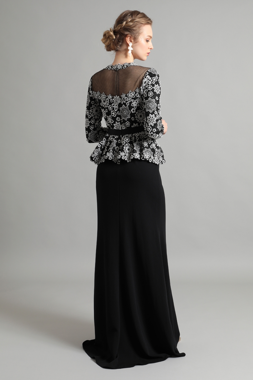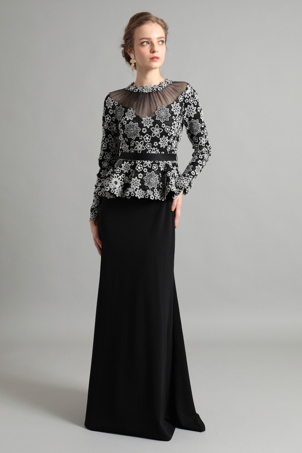 クラシカルなデザインのロングドレス。フローラルレースが美しいトップは長袖のペプラムスタイルで、上品さを演出します。胸元のチュールが重くなりがちな長袖のトップに軽やかな抜け感を作ります。華やかなレースに、流れるようなブラックのスカートで全体を引き締めます。フォーマルな場にふさわしい、気品ある一着です。