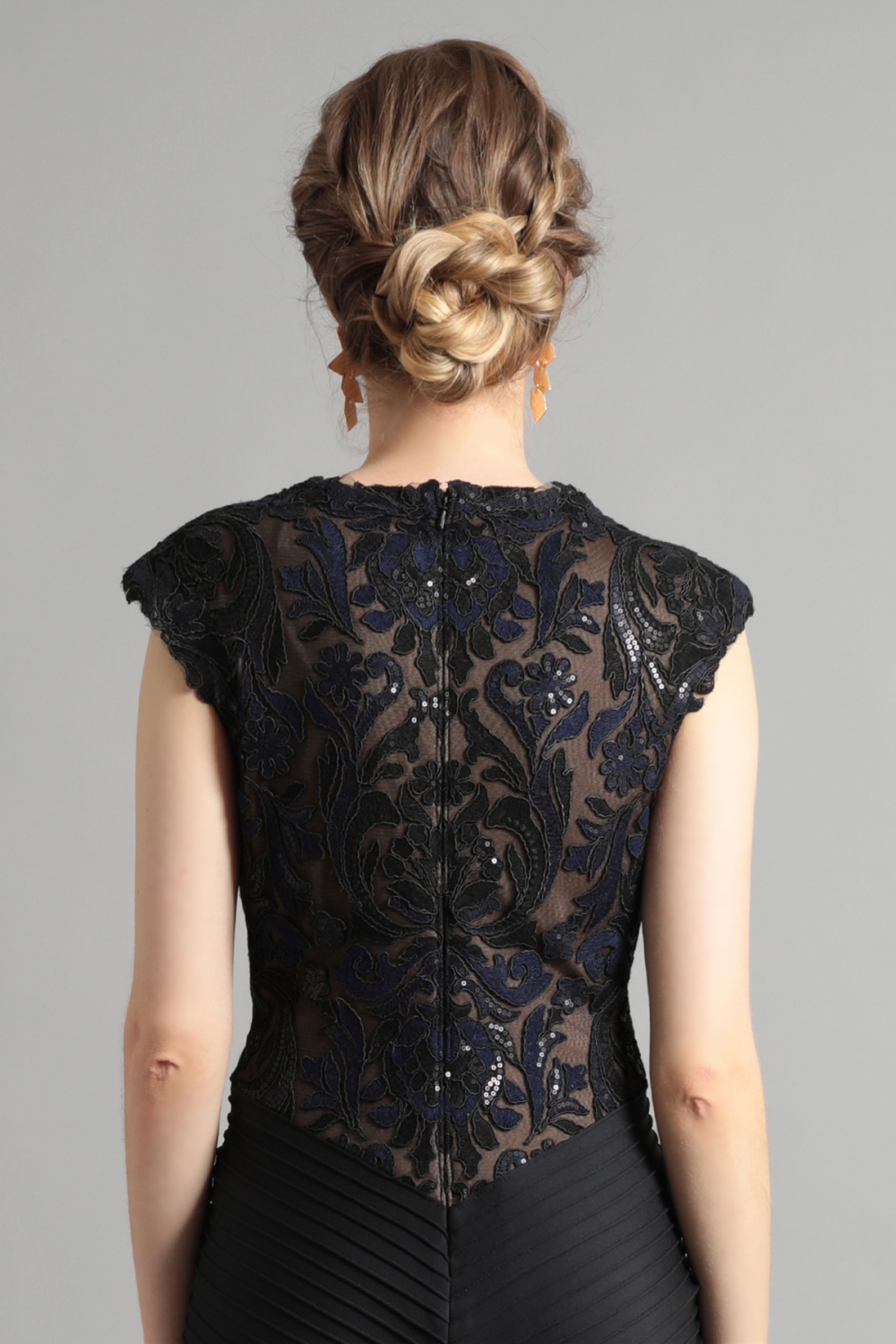 トップとヘムのボタニカル刺繍は、アーティスティックなパターンが特徴的なデザイン。フィッシュテールスカートが洗練された雰囲気です。キャップスリーブが、肩を程よくカバーし、シアーなヘムパートが軽やかさを演出します。クラシカルなAラインドレスにモダンなエッセンスを盛り込んだドレスです。