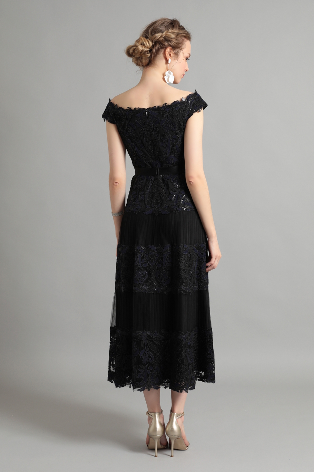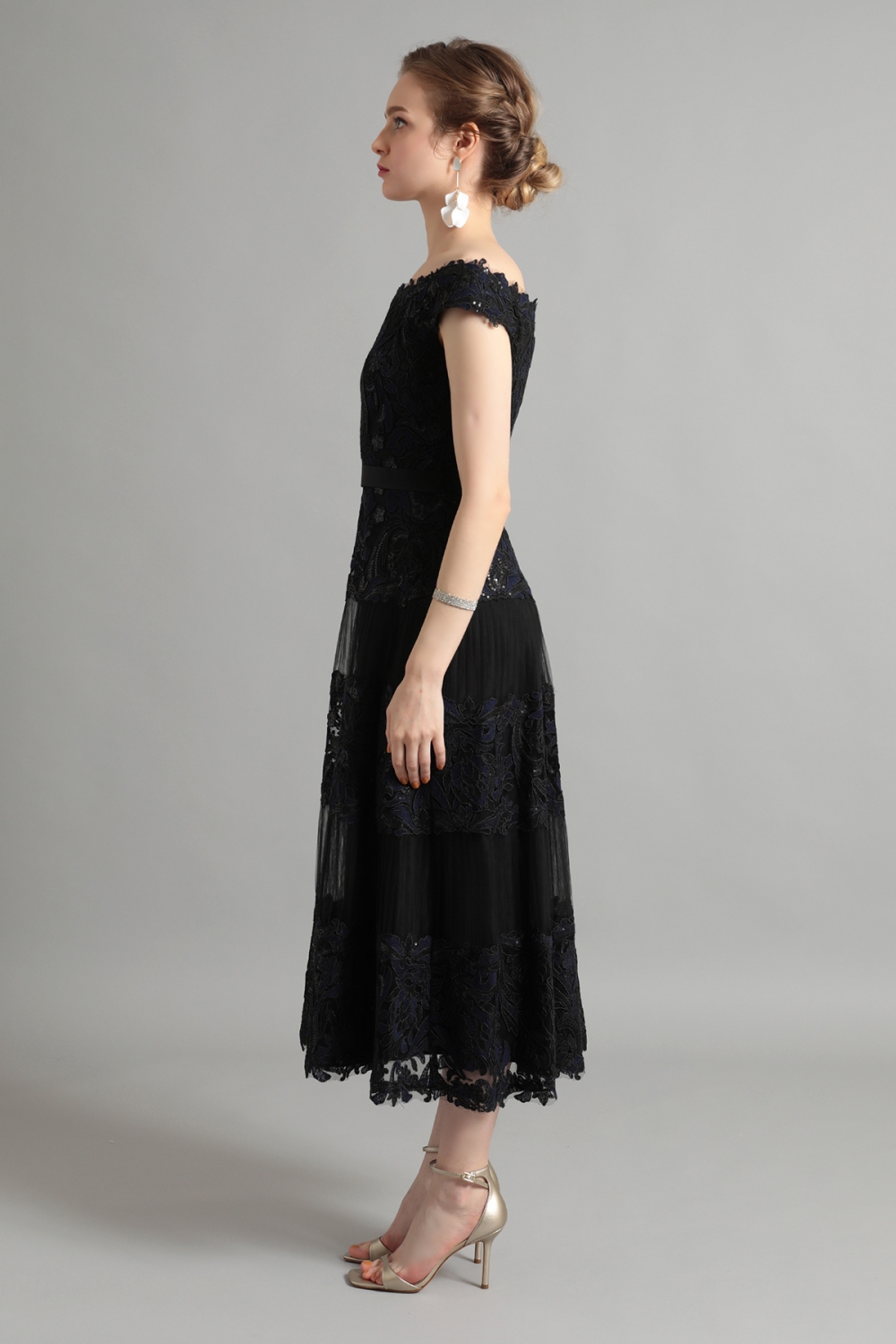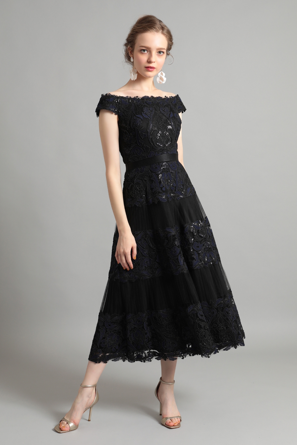 ボタニカルレースにスパンコール刺繍がきらめく、美しいミモレ丈ドレス。
