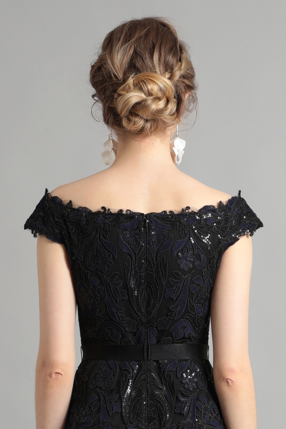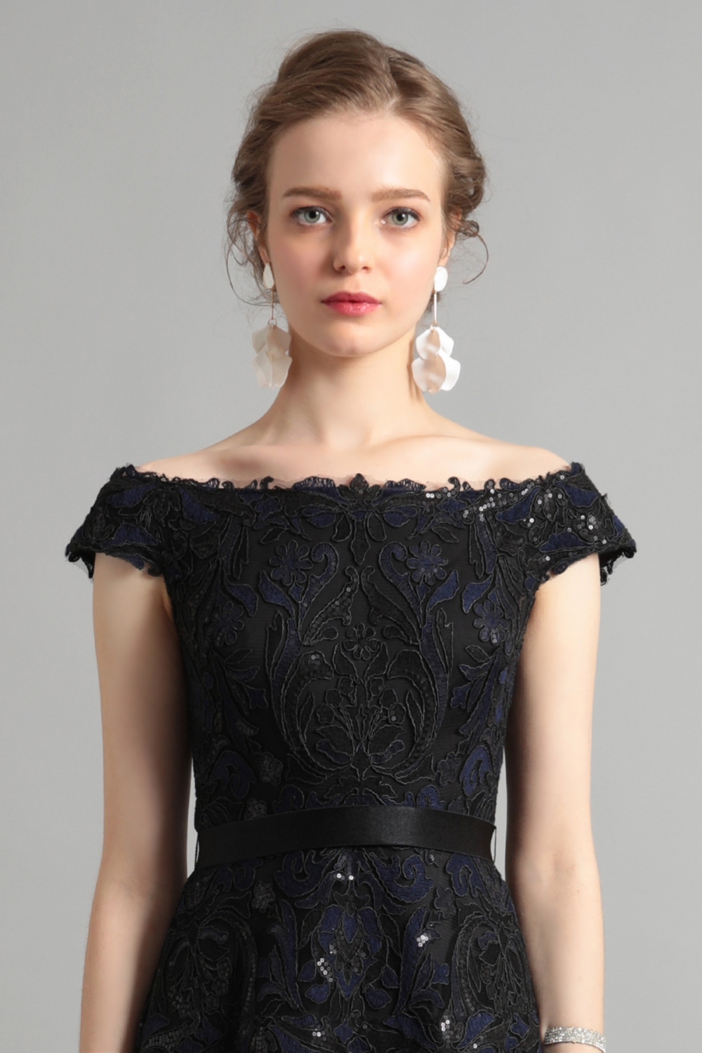 立体感のあるコードレースは抽象的な花を描き、オフショルダーと合わせエレガントな雰囲気に。